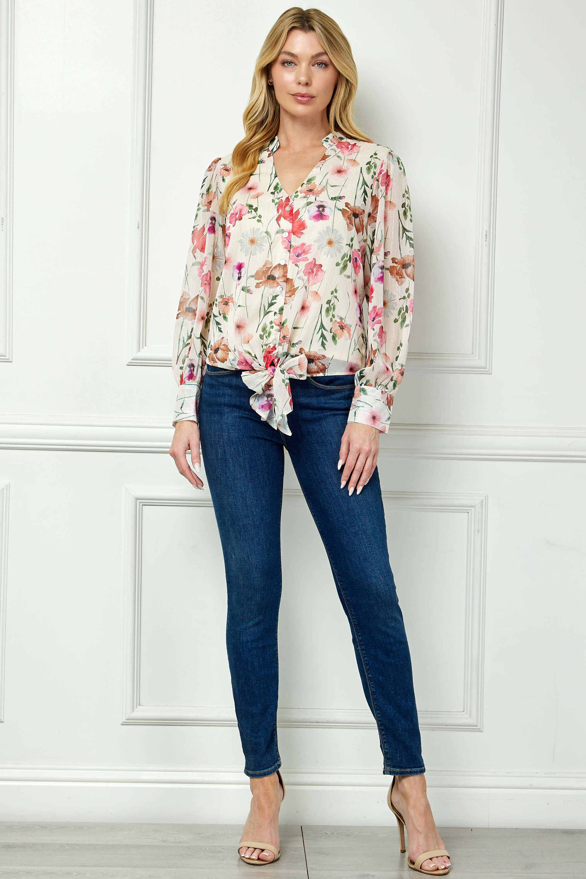 Long Cuff Sleeve V-Neck Button Front Tie Blouse in Beige