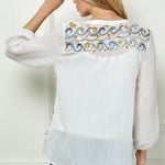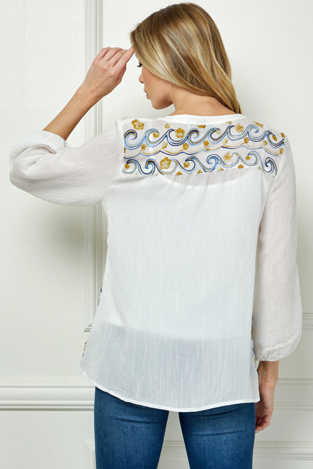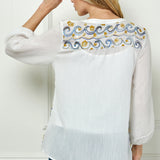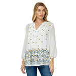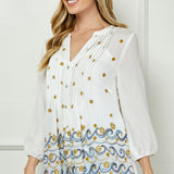 This long sleeve yoke neck top with printed boarder adds an elegant twist on a classic look. This top is ready to wear and can be dressed up or down.