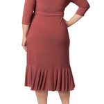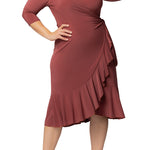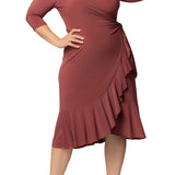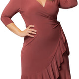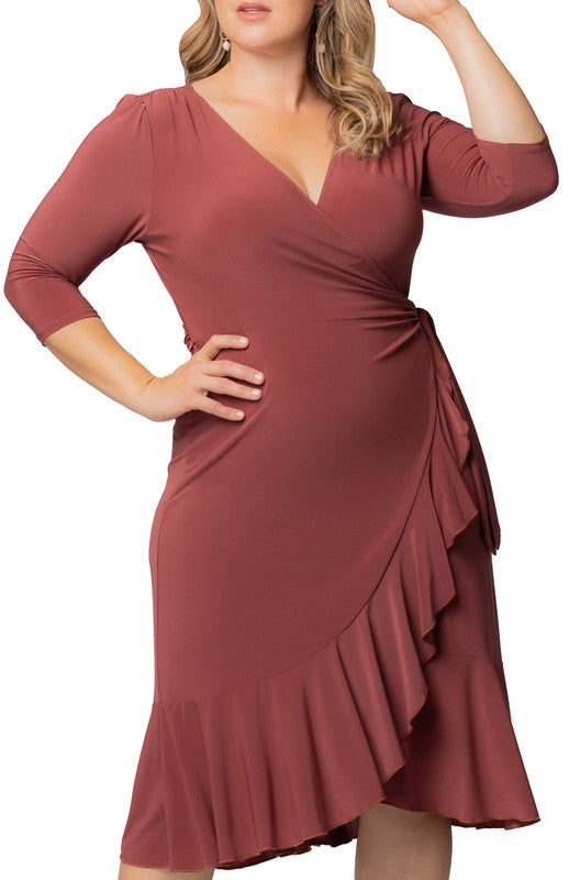 The Whimsy Ruffled Midi Wrap Dress features cascading flounces on the skirt and bottom hem. This functional wrap provides adjustable coverage and flattering 3/4 length sleeves. Perfect for cocktail and special occasions, work, and as a wedding guest dress. Available in both regular and plus sizes.