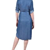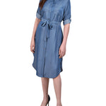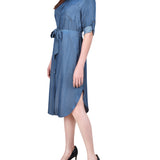 Be daring in denim in this button down midi length dress, which has roll tab sleeves, t-shirt hem, and a tie waist for a put together look.