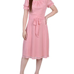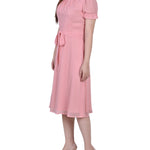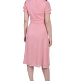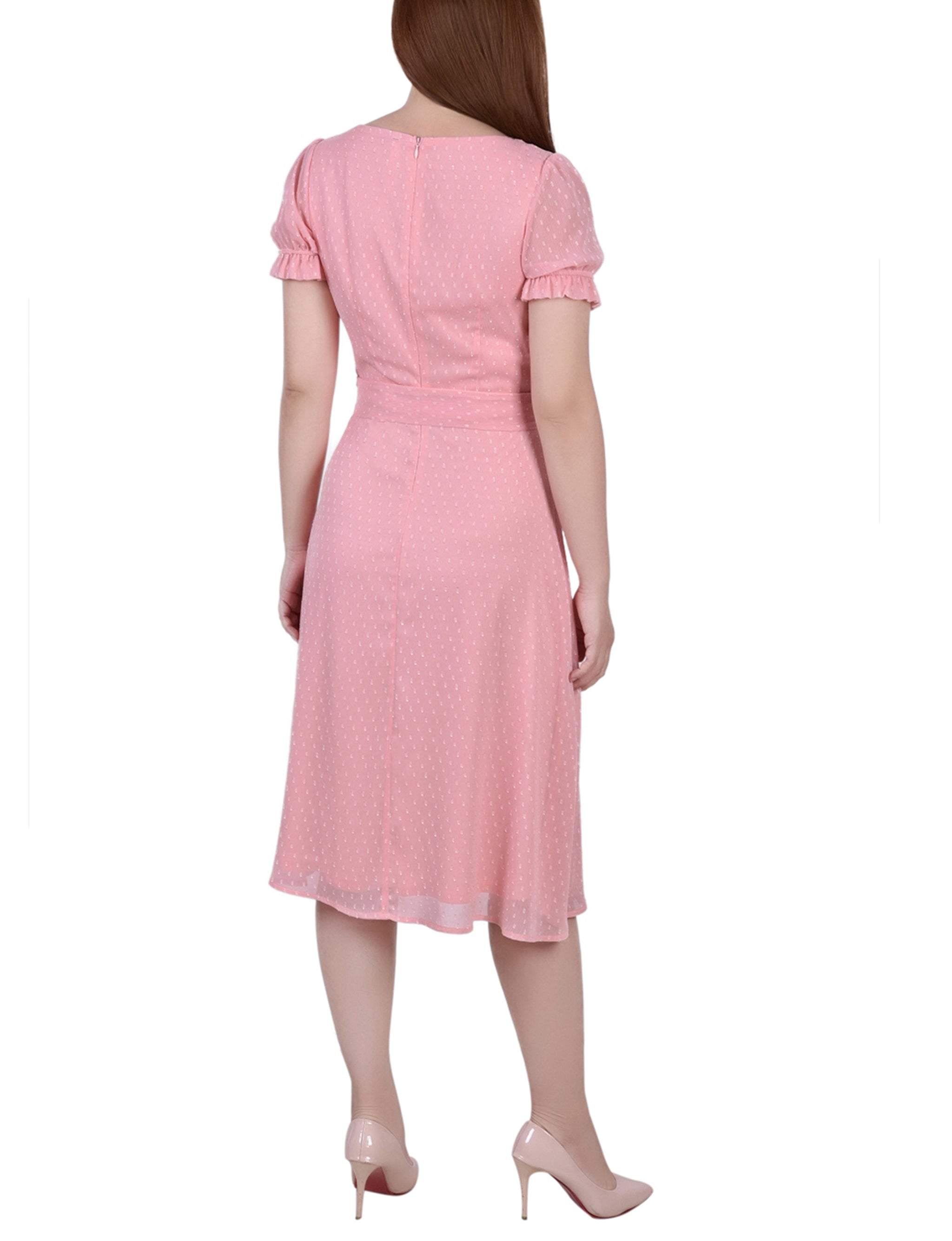 This sweet and simple swiss dot dress, with a tie waist and rouched sleeves, makes for the perfect special occasion dress.