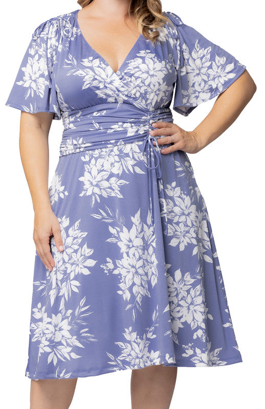 Transition seamlessly from day to night with the Plus Size Jemma Ruched Tie Dress. This elegant knee-length dress features a flattering surplice V neckline and elbow-length flutter sleeves, perfect for work events and dinner dates. Adjustable drawstring tie details at the waistband and shoulders allow for customizable ruching, ensuring a flattering fit that highlights your curves.