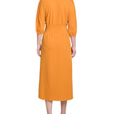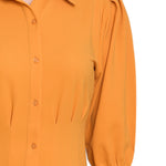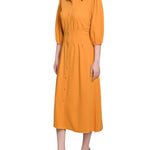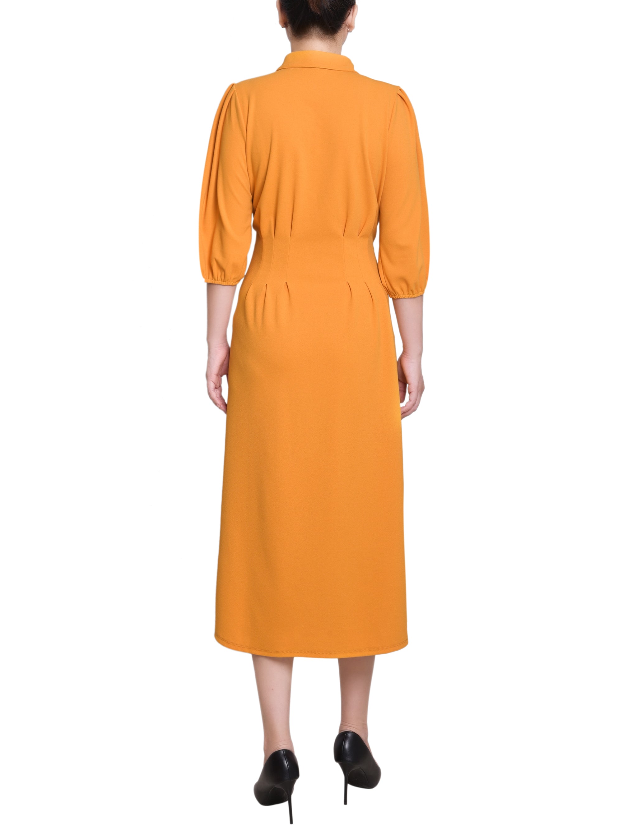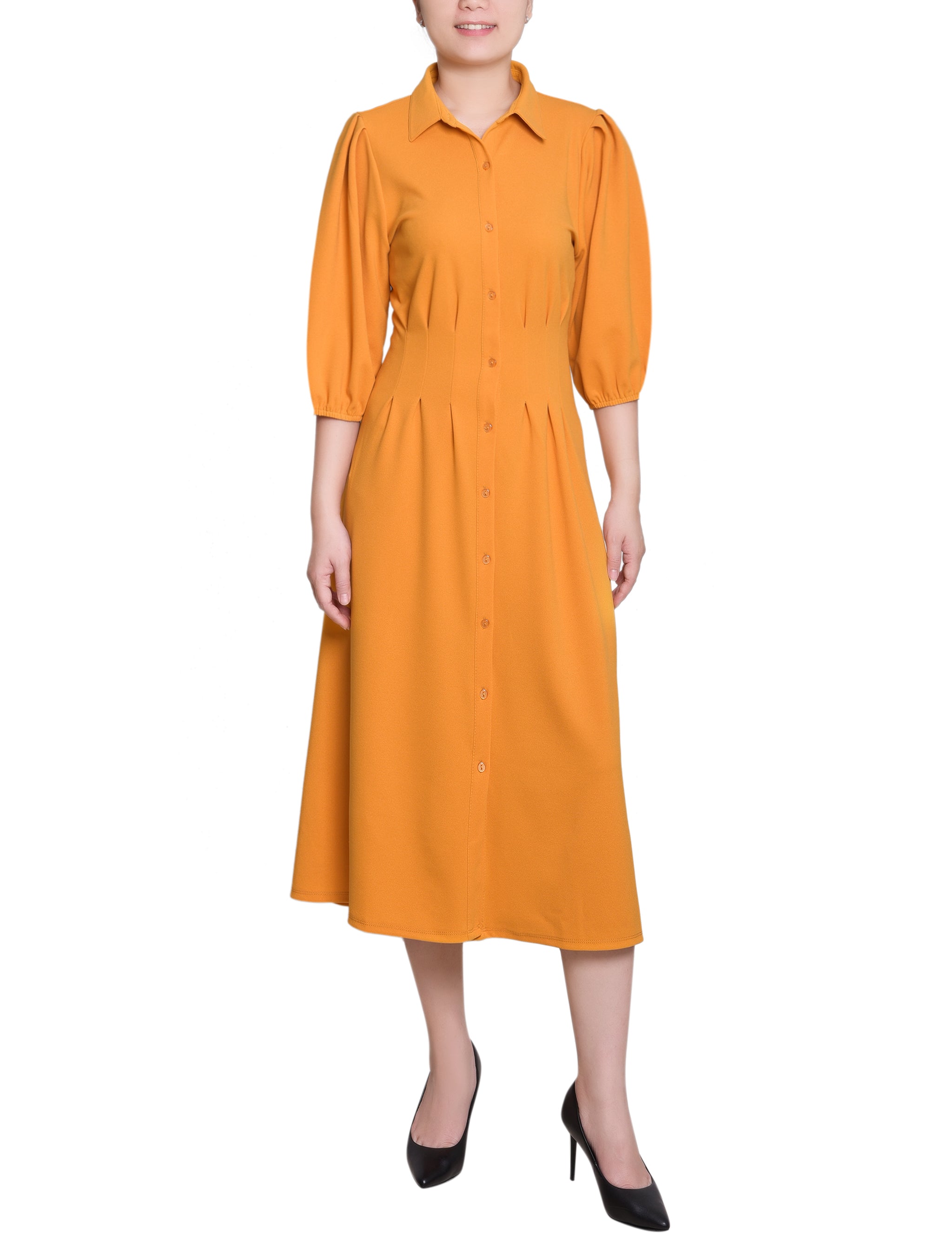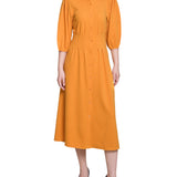 This midi shirt dress features elbow-length puff sleeves, a classic collar, and button-down front. Cinched waist offers a flattering silhouette.
