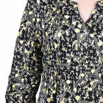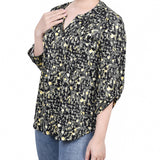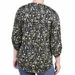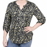 Navy Gold Damask 3/4 Roll Tab Sleeve Y Neck Top - Petite