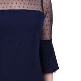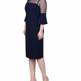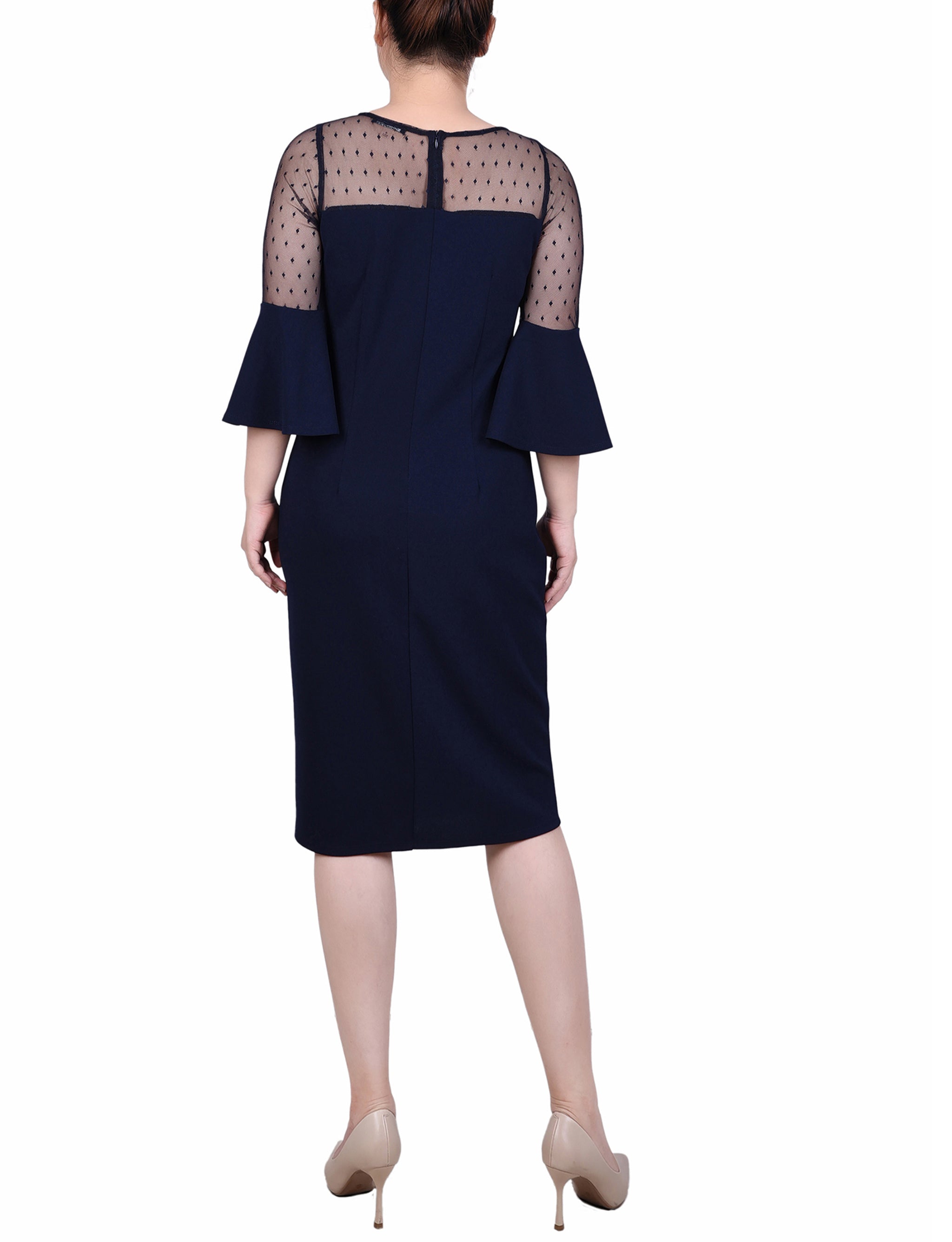 Get ready for your special evening in this illusion neck and sleeve dress. The bell sleeves add extra drama.