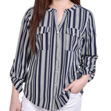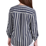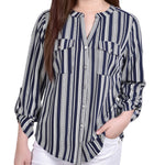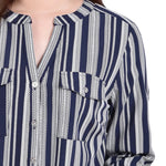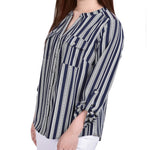 Navy White Stripe 3/4 Roll Tab Sleeve Mandarin Collar Blouse - Petite