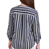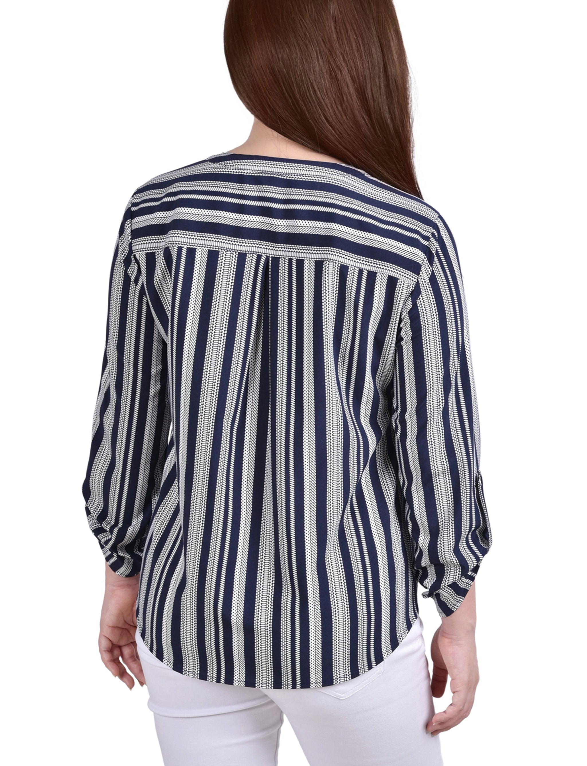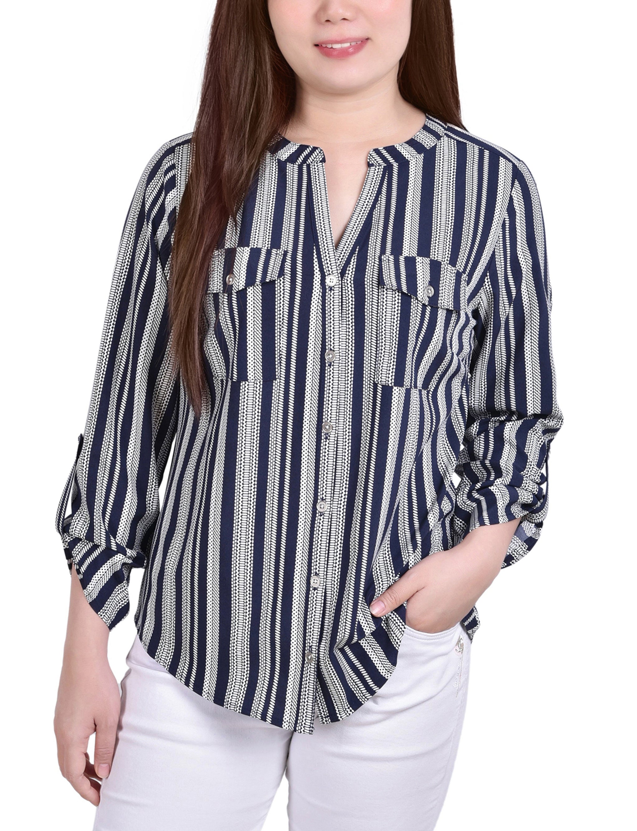 Navy White Stripe 3/4 Roll Tab Sleeve Mandarin Collar Blouse - Petite – Dressbarn
