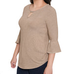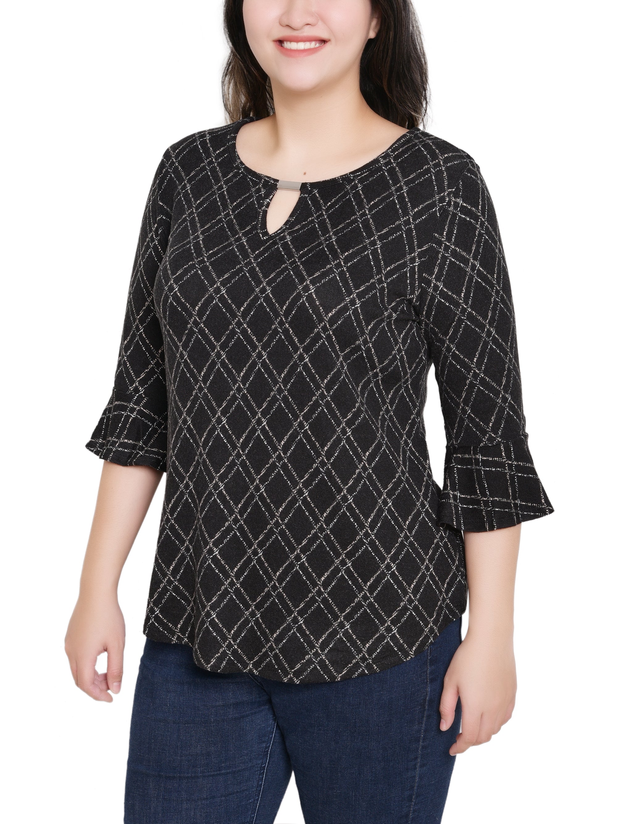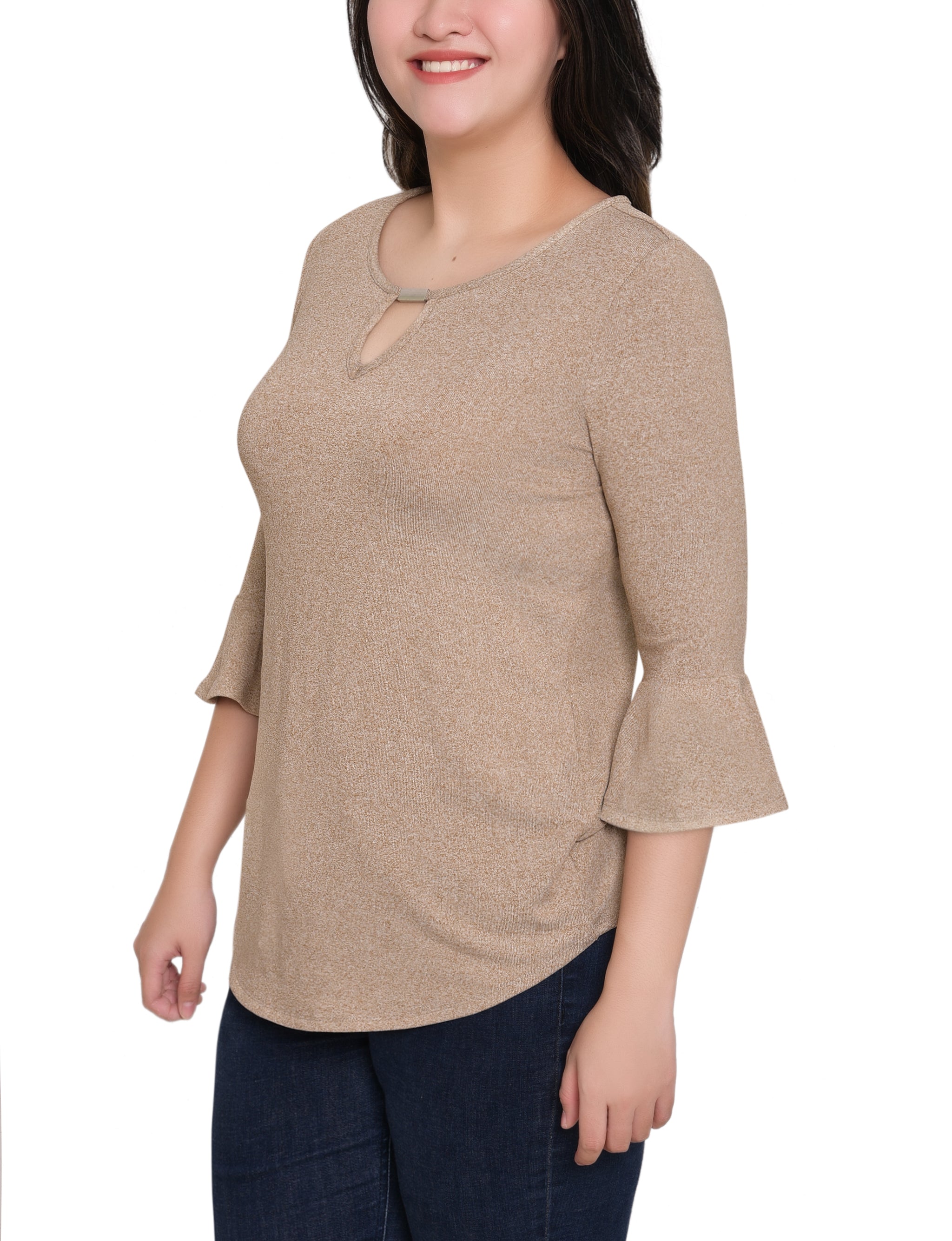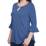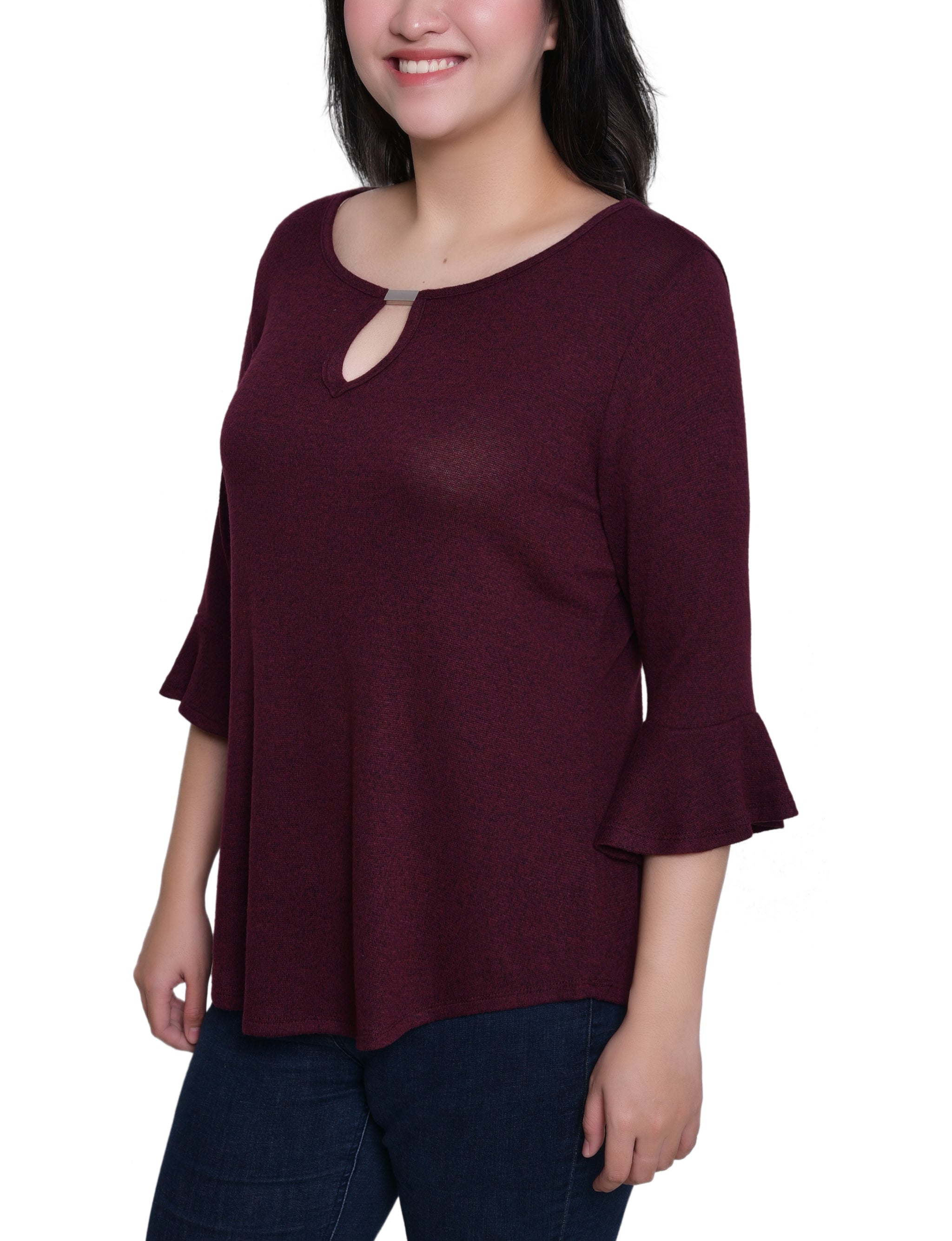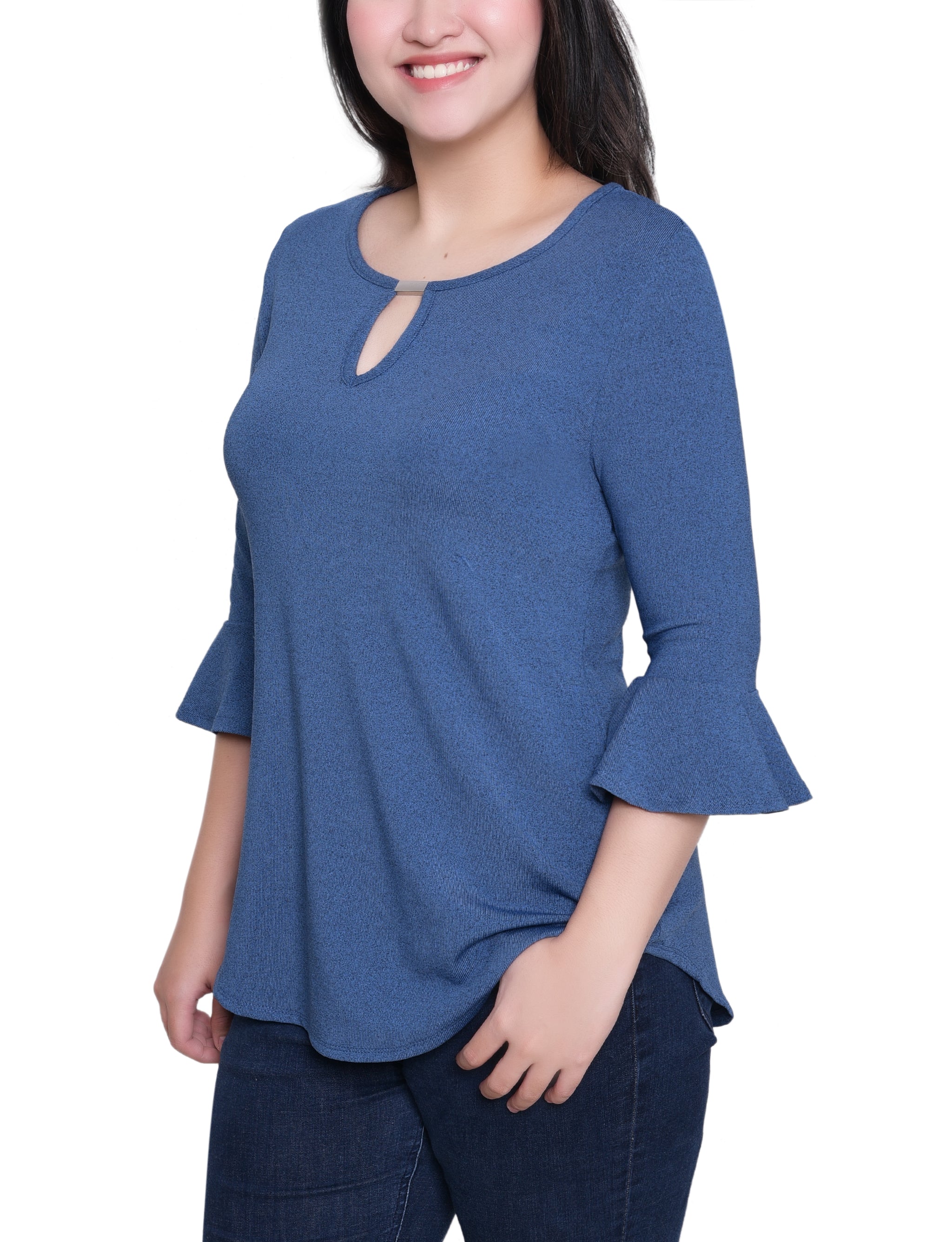 Effortless and easy to wear, this NY Collection knit top features a relaxed silhouette with a keyhole neckline and flounced 3/4 sleeves for a touch of feminine flair. Perfect for casual days or dressed-up comfort.