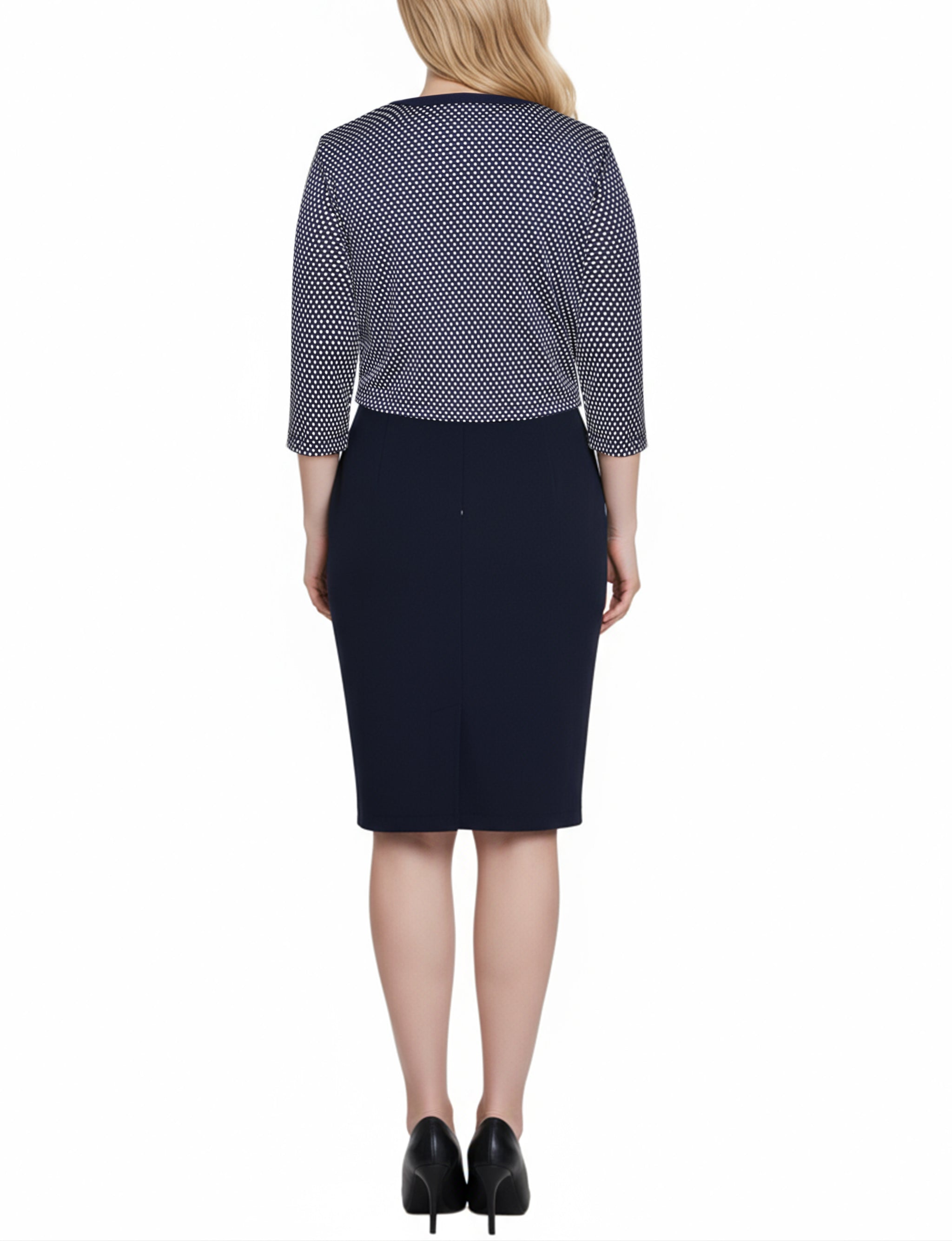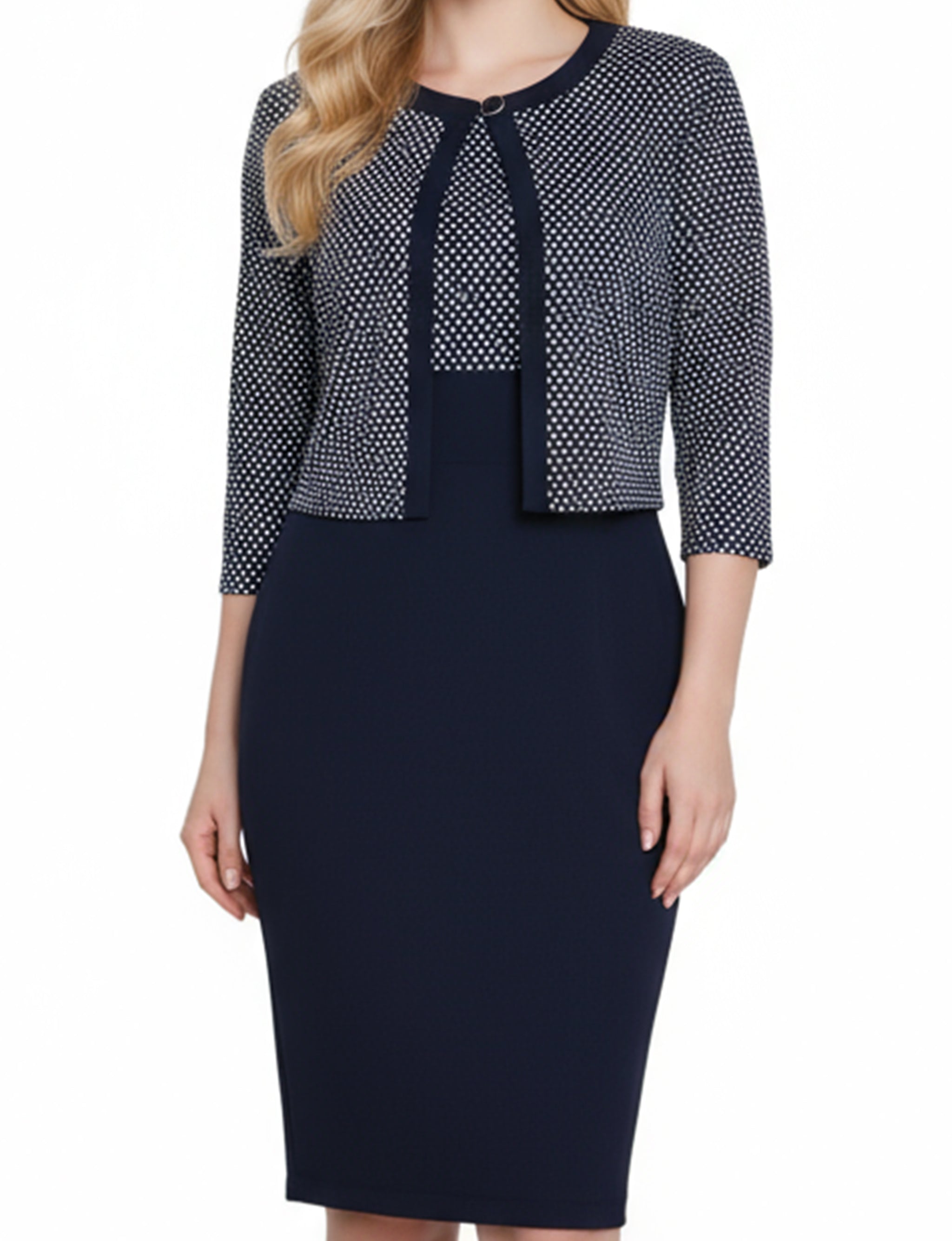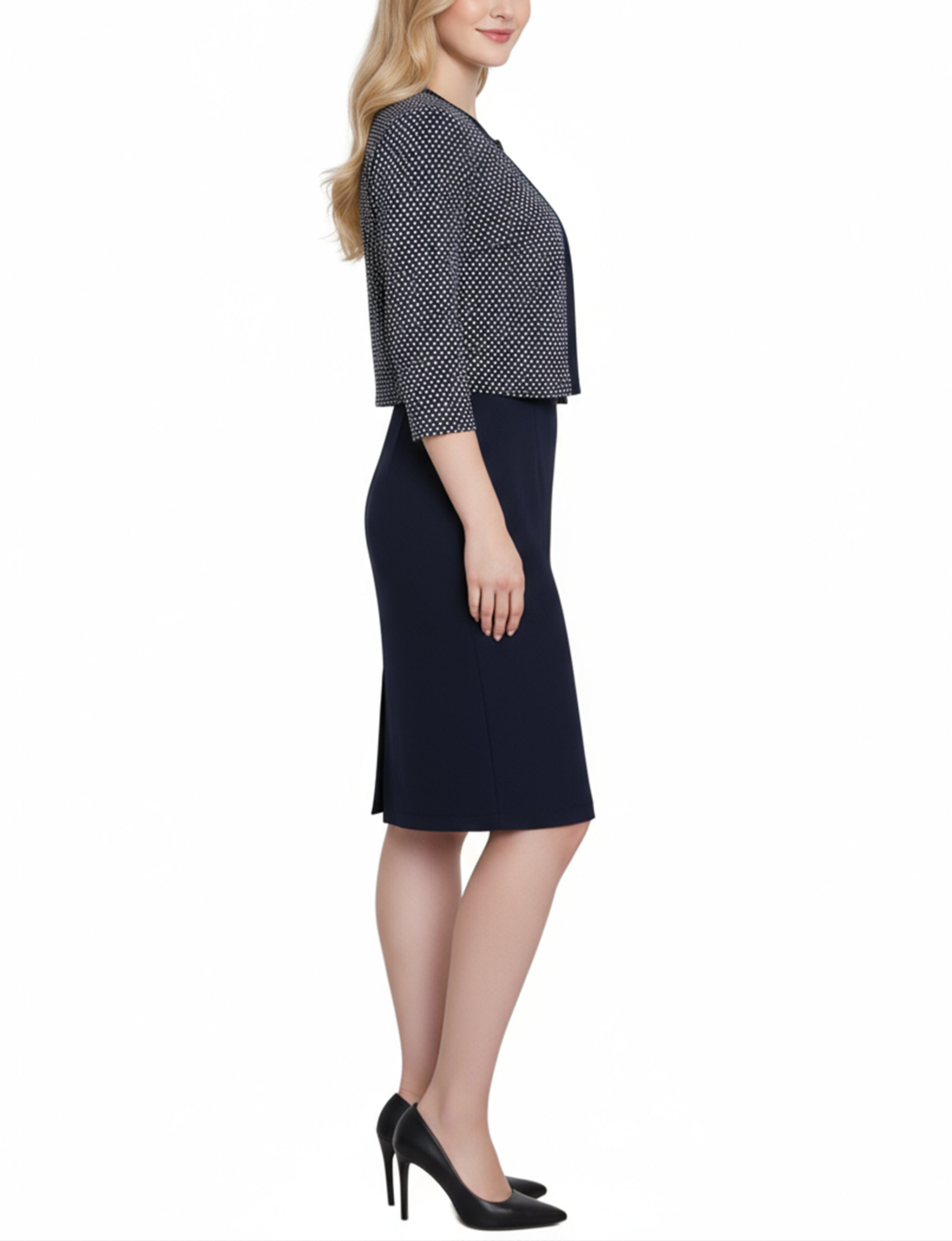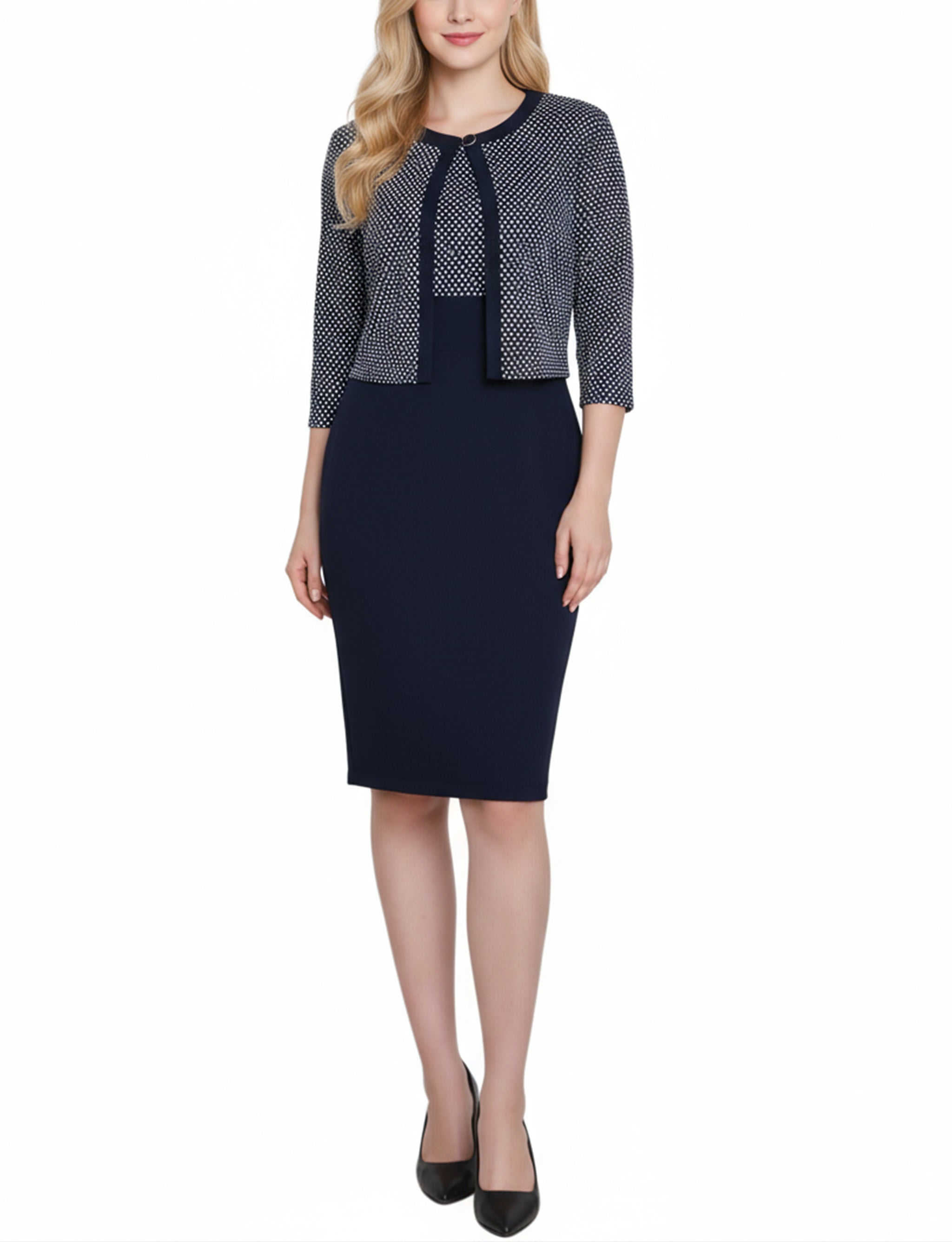 This elegant dress set from NY Collection features a sleek sheath dress paired with a coordinating textured cropped jacket for a refined, polished look. Perfect for the office or special occasions, it offers effortless sophistication and timeless style.