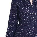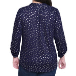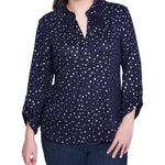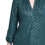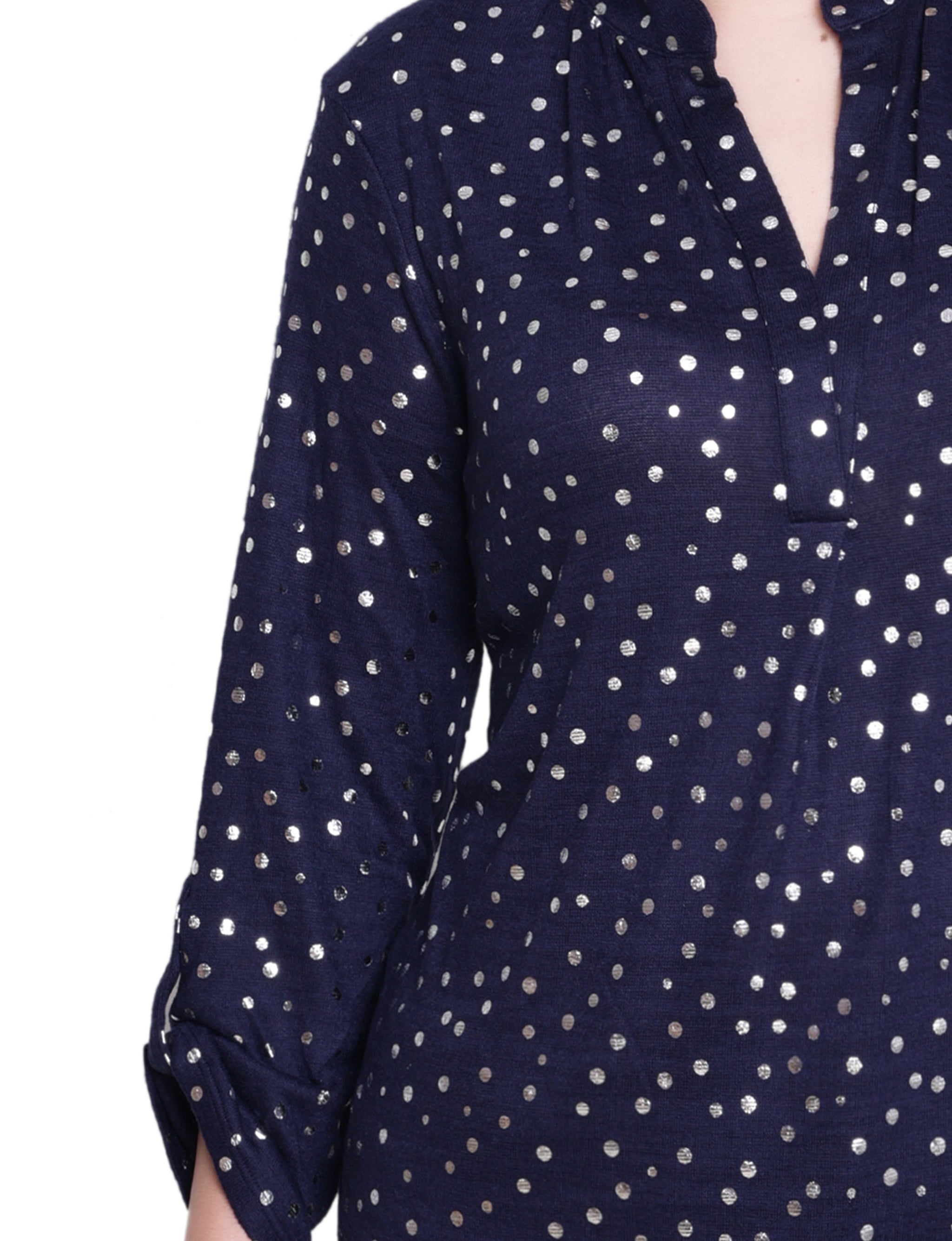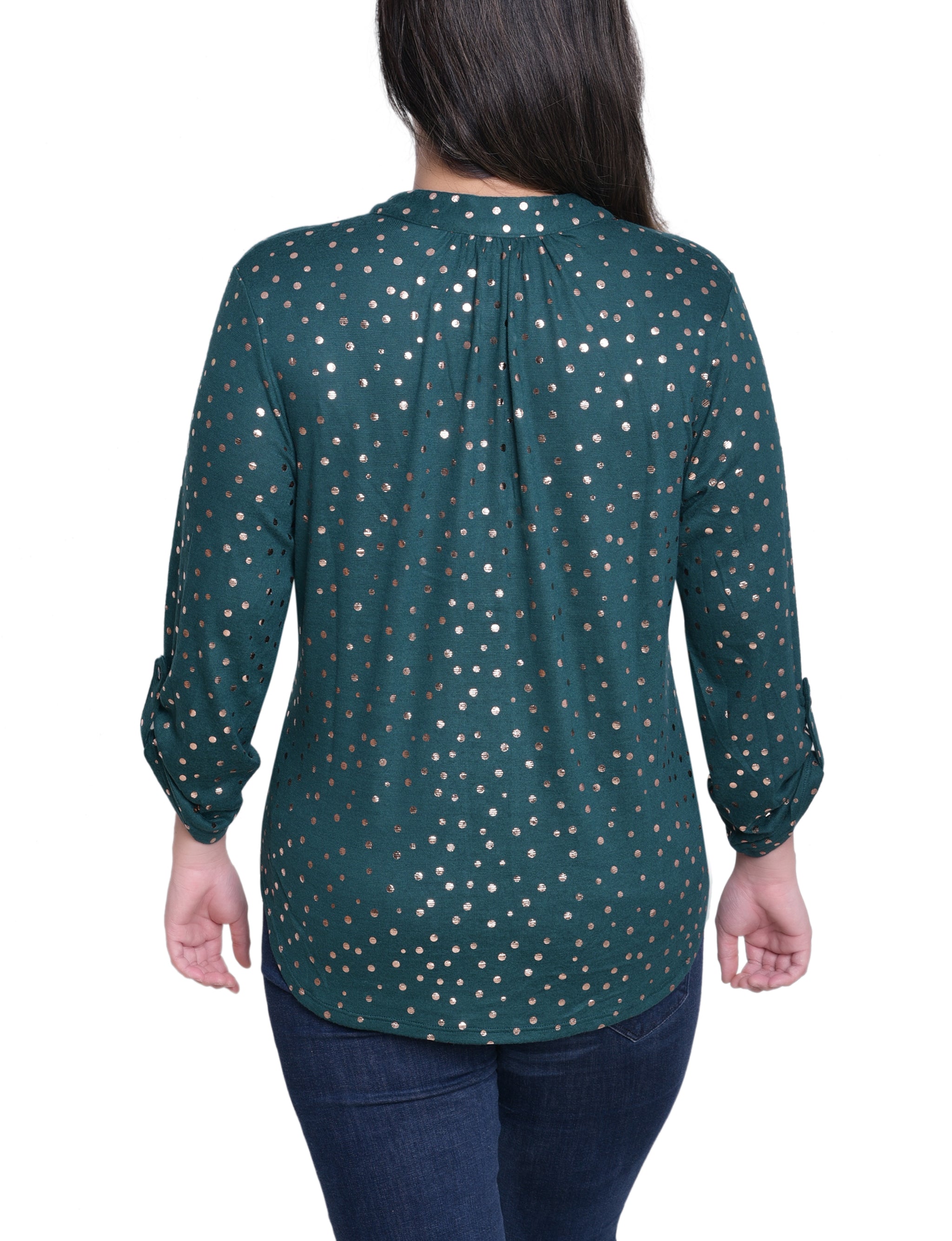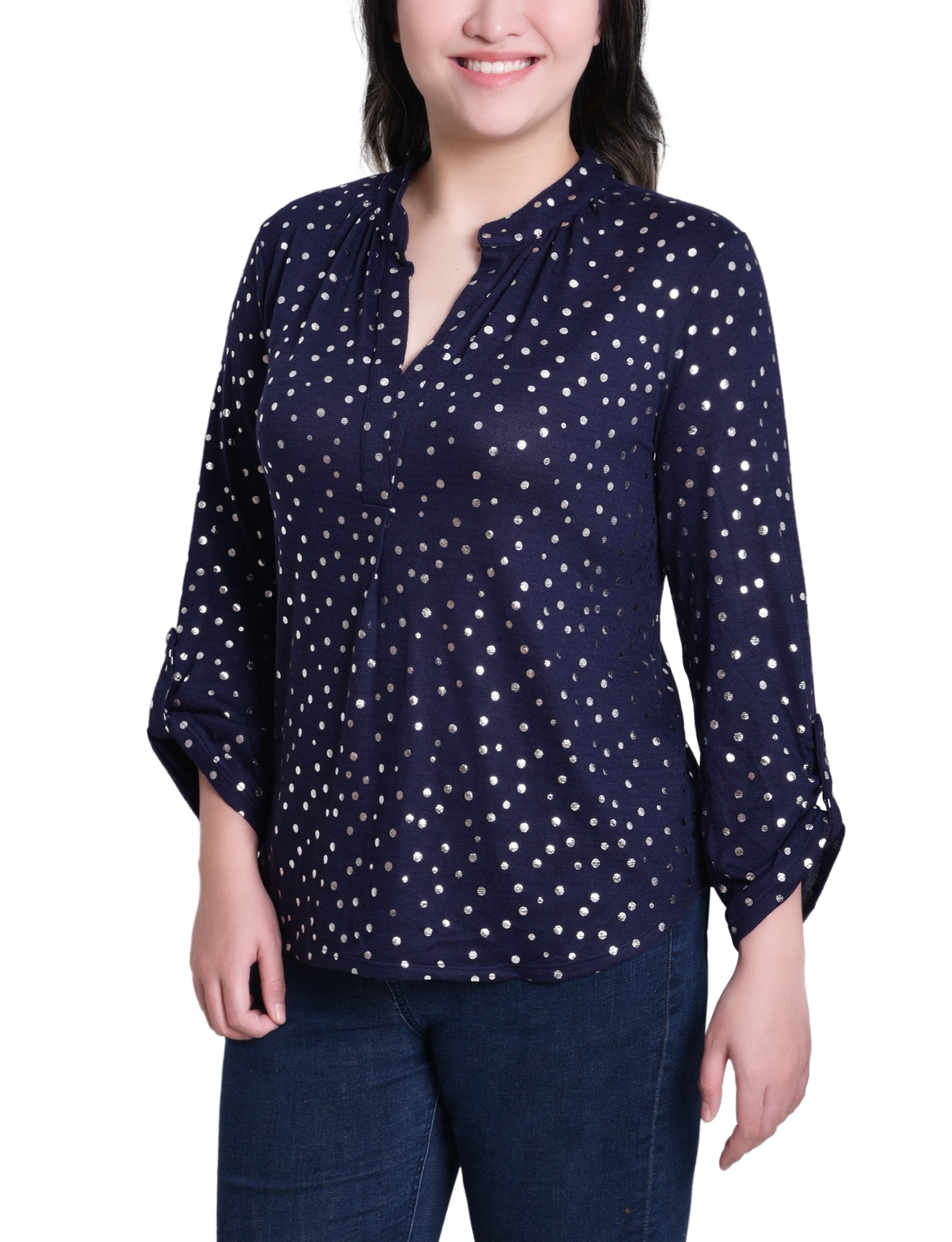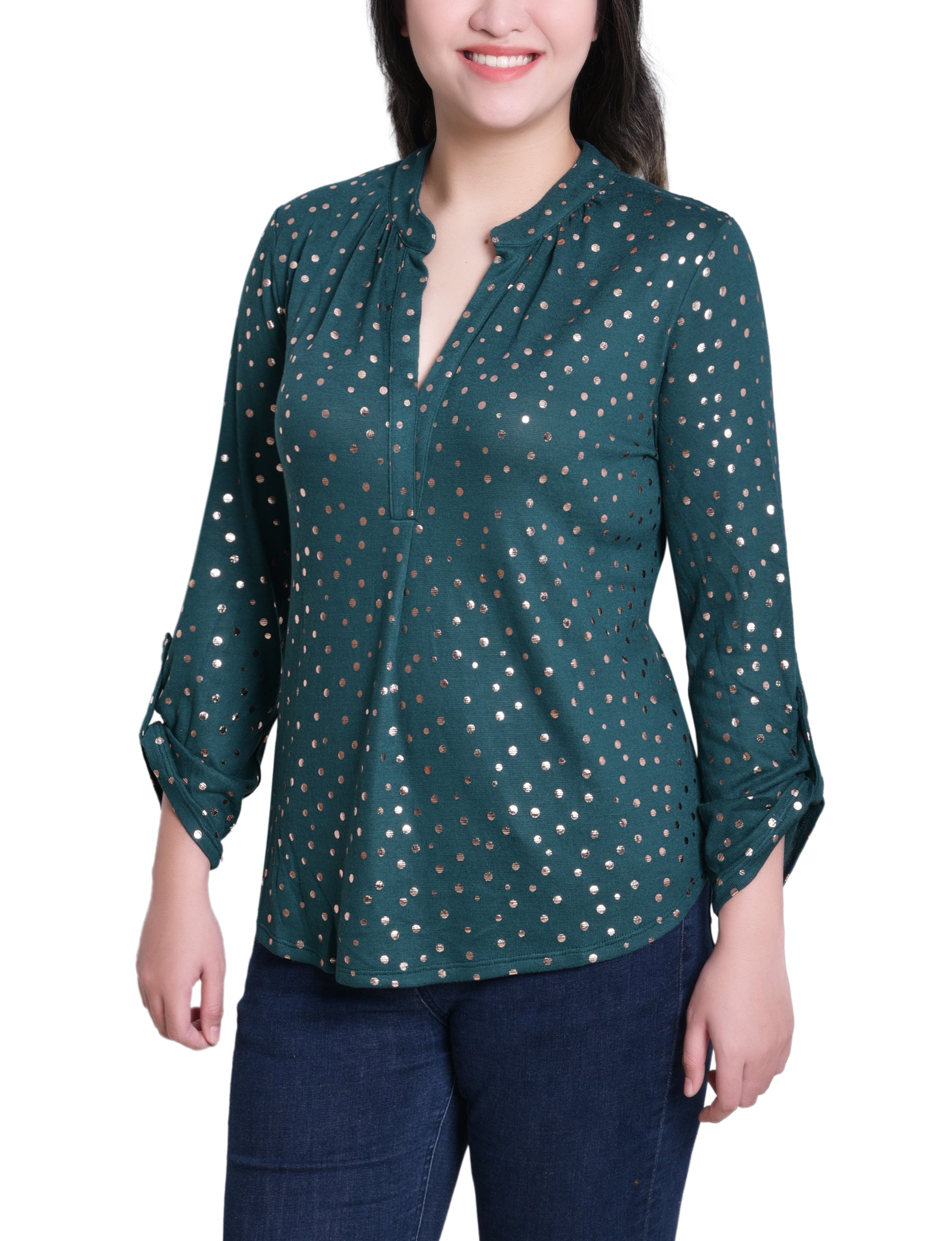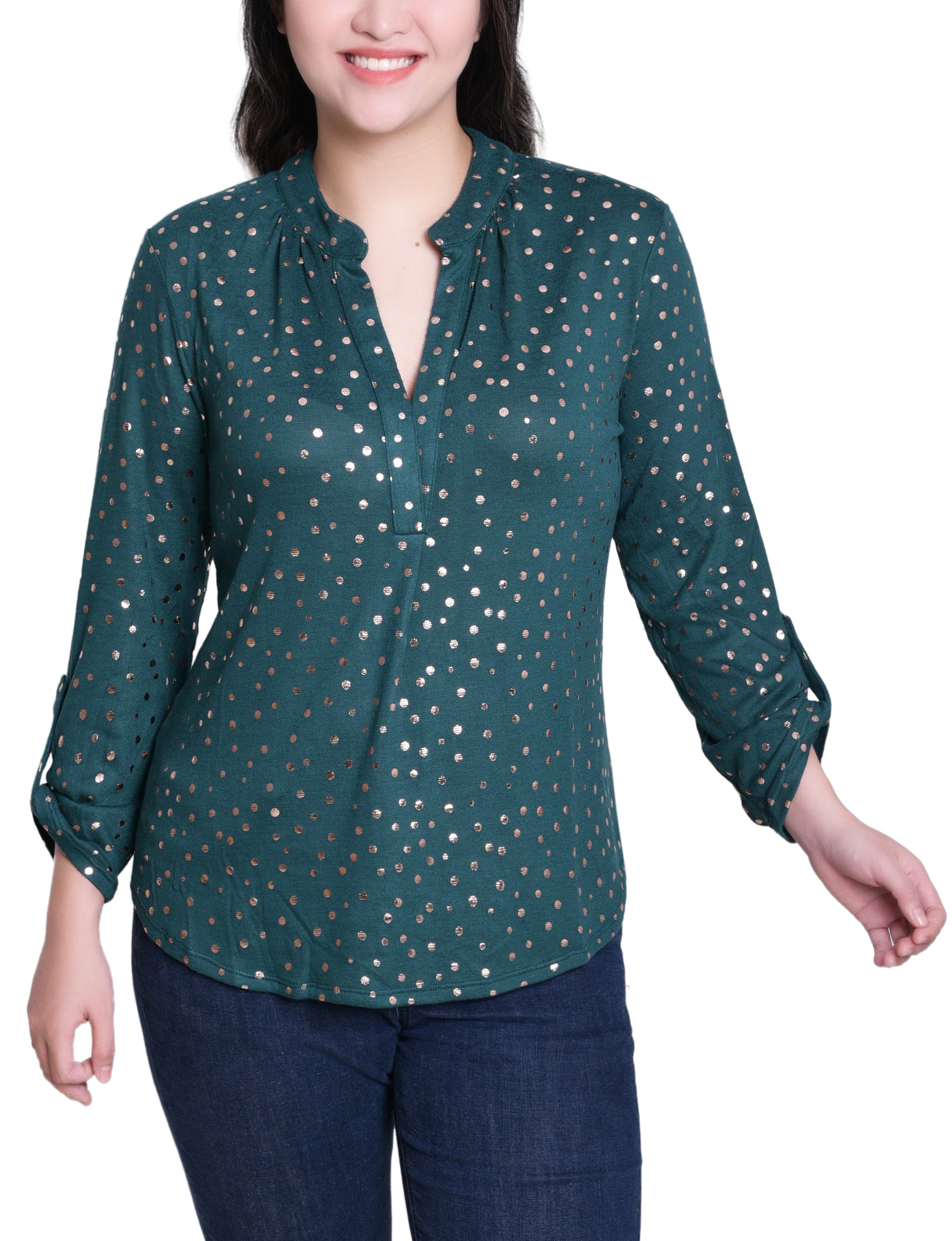 This stylish knit top from NY Collection features a flattering split neckline and allover metallic polka dot print for a touch of sparkle. Designed with roll-tab sleeves, it offers versatile wear for both casual and dressy occasions.