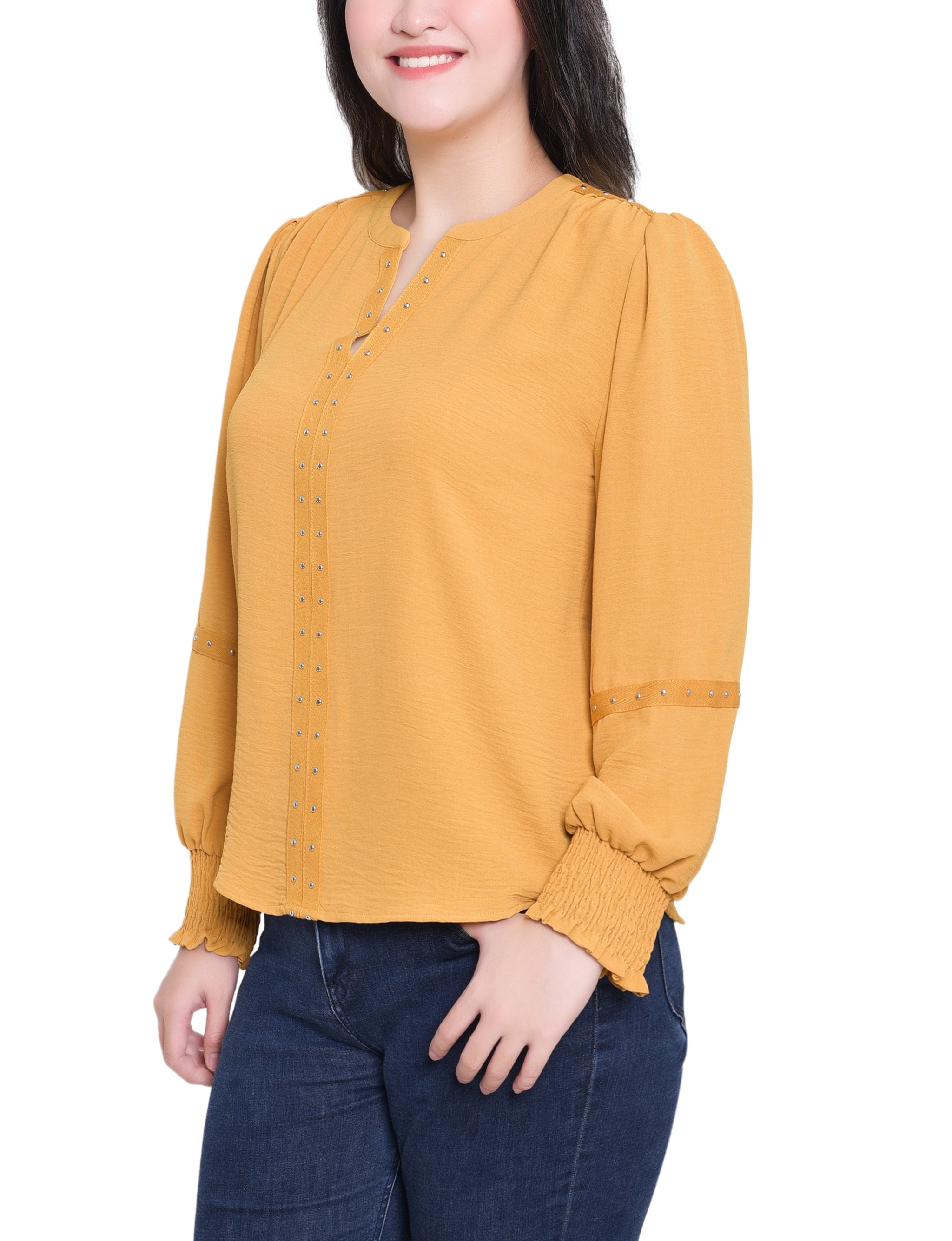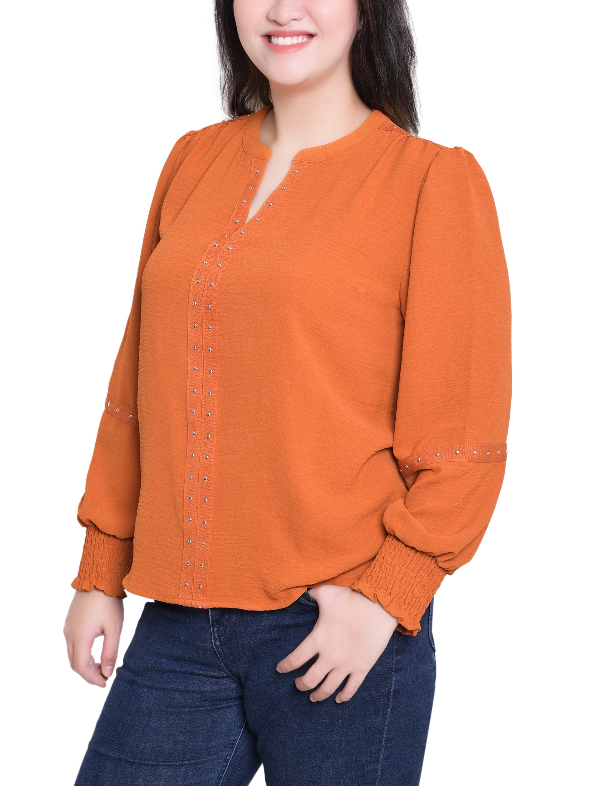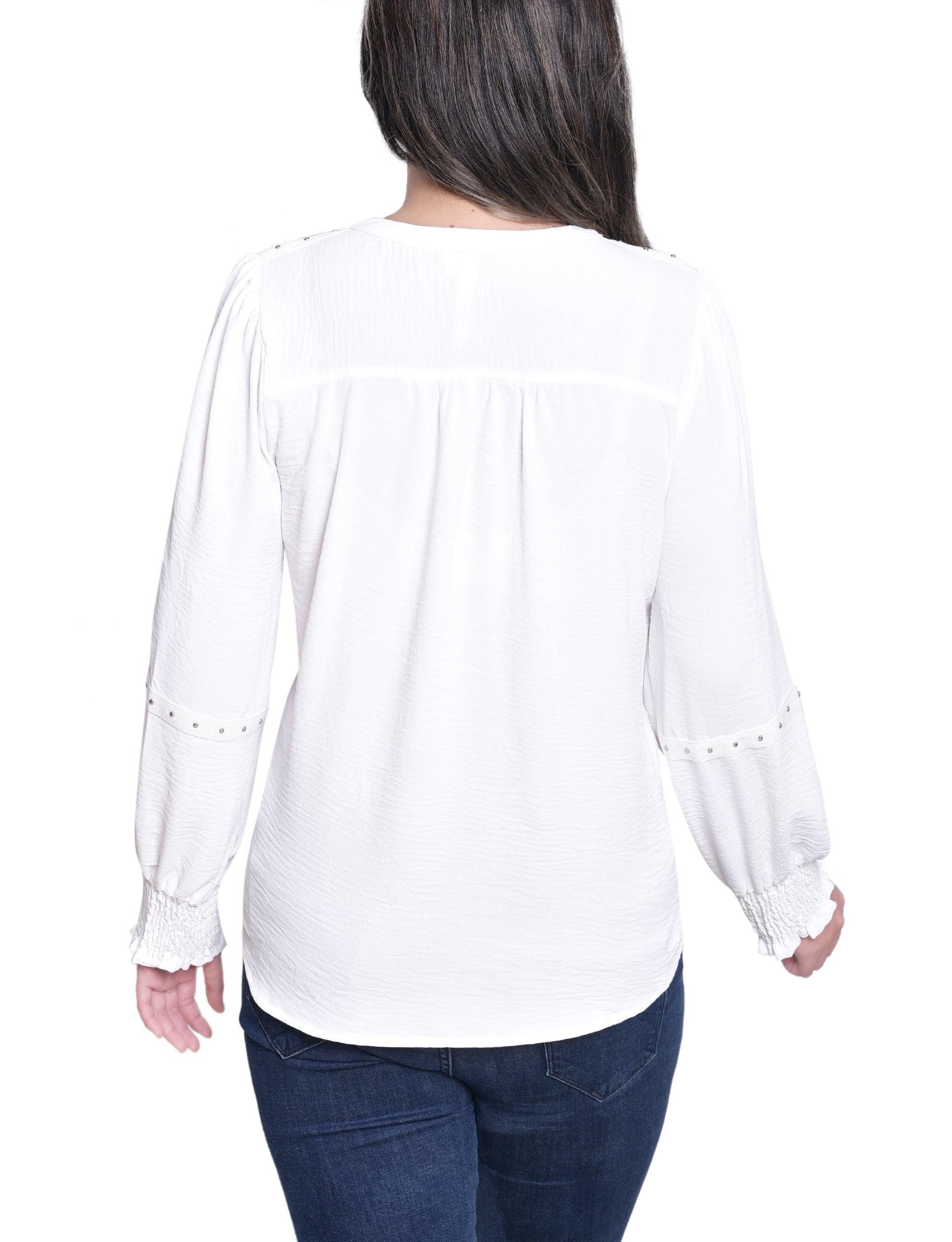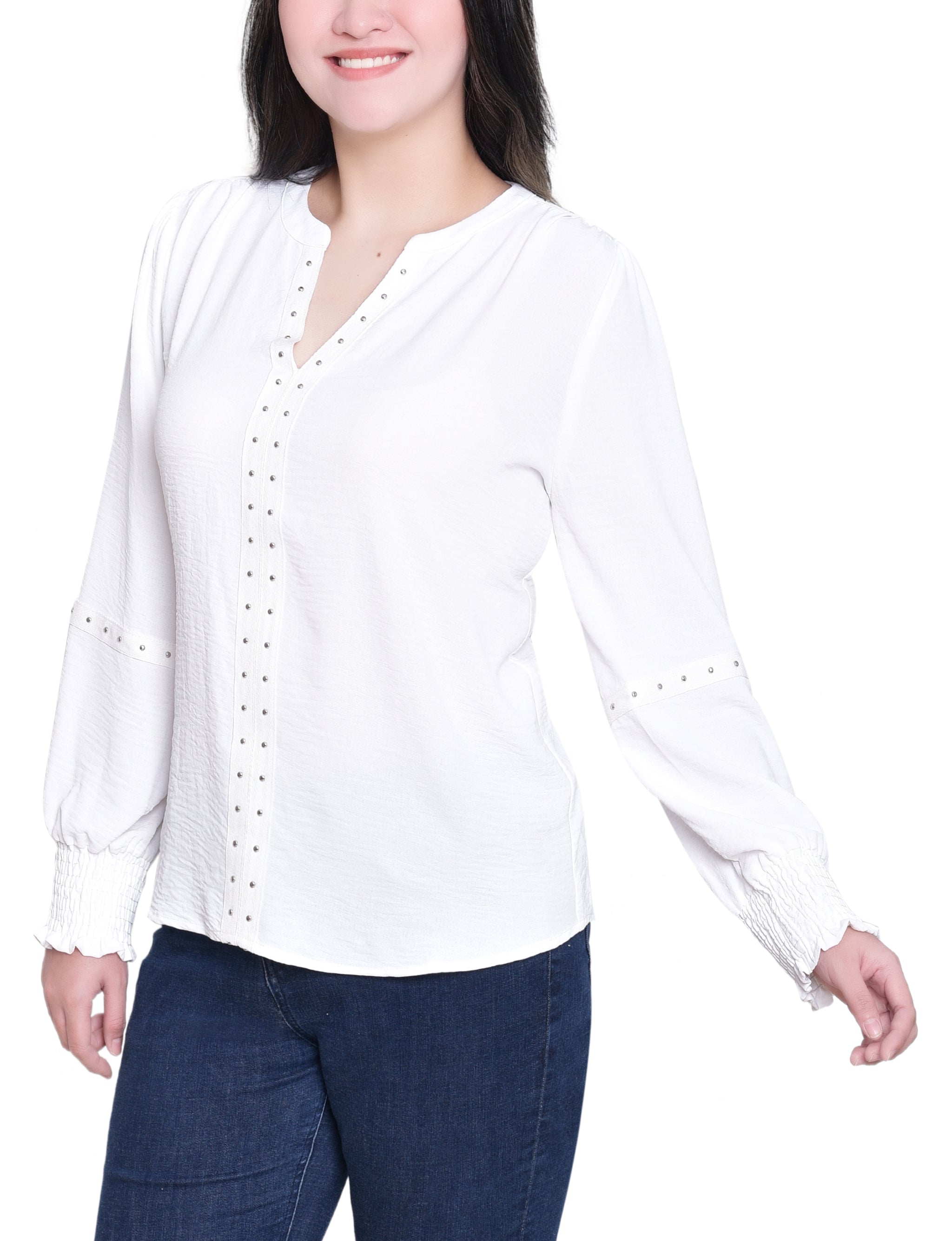 This textured blouse from NY Collection features a deep split neckline accented with metallic stud detailing for a touch of modern edge. Designed with smocked cuffs and relaxed long sleeves, it pairs effortlessly with jeans or trousers for a chic everyday look.