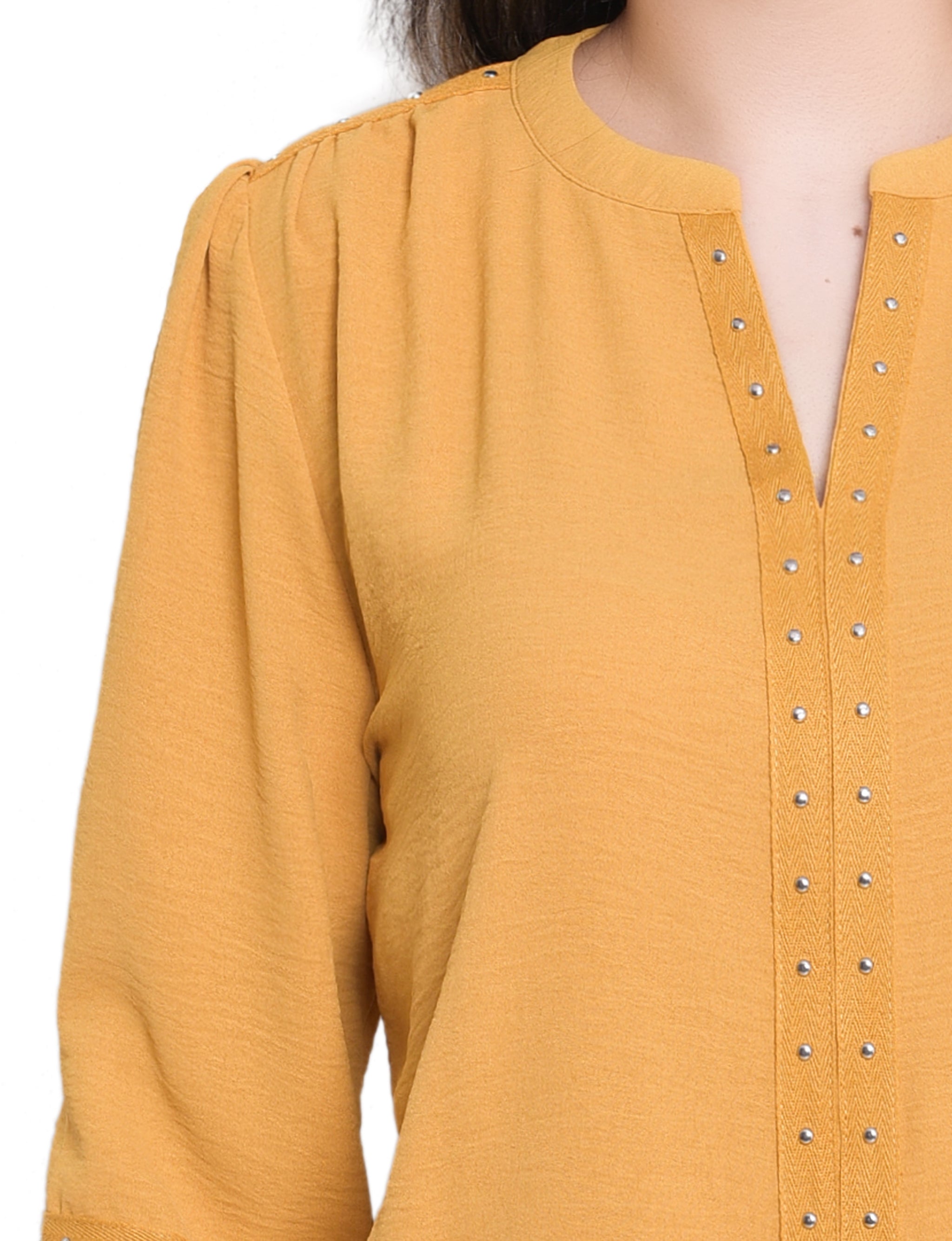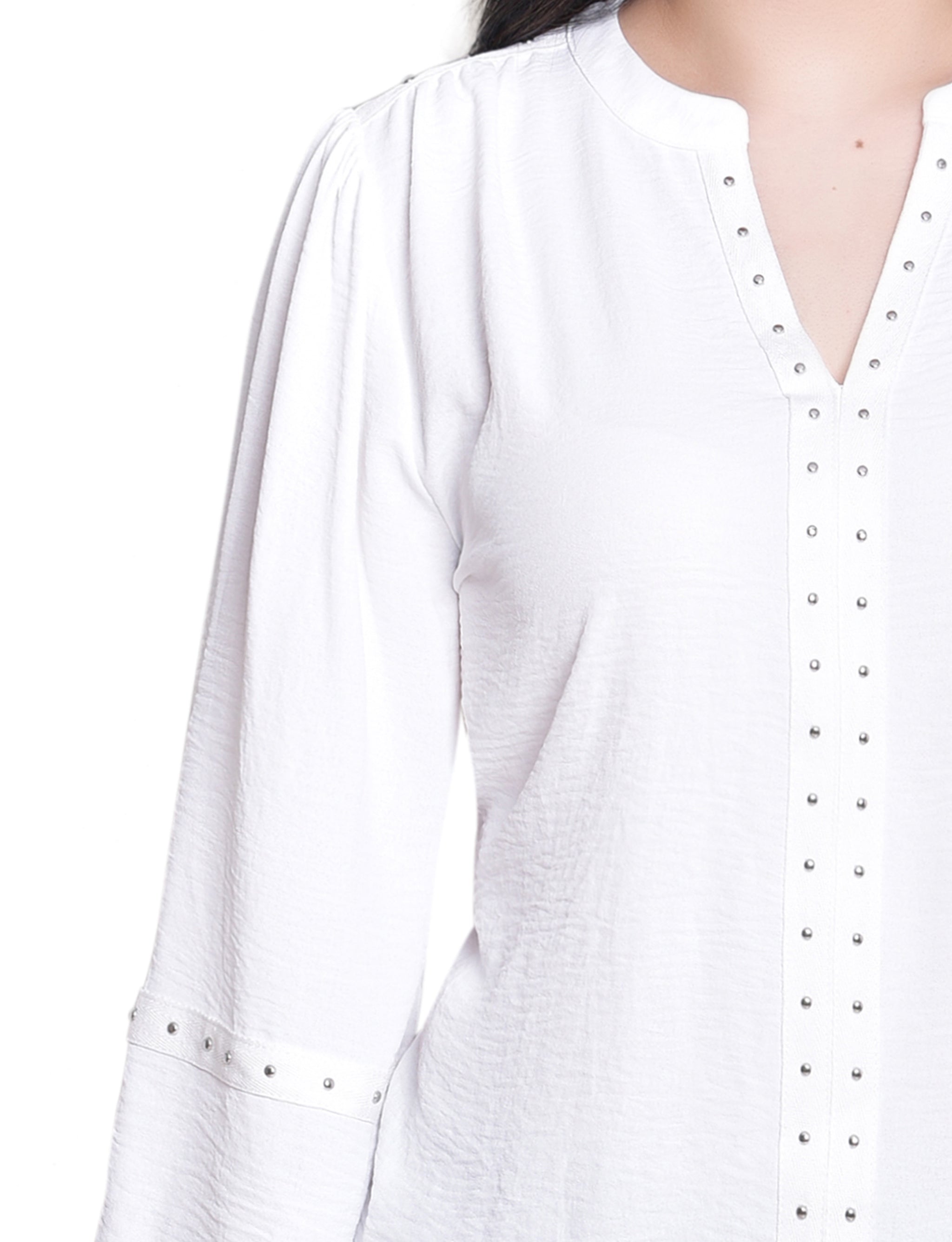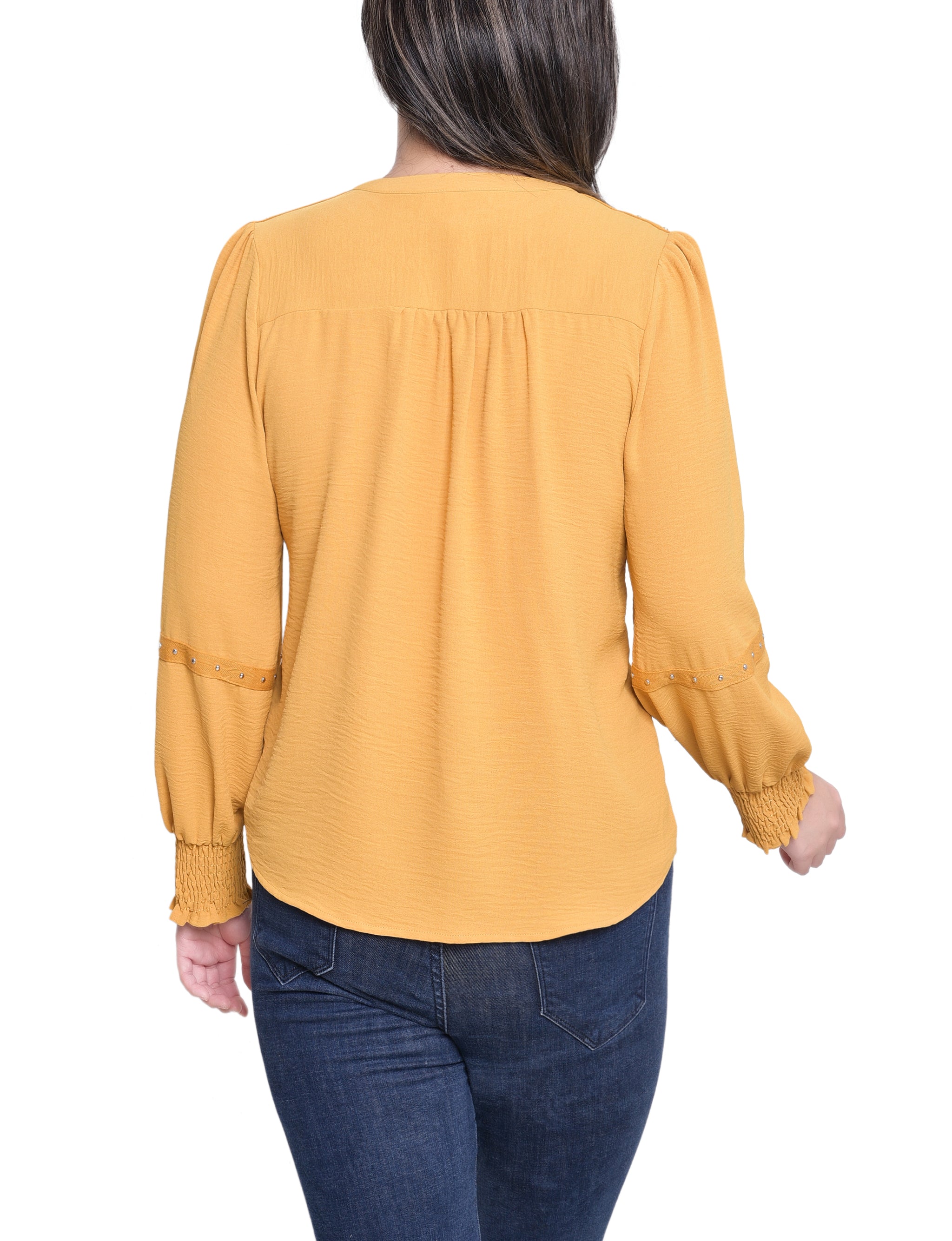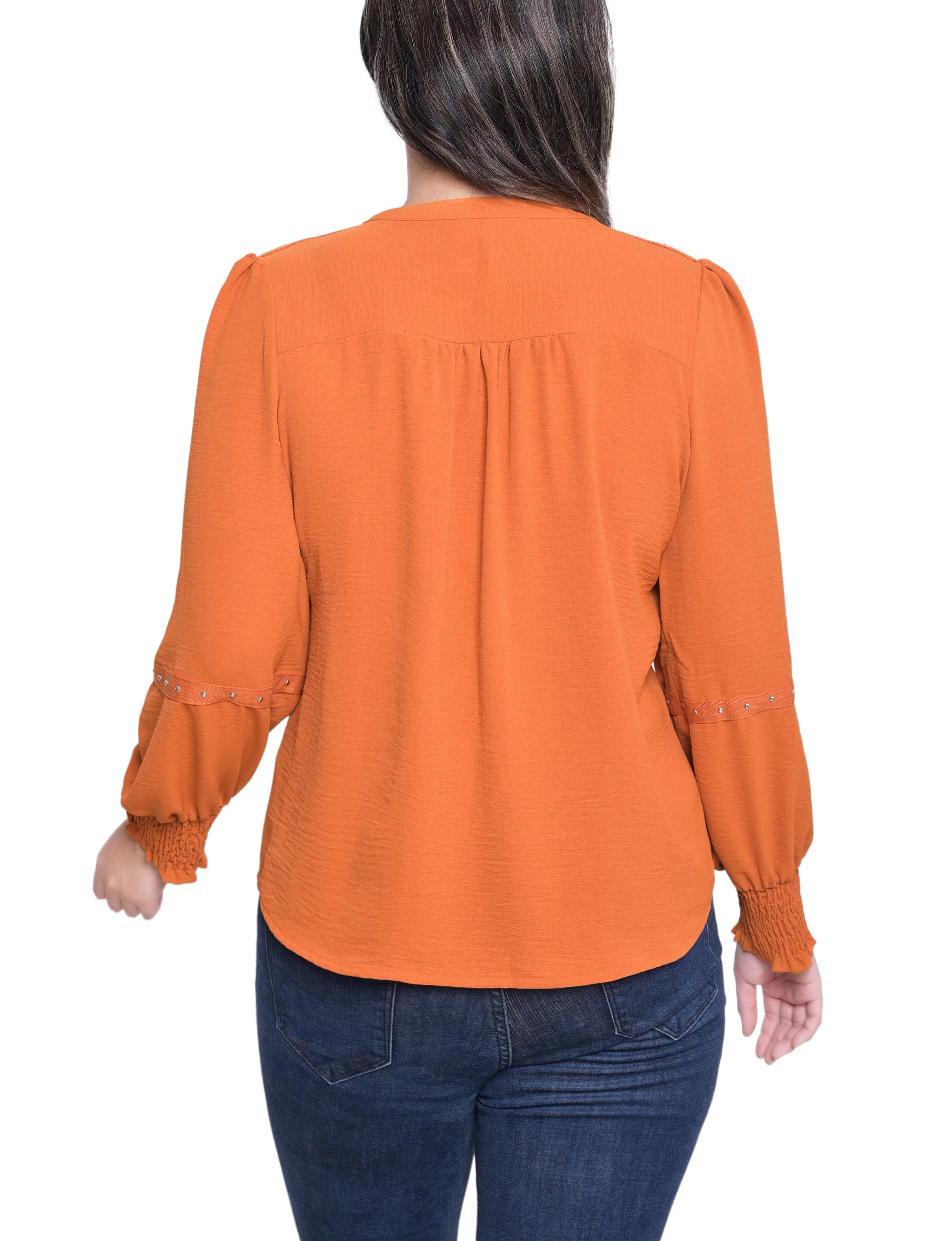 This textured blouse from NY Collection features a deep split neckline accented with metallic stud detailing for a touch of modern edge. Designed with smocked cuffs and relaxed long sleeves, it pairs effortlessly with jeans or trousers for a chic everyday look.