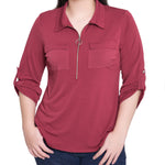NY Collection Petite 3/4 Roll Tab Zip Front Top - Burgandy