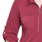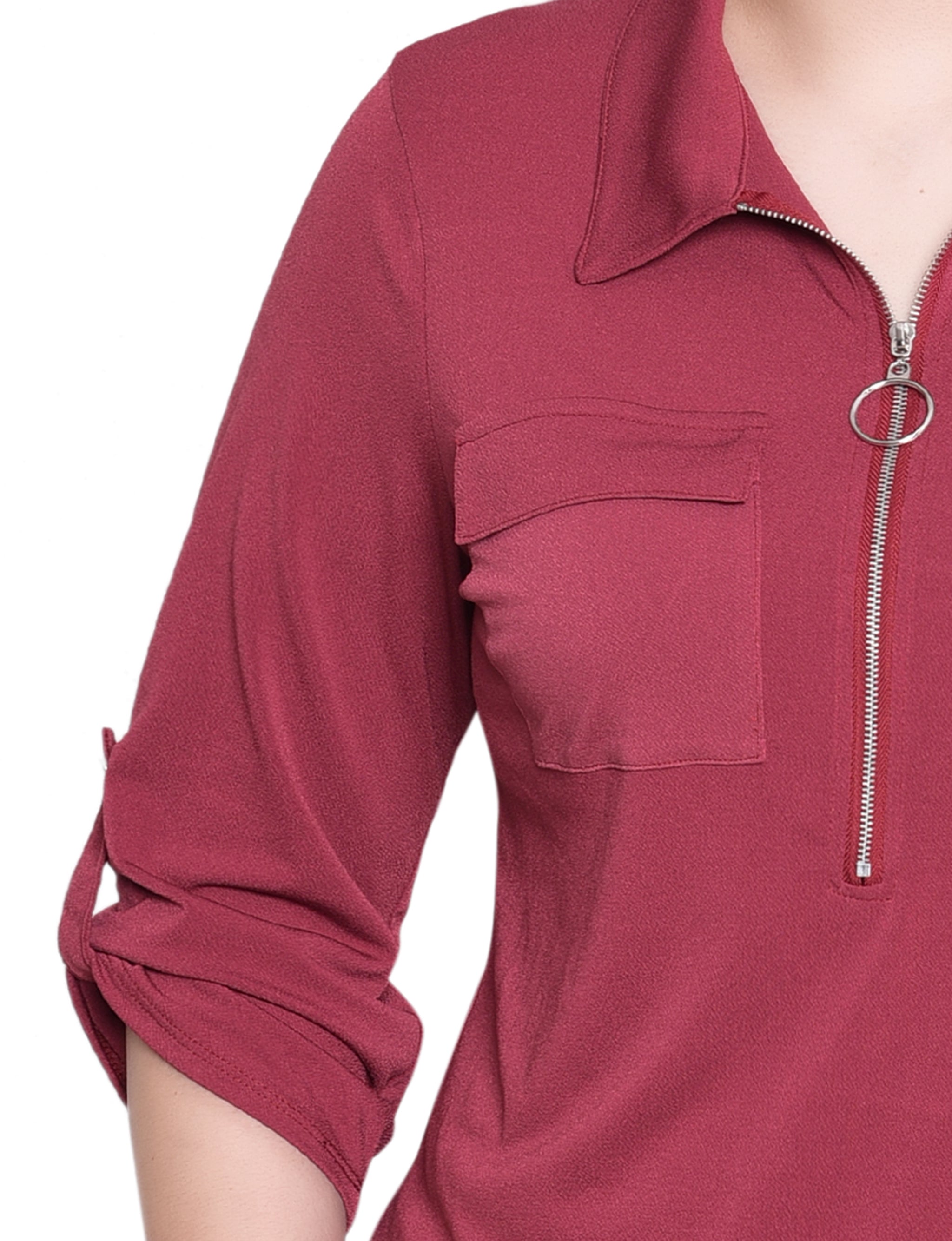 Elevate your casual look with this stylish burgundy blouse featuring a zip-front neckline and roll-tab sleeves. The relaxed fit and soft fabric make it a perfect pairing with your favorite jeans or leggings.