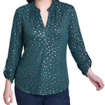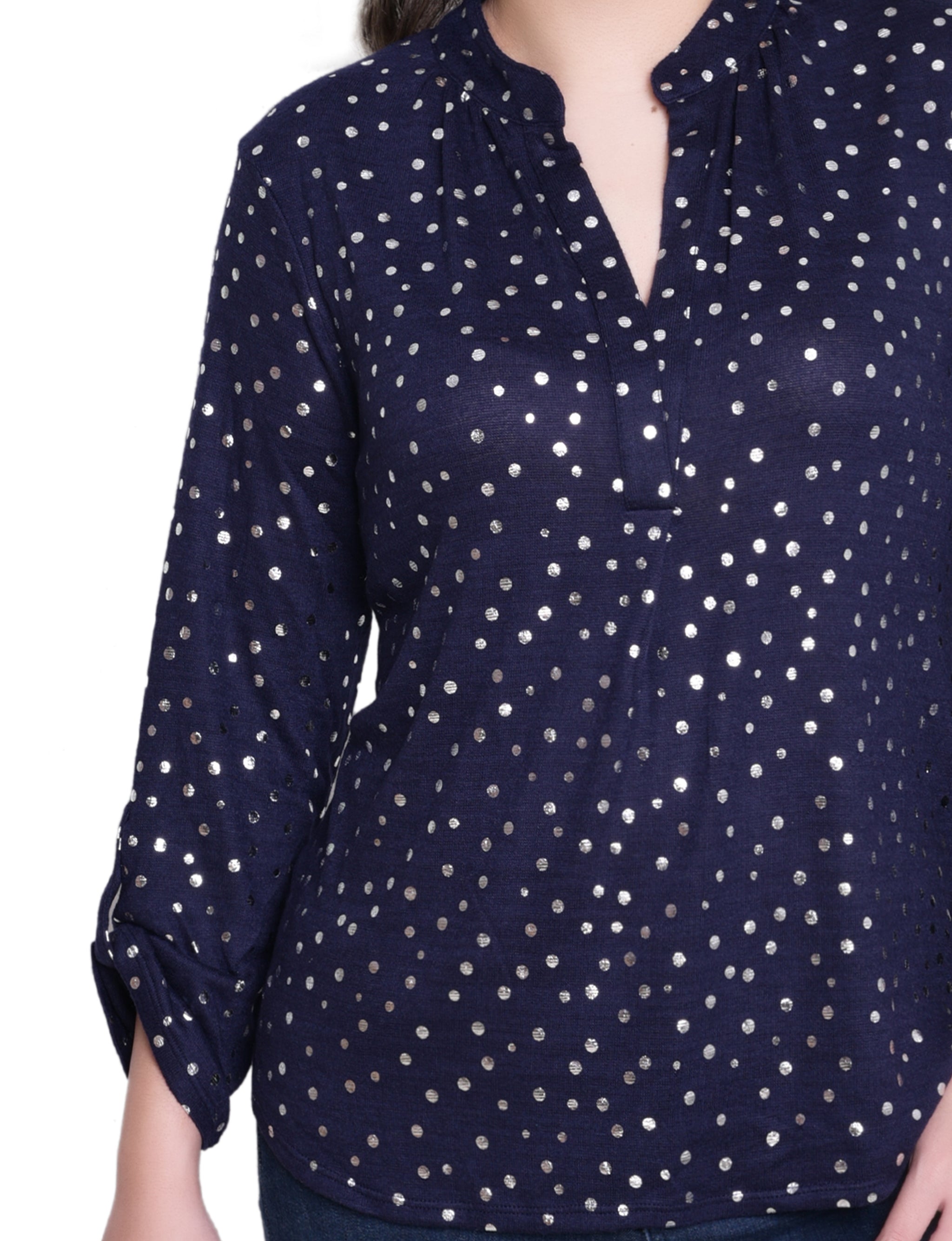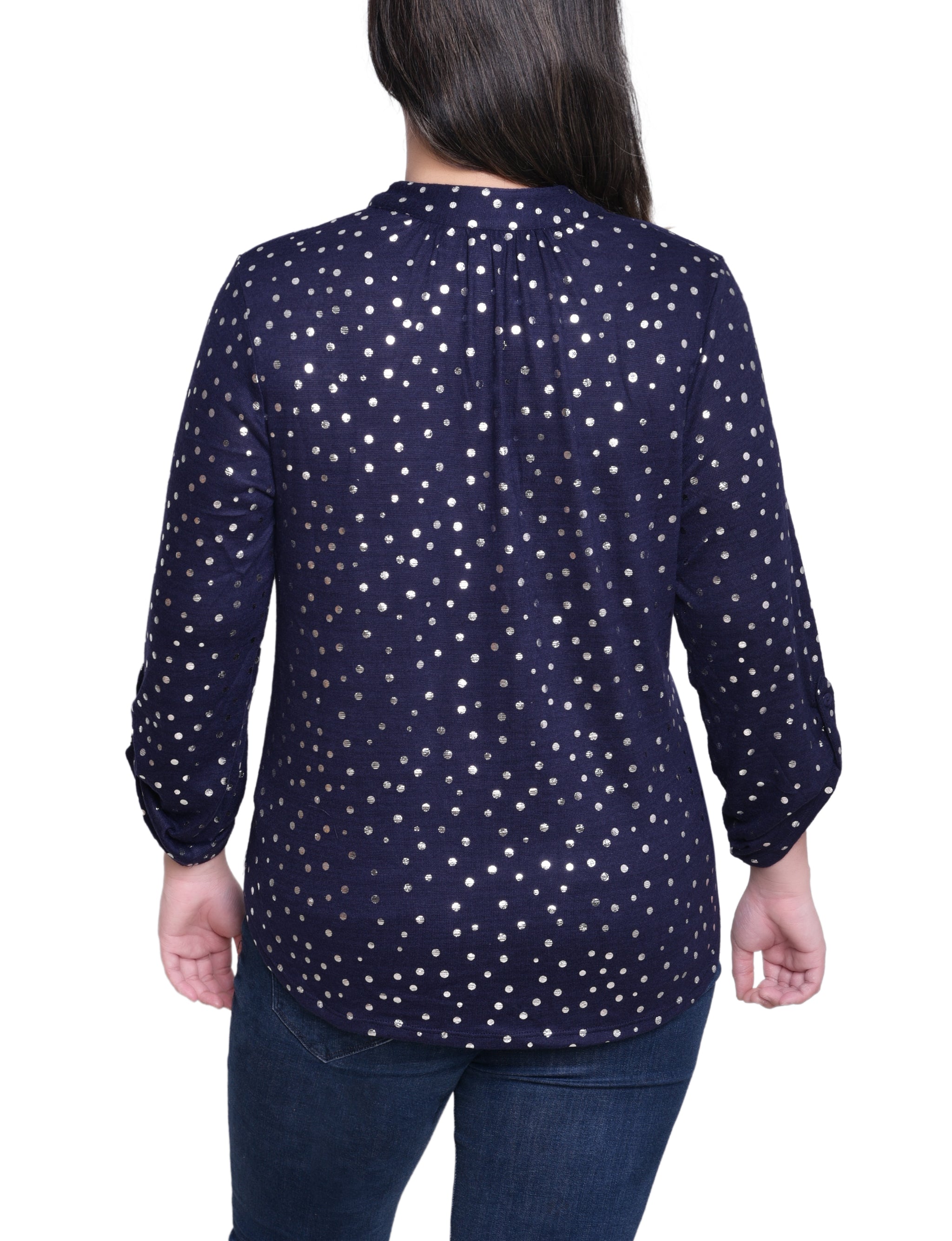 This stylish knit top from NY Collection features a flattering split neckline and allover metallic polka dot print for a touch of sparkle. Designed with roll-tab sleeves, it offers versatile wear for both casual and dressy occasions.