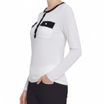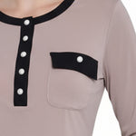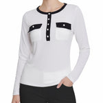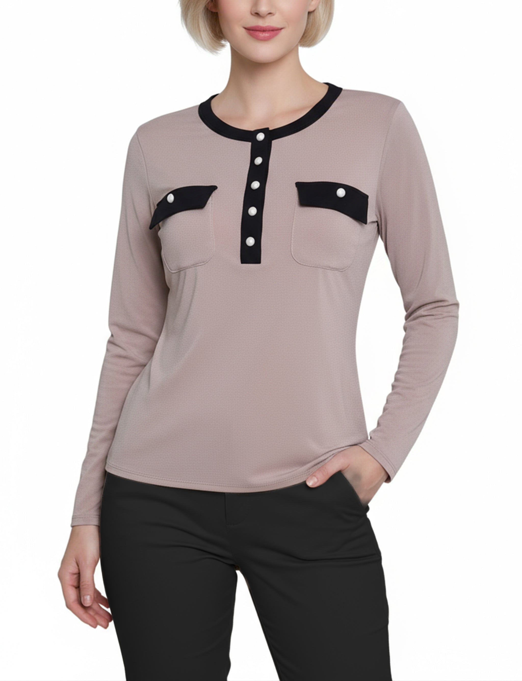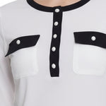 This sleek NY Collection top features bold contrast details on the collar, button placket, and faux pocket flaps for a modern, monochrome look. The long sleeves and tailored fit make it perfect for both workdays and weekends.