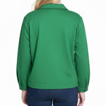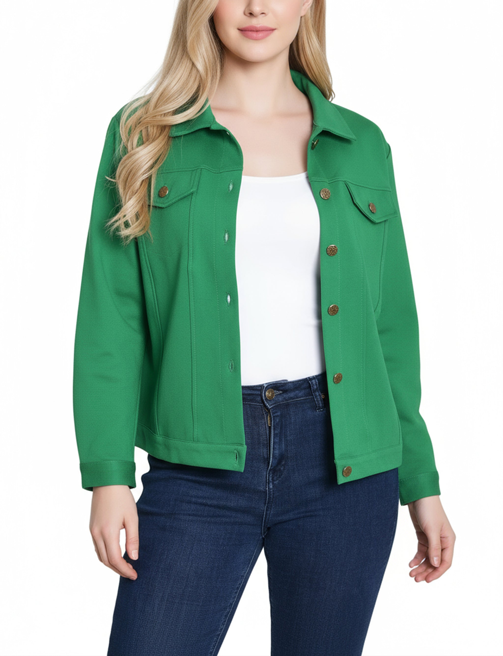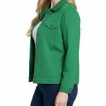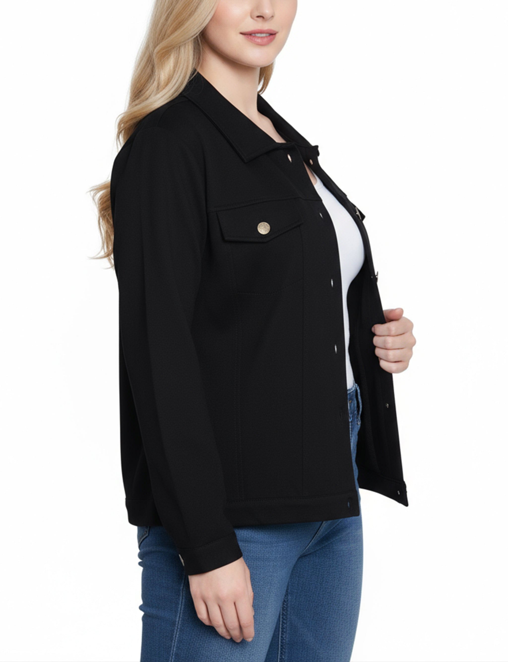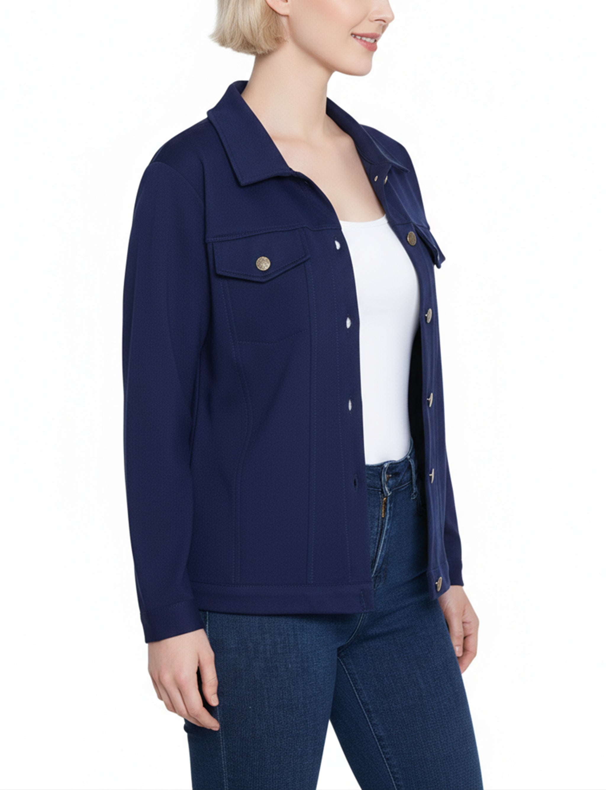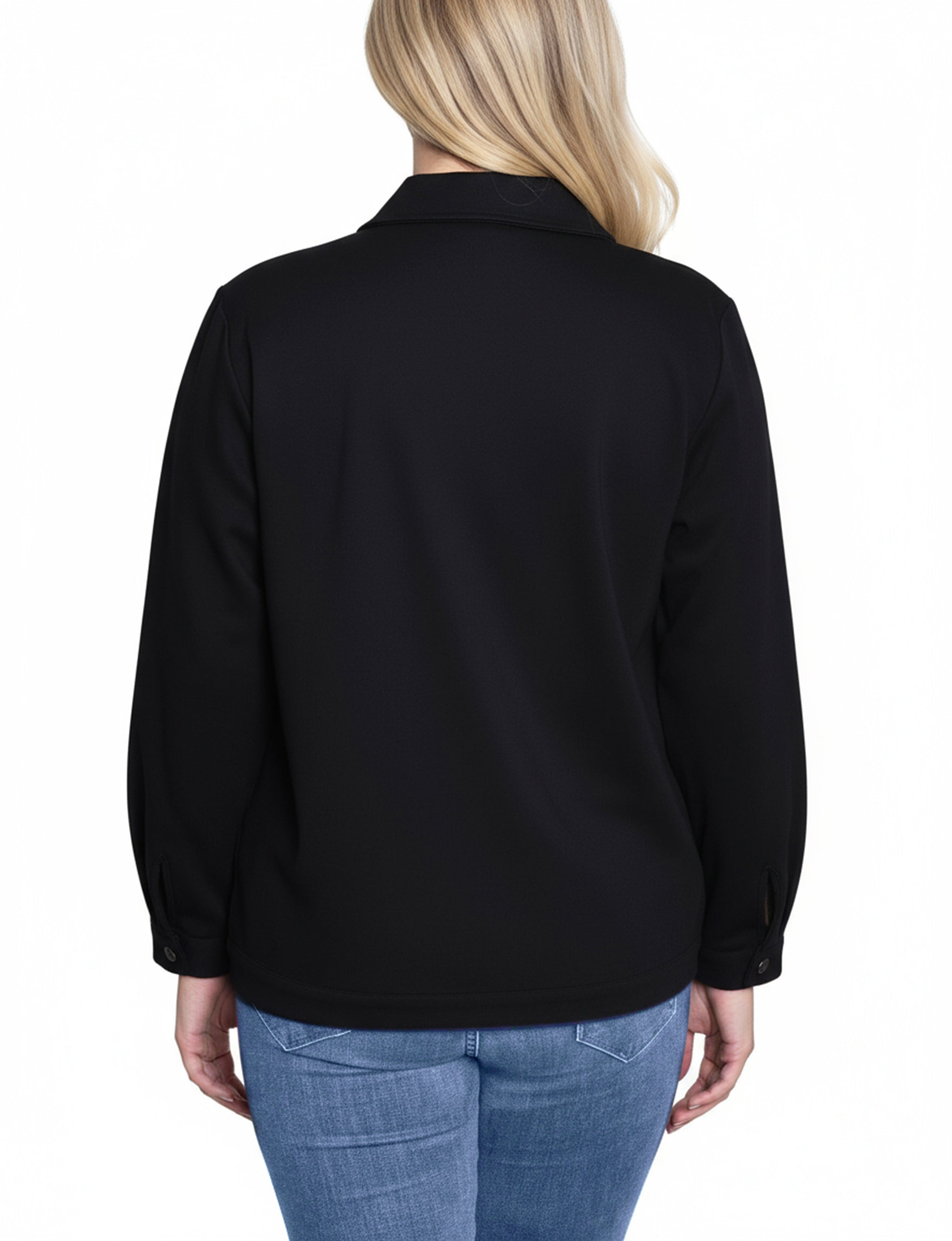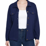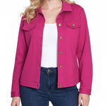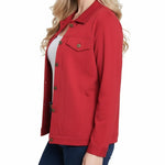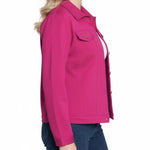 This NY Collection ponte jacket combines structured tailoring with comfortable stretch, making it a versatile layering piece for any season. Featuring a button-front design, chest flap pockets, and clean seam detailing, it's a timeless addition to your everyday wardrobe.