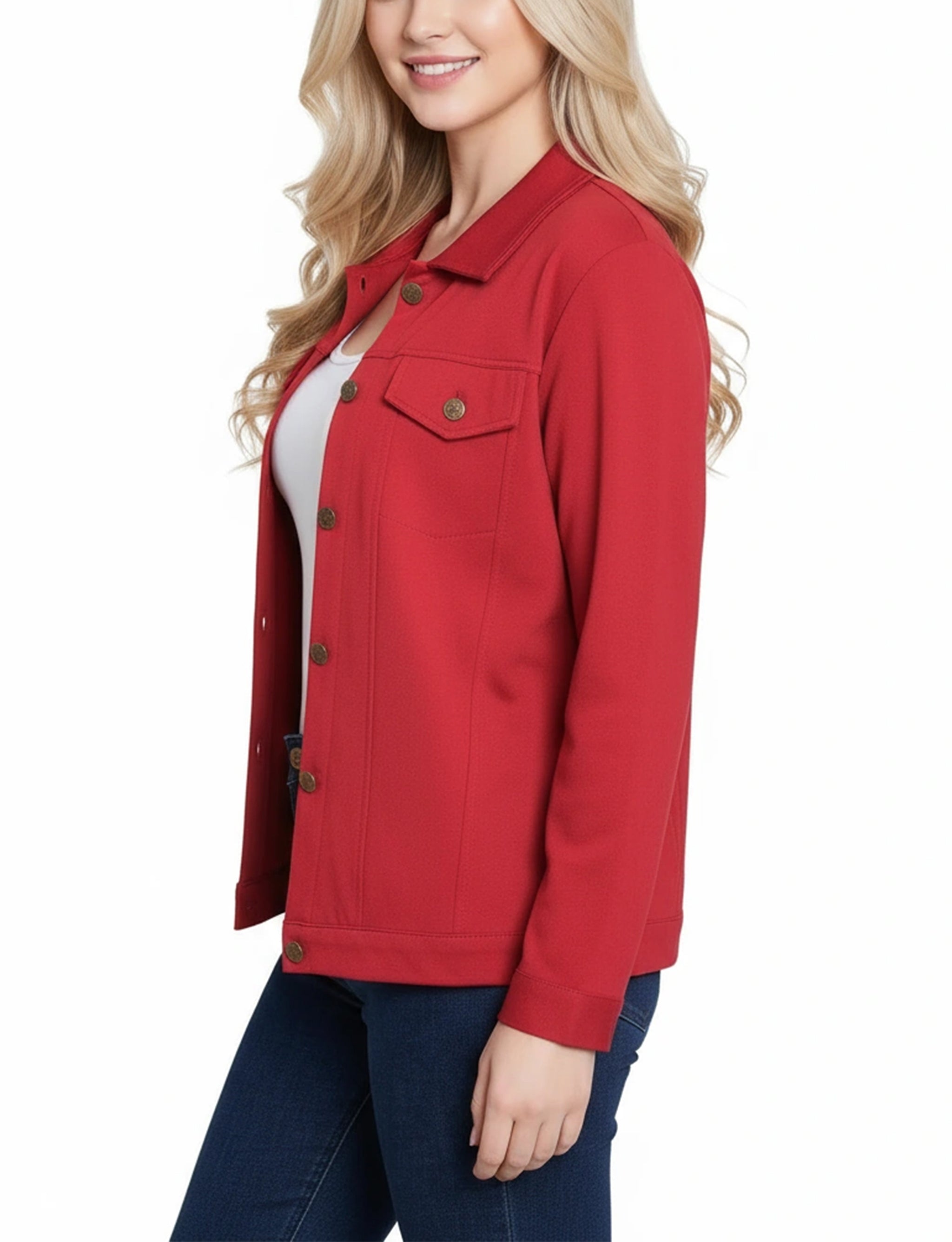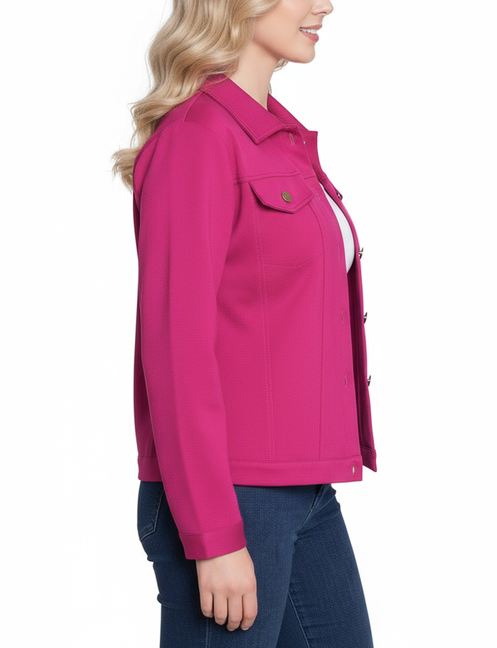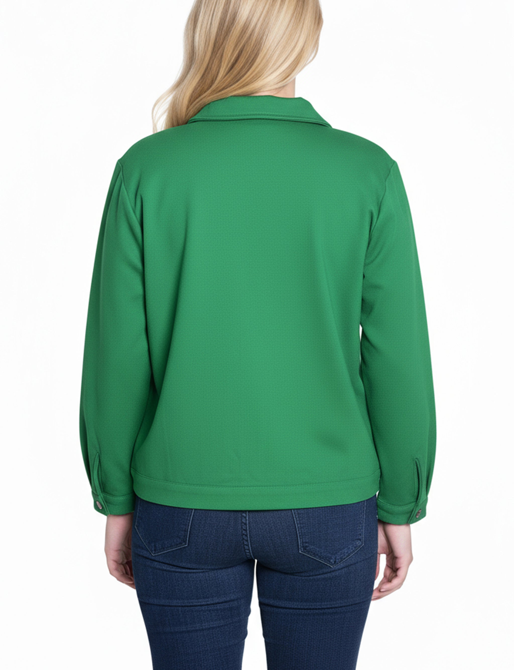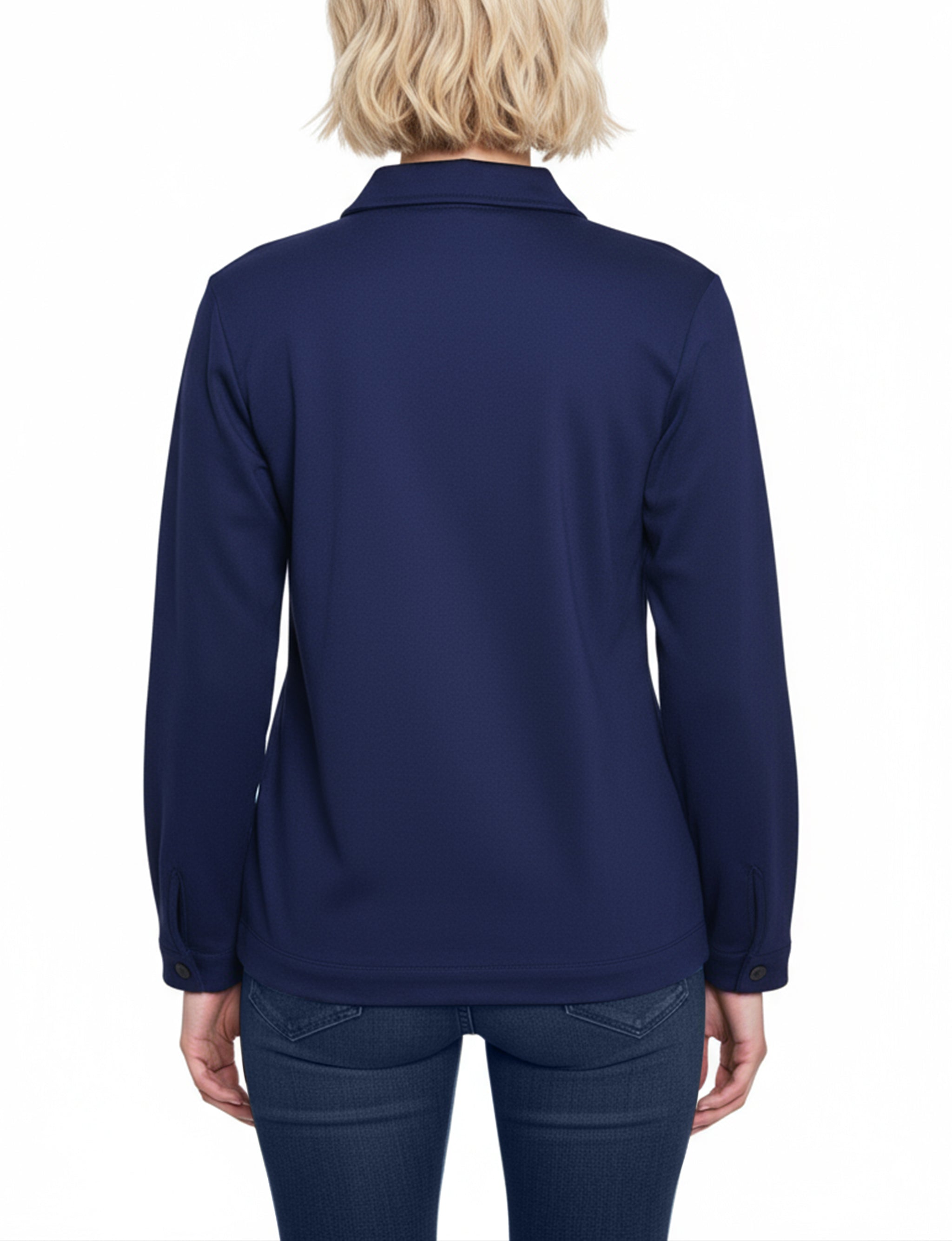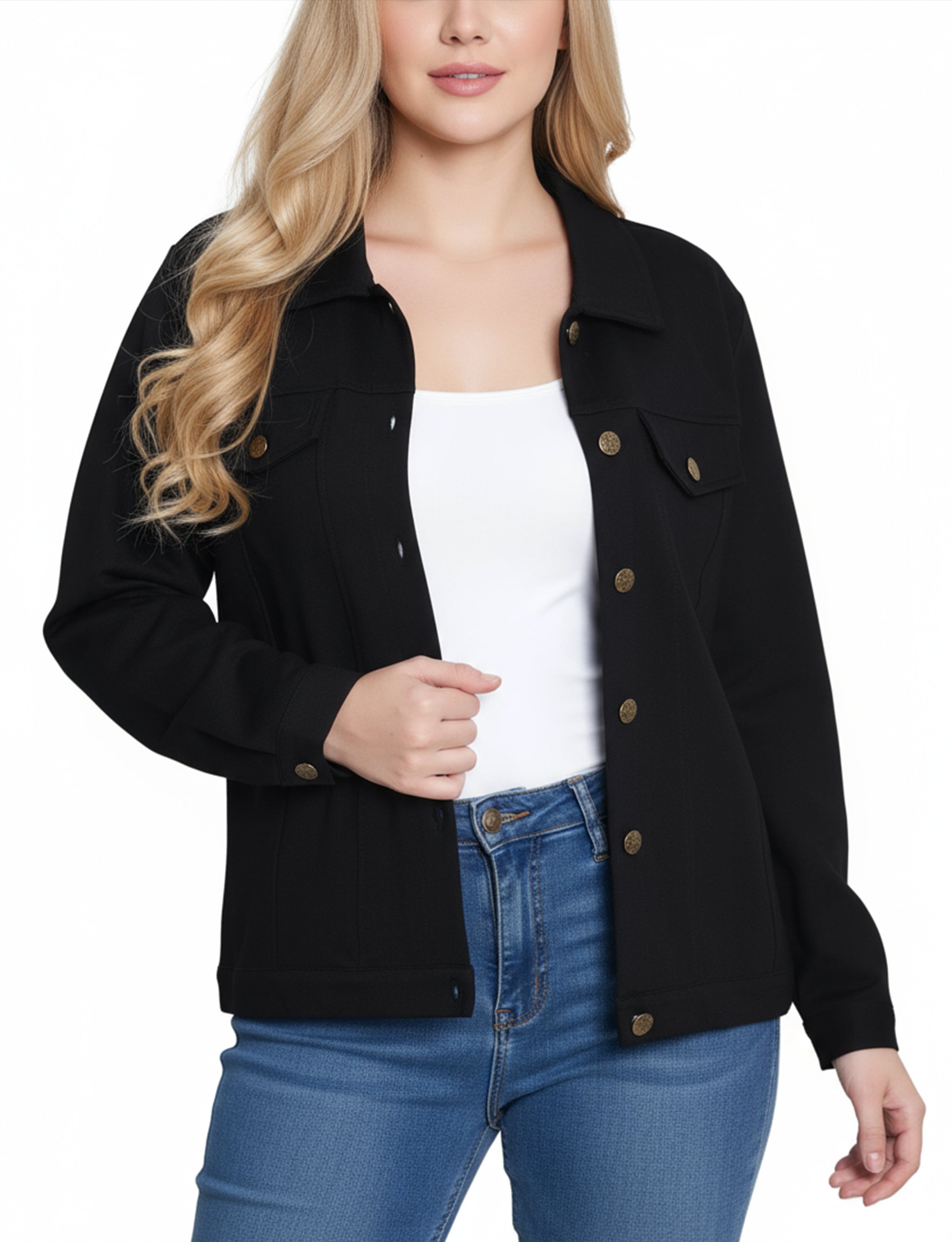 This NY Collection ponte jacket combines structured tailoring with comfortable stretch, making it a versatile layering piece for any season. Featuring a button-front design, chest flap pockets, and clean seam detailing, it's a timeless addition to your everyday wardrobe.