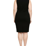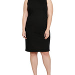 This classic sheath dress is paired with a cropped tweed jacket for a polished, professional look. Perfect for the office or formal events, it offers timeless elegance with modern sophistication.