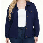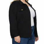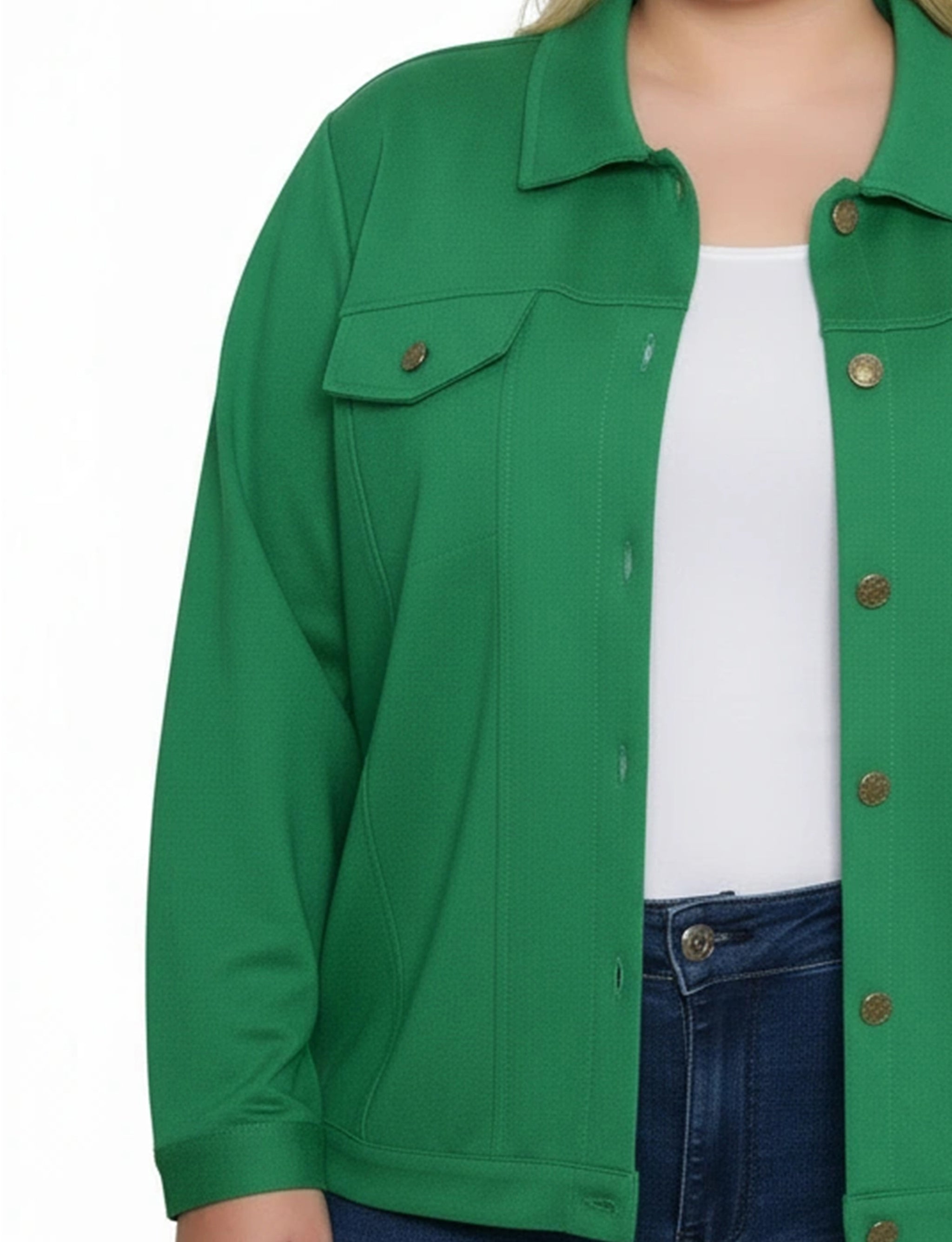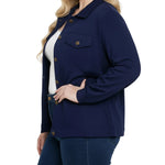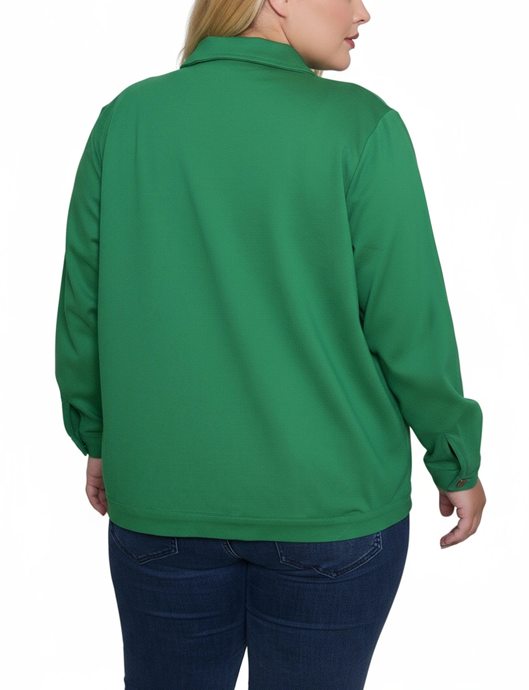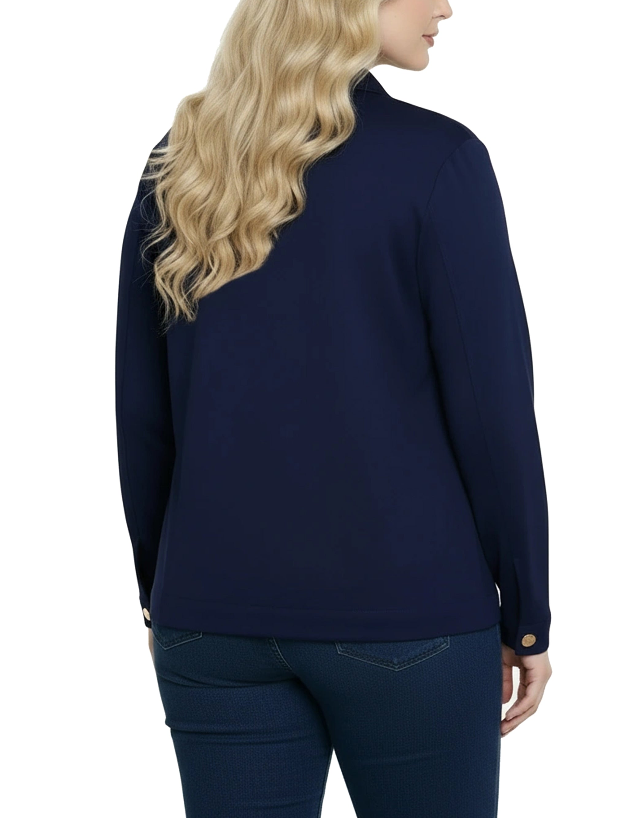This NY Collection ponte jacket combines structured tailoring with comfortable stretch, making it a versatile layering piece for any season. Featuring a button-front design, chest flap pockets, and clean seam detailing, it's a timeless addition to your everyday wardrobe.