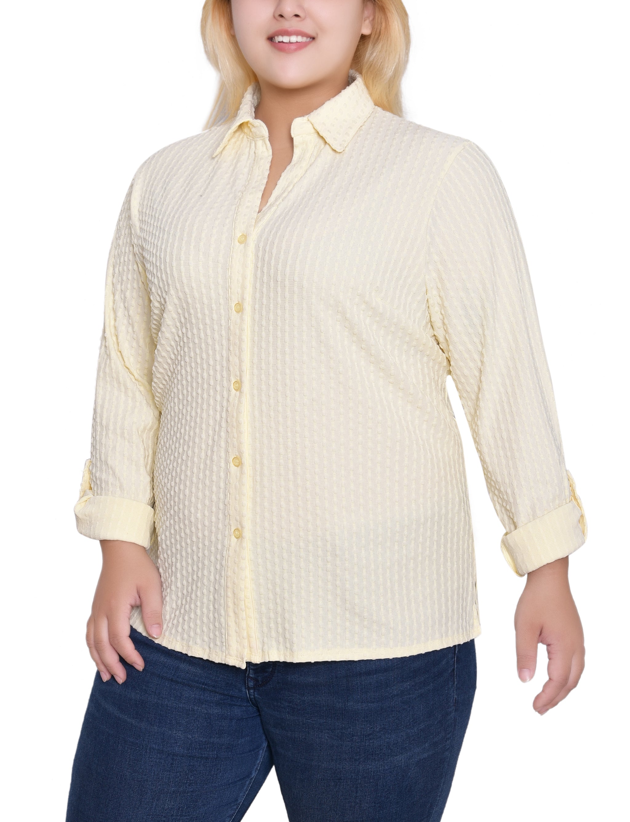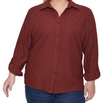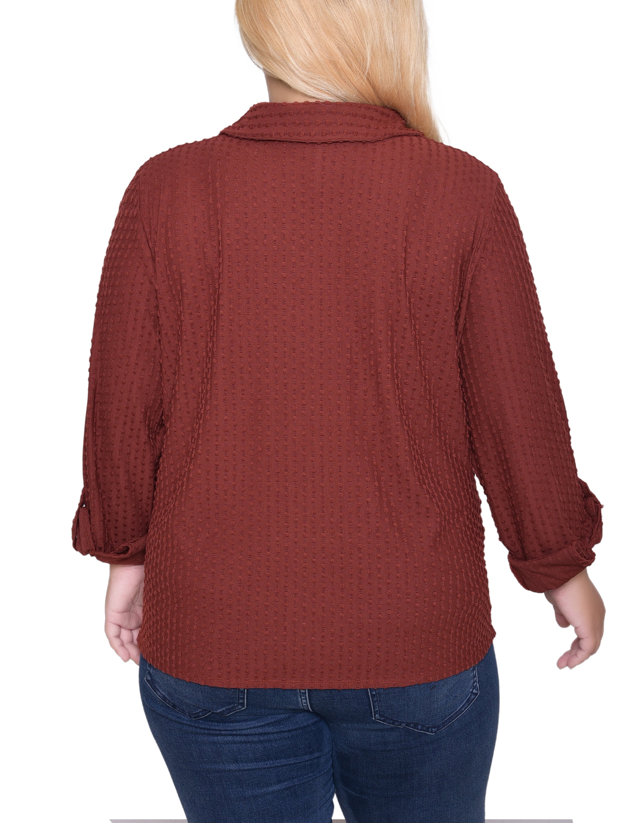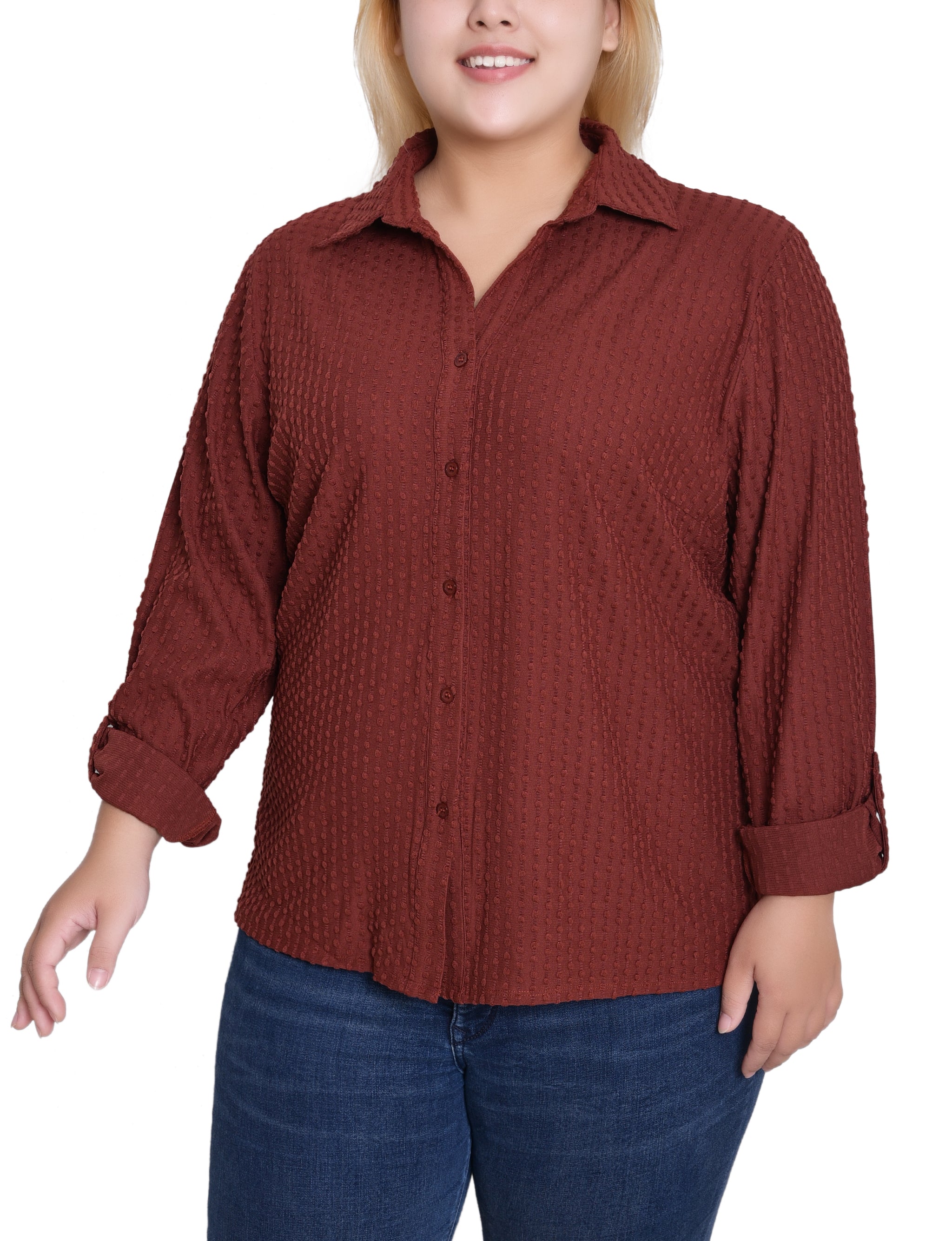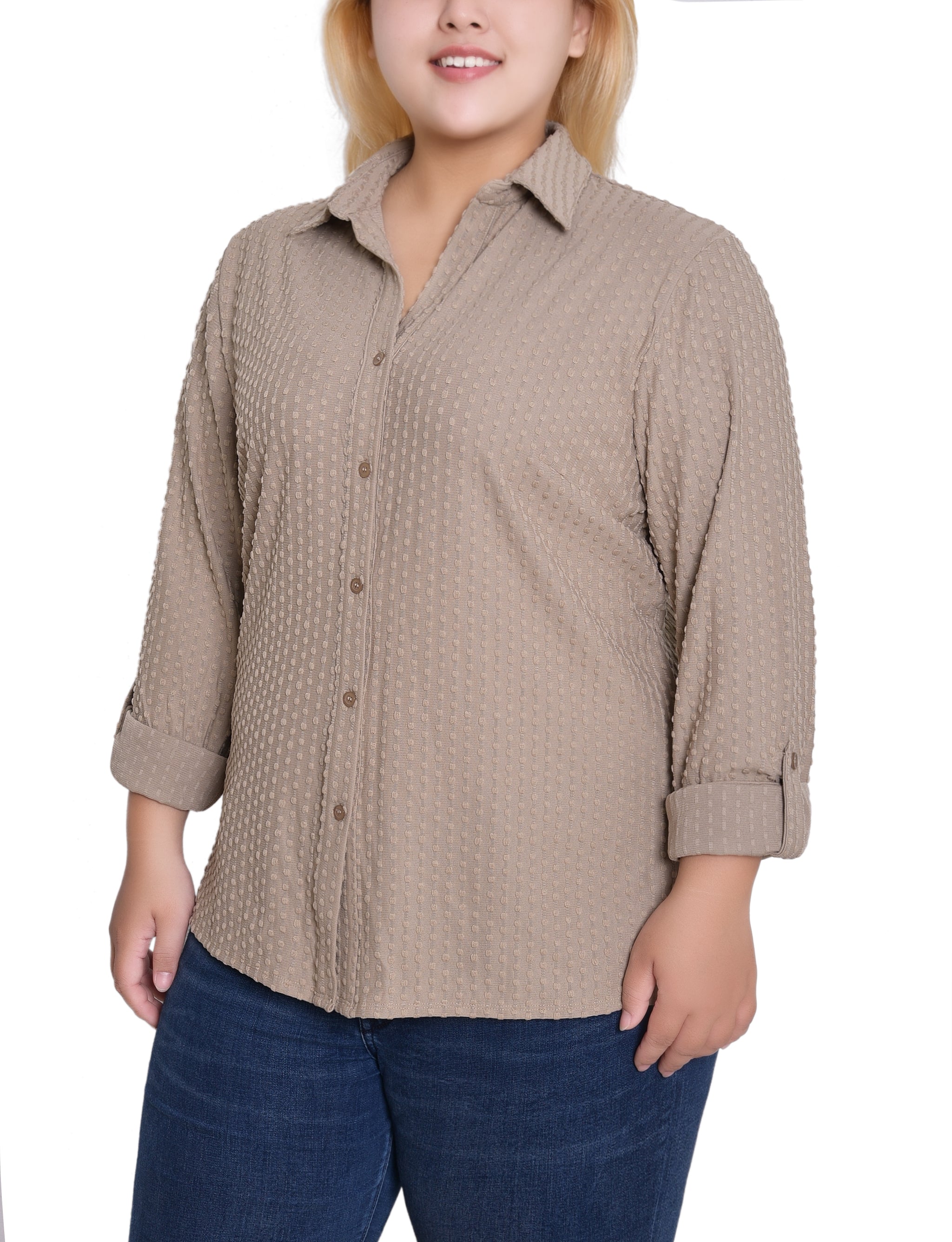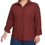 This textured knit top from NY Collection offers a classic button-down silhouette with a soft, stretch fabric that provides all-day comfort. Designed with long sleeves and a crisp collar, it’s perfect for both office wear and casual outings.