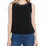 This sleeveless top offers effortless sophistication with its softly gathered neckline and relaxed silhouette. A delicate trim detail along the collar adds a touch of understated elegance, perfect for both work and weekend wear.