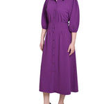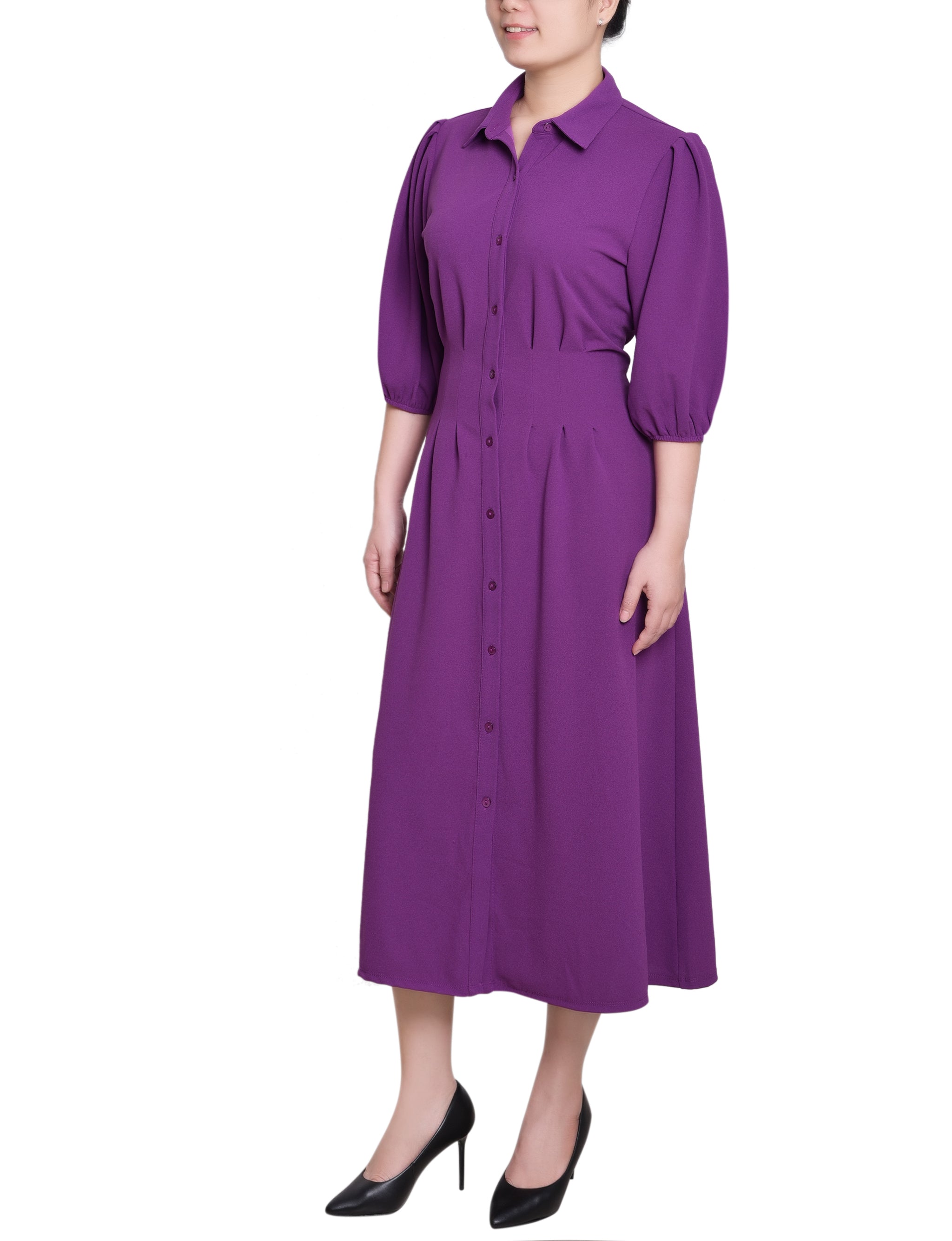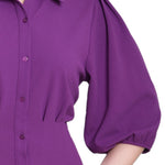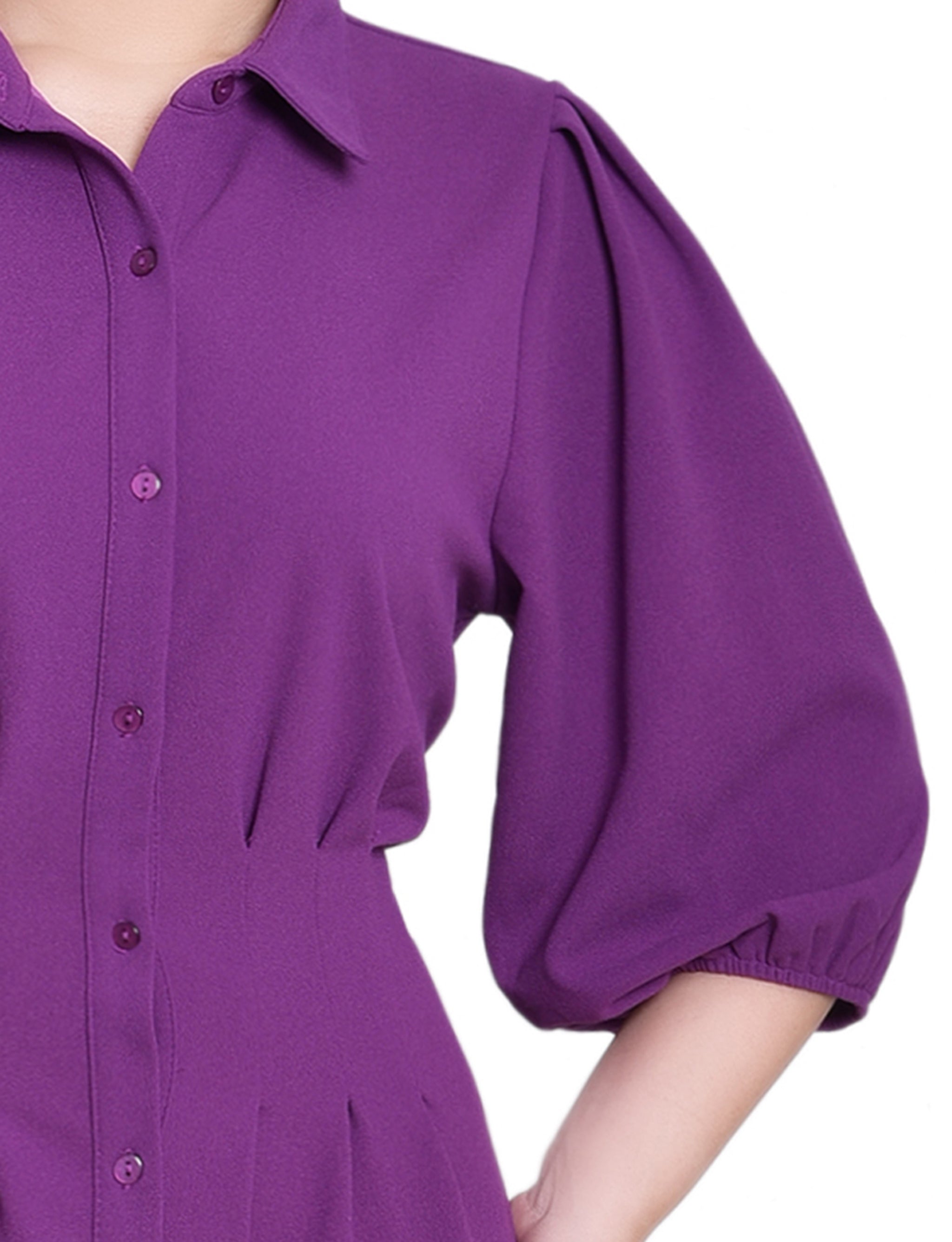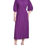 This midi shirt dress features elbow-length puff sleeves, a classic collar, and button-down front. Cinched waist offers a flattering silhouette.