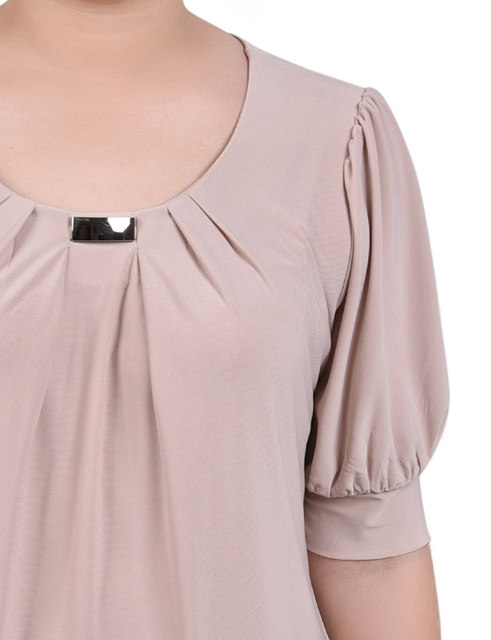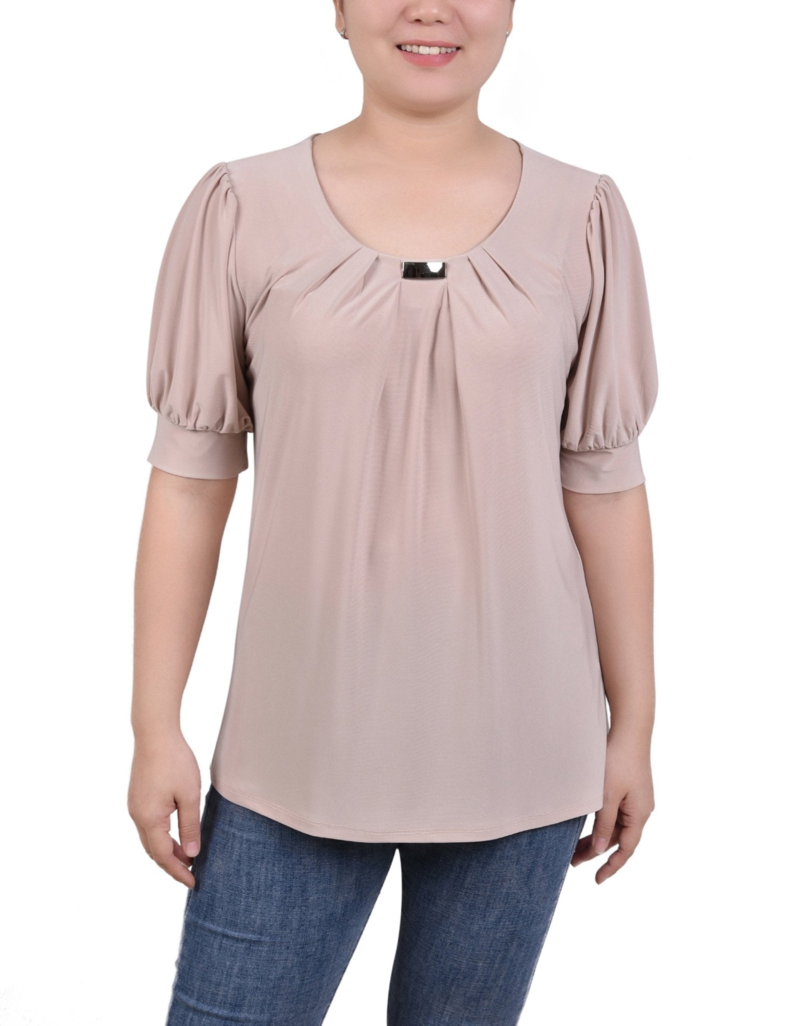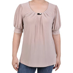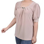 Add a little flair to your day with this puff sleeve knit top with wide cuffs and neck hardware. You can pair this top with your favorite jeans for a more casual look. You can pair it with a pair of dress pants or skirt for work. You can even dress it up for the evening! The fabric is a soft knit jersey and can be thrown into the washer and dryer for an easy-care piece that will last from season to season.