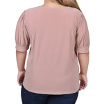 Add a little flair to your day with this puff sleeve knit top with wide cuffs and neck hardware. You can pair this top with your favorite jeans for a more casual look. You can pair it with a pair of dress pants or skirt for work. You can even dress it up for the evening! The fabric is a soft knit jersey and can be thrown into the washer and dryer for an easy-care piece that will last from season to season.