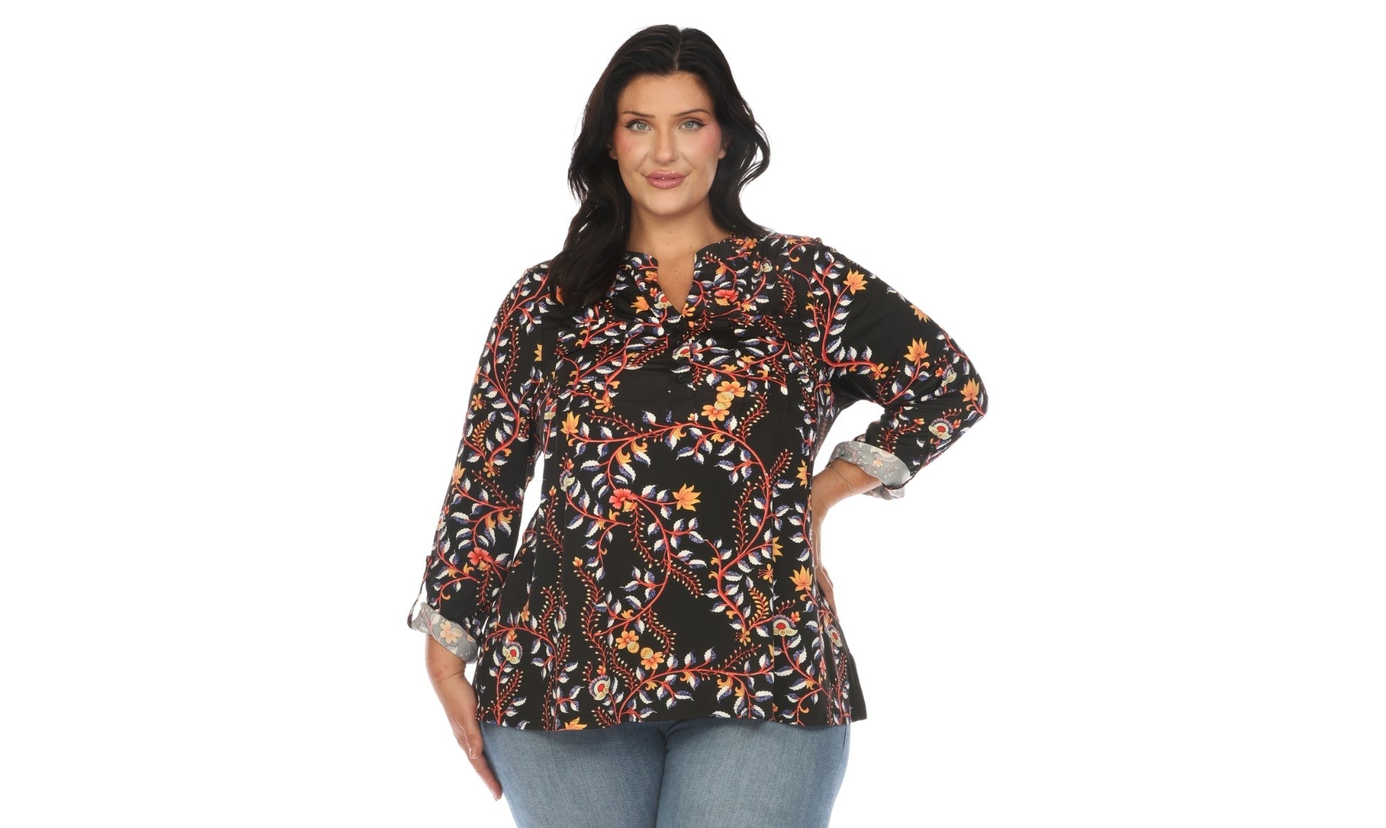 Step into classic elegance with this Paisley Button-Front Tunic Top. The sophisticated buttoned V-neckline offers a refined touch, while the relaxed fit ensures all-day comfort and a flattering drape. Designed with long sleeves that feature a roll-tab option, this tunic allows you to switch up your look with ease. The functional chest pockets add a hint of casual charm, and the timeless paisley pattern brings a touch of artistry and tradition. Pair this tunic with your favorite leggings or jeans for a polished yet comfortable outfit.