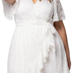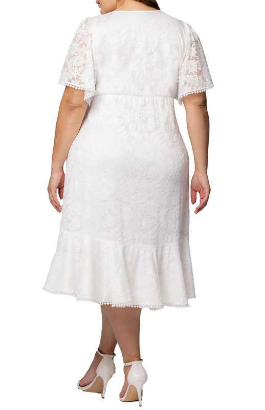 Turn heads in the Plus Size Palermo Lace Faux Wrap Cocktail Dress. Made from stretch lace, this dress features a flattering surplice V neckline, short flutter sleeves, and a waist-defining tie detail. The flowy midi skirt with flounce detailing adds graceful movement, while pom-pom trim on the sleeves and flounces adds a playful touch.