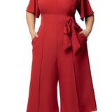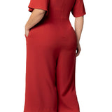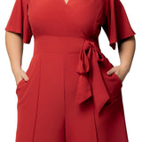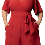 Step into effortless elegance with the Evelyn Cropped Wide Leg Jumpsuit. Designed to flatter your curves, this plus size jumpsuit features a surplice V neckline, a wide waistband with tie detailing, and short flutter sleeves. The cropped wide-leg pants, complete with pockets and a pin tuck down the front, offer a tailored yet relaxed fit.