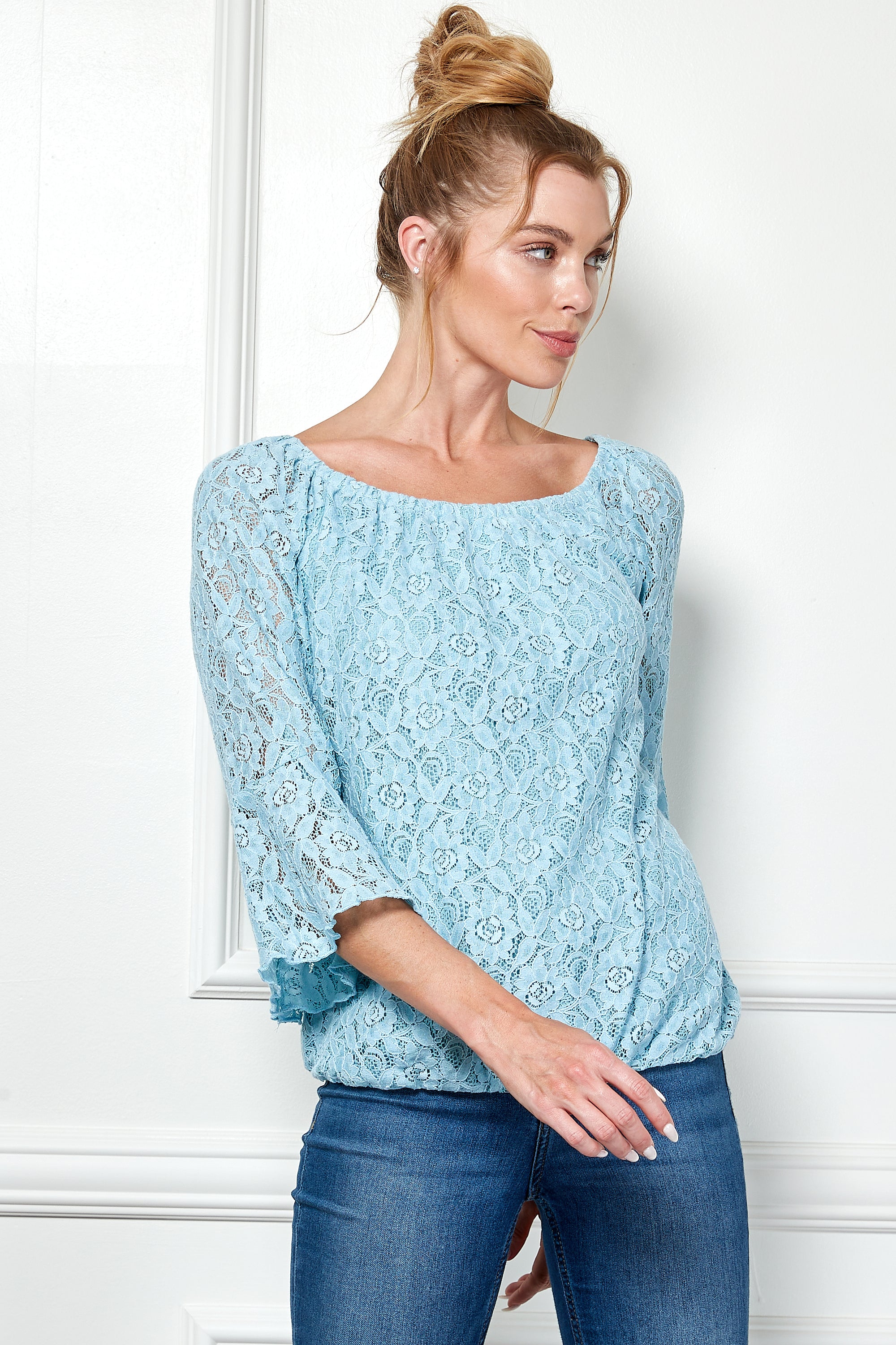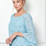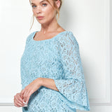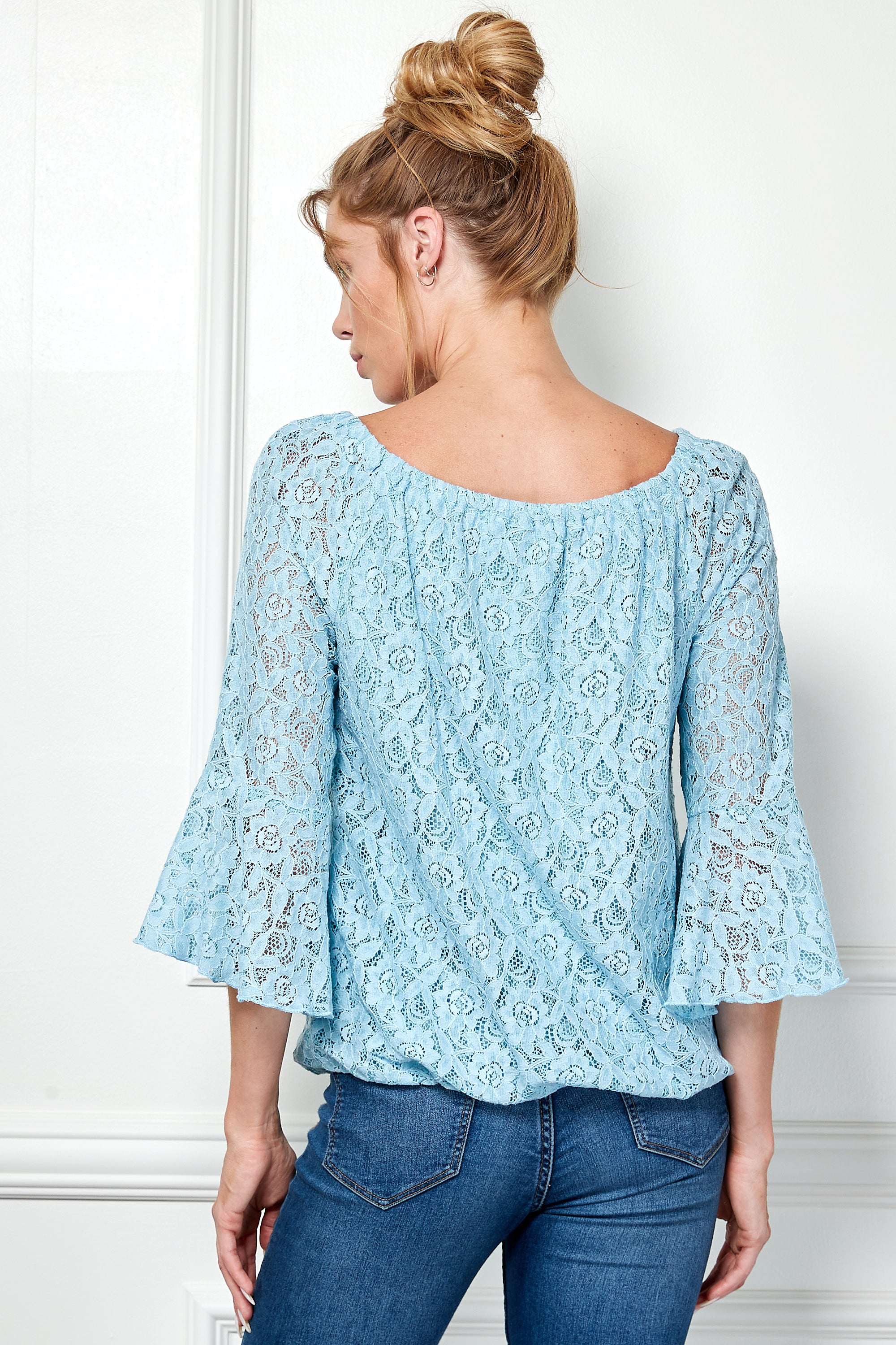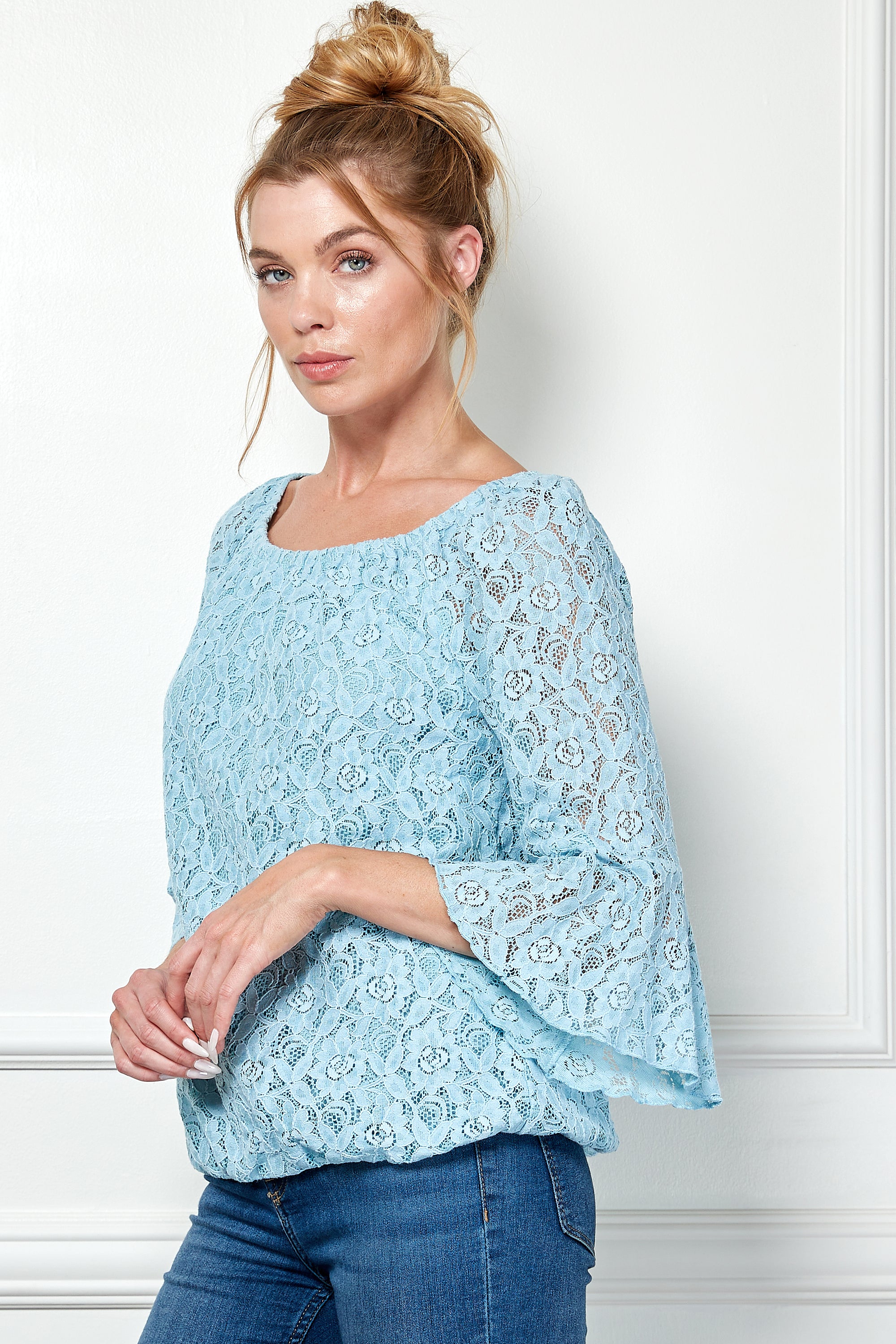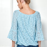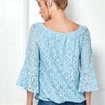 3/4 Ruffle Sleeve Pleat Boat Neck Lined Bubble Blouse in Solid Cotton/Nylon Lace in a calming pastel color that can be worn at work or a night out in town.