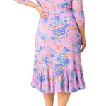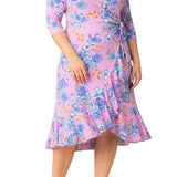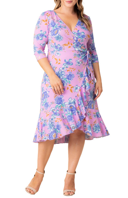 The Flirty Flounce Midi Wrap Dress features cascading flounces on the skirt and bottom hem. This functional wrap provides adjustable coverage and flattering 3/4 length sleeves. Perfect for cocktail and special occasions, work, and as a wedding guest dress.
