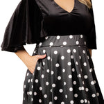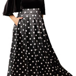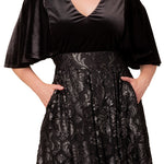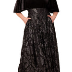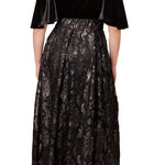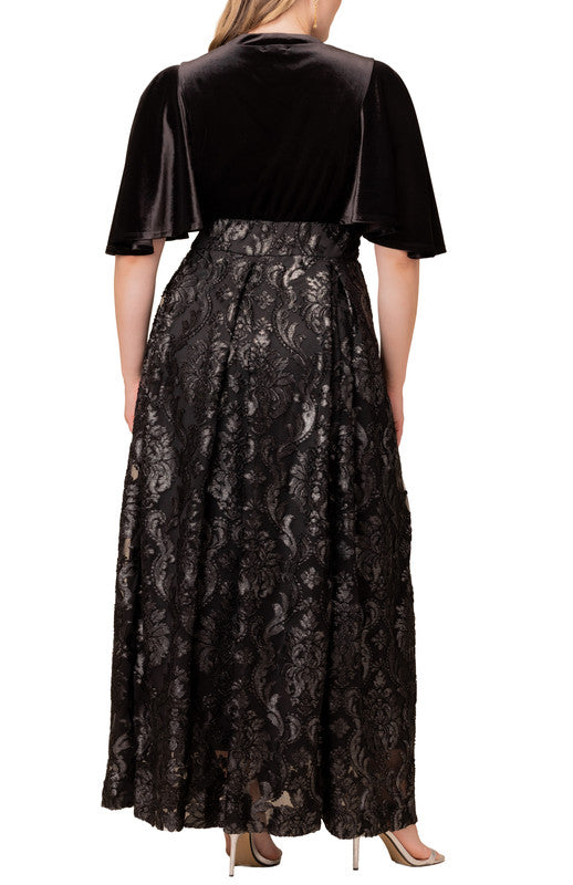 Make a grand entrance at your next soiree in the Radiant Opulence Evening Gown. This special occasion gown features a velvet bodice with a V neckline, mandarin collar, and dramatic sleeves. The floor-length pleated skirt is adorned with a gold metallic floral design.