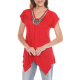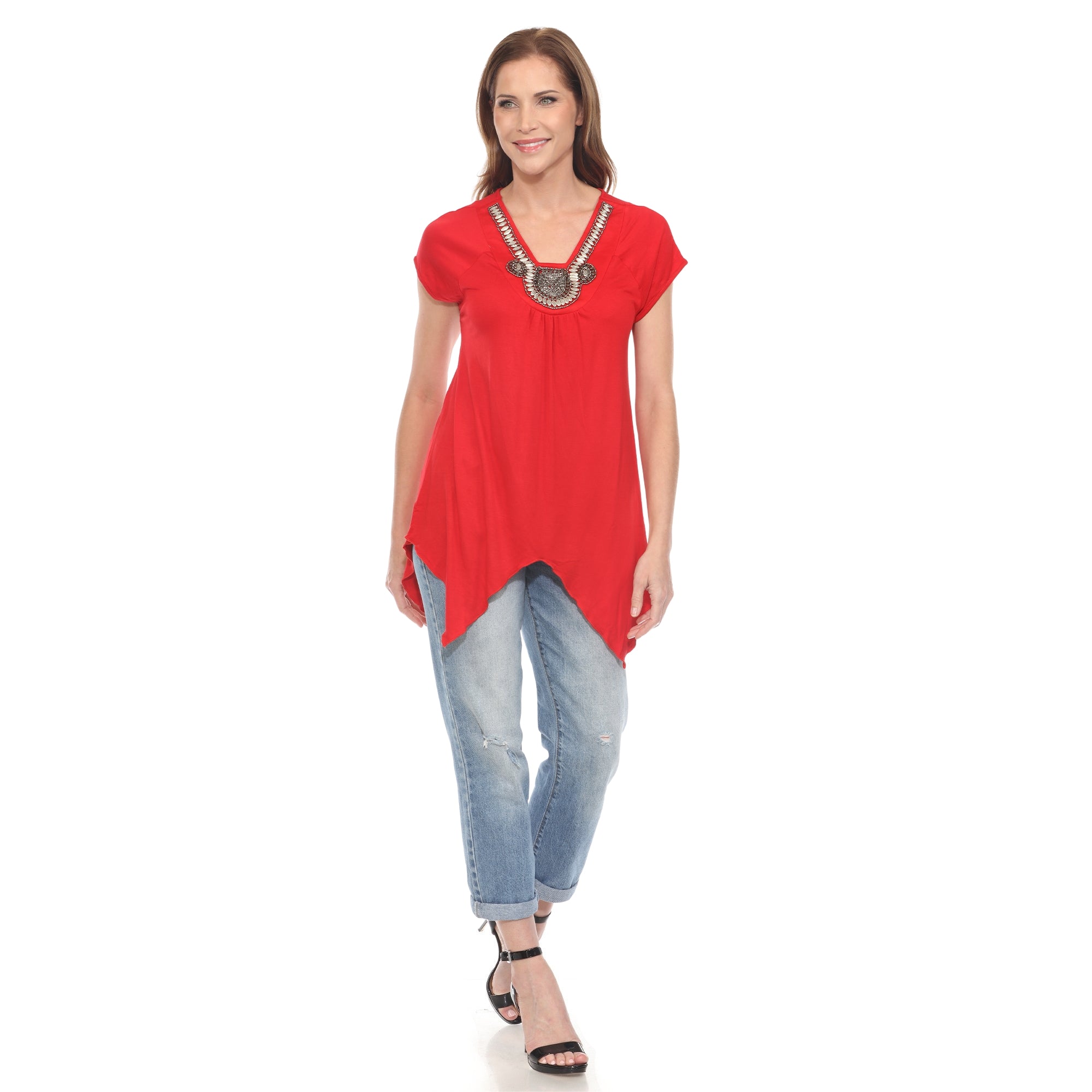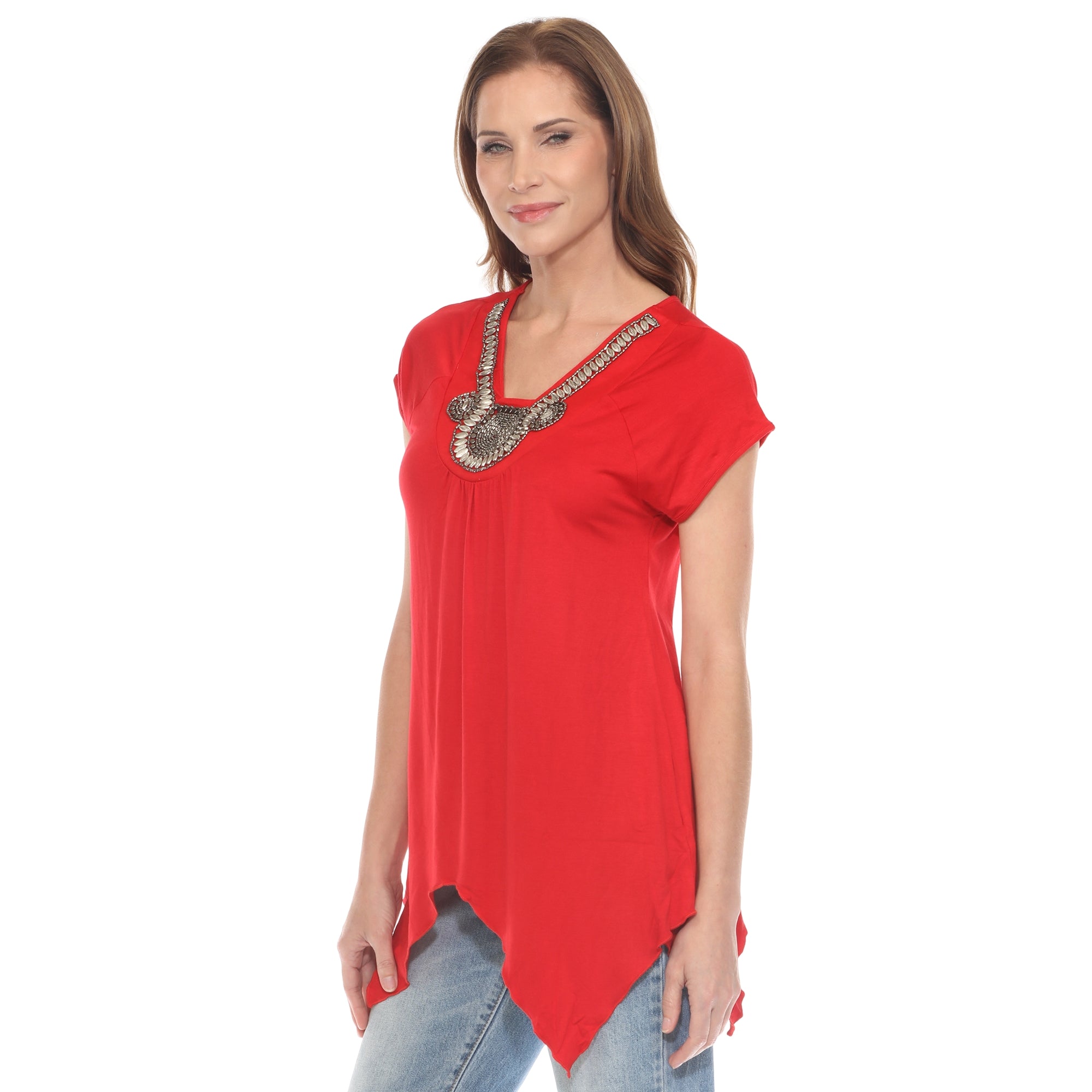 Designed to make a subtle statement, this knit top features a beautifully detailed beaded neckline that adds interest without extra styling. The soft fabric drapes effortlessly, while the angled hem creates a flattering silhouette with a touch of movement. Pair it with denim or leggings for a look that’s both relaxed and pulled-together—an easy option for day-to-night dressing.