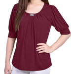 Add a little flair to your day with this puff sleeve knit top with wide cuffs and neck hardware. You can pair this top with your favorite jeans for a more casual look. You can pair it with a pair of dress pants or skirt for work. You can even dress it up for the evening! The fabric is a soft knit jersey and can be thrown into the washer and dryer for an easy-care piece that will last from season to season.