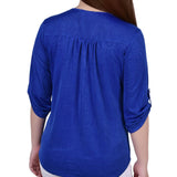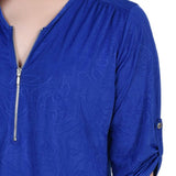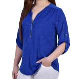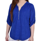 Dress it up or down. This zip front knit jacquard blouse can be worn to the office or while out with friends.