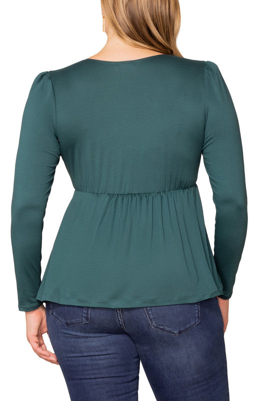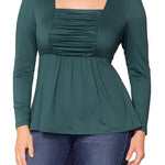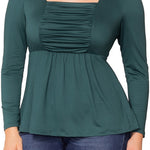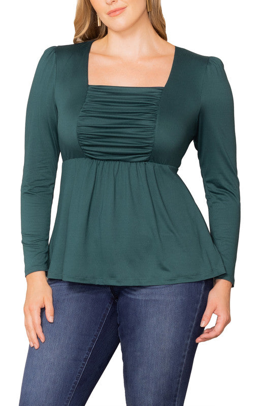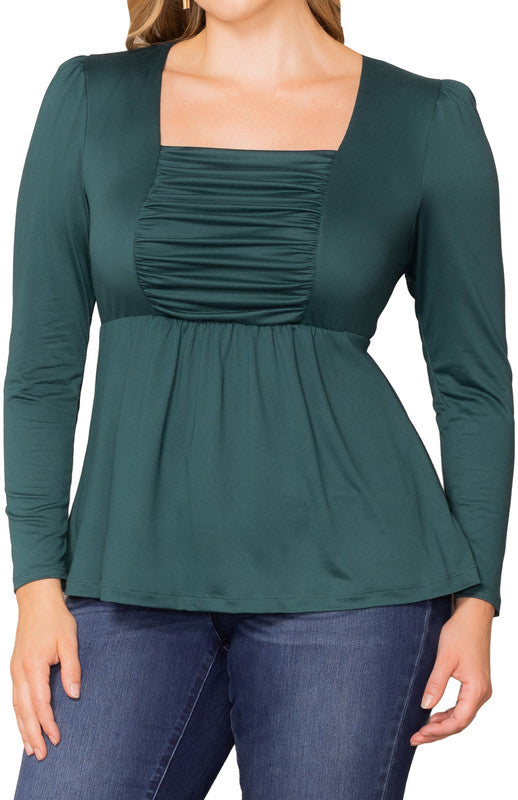 Sophistication meets comfort in the effortlessly flattering Rylan Long Sleeve Ruched Top. This plus size blouse features a structured square neckline framed by princess seams and a softly ruched bodice that enhances your curves with ease. An elasticized waist defines your shape without sacrificing comfort, while the flowy peplum hem adds graceful movement.