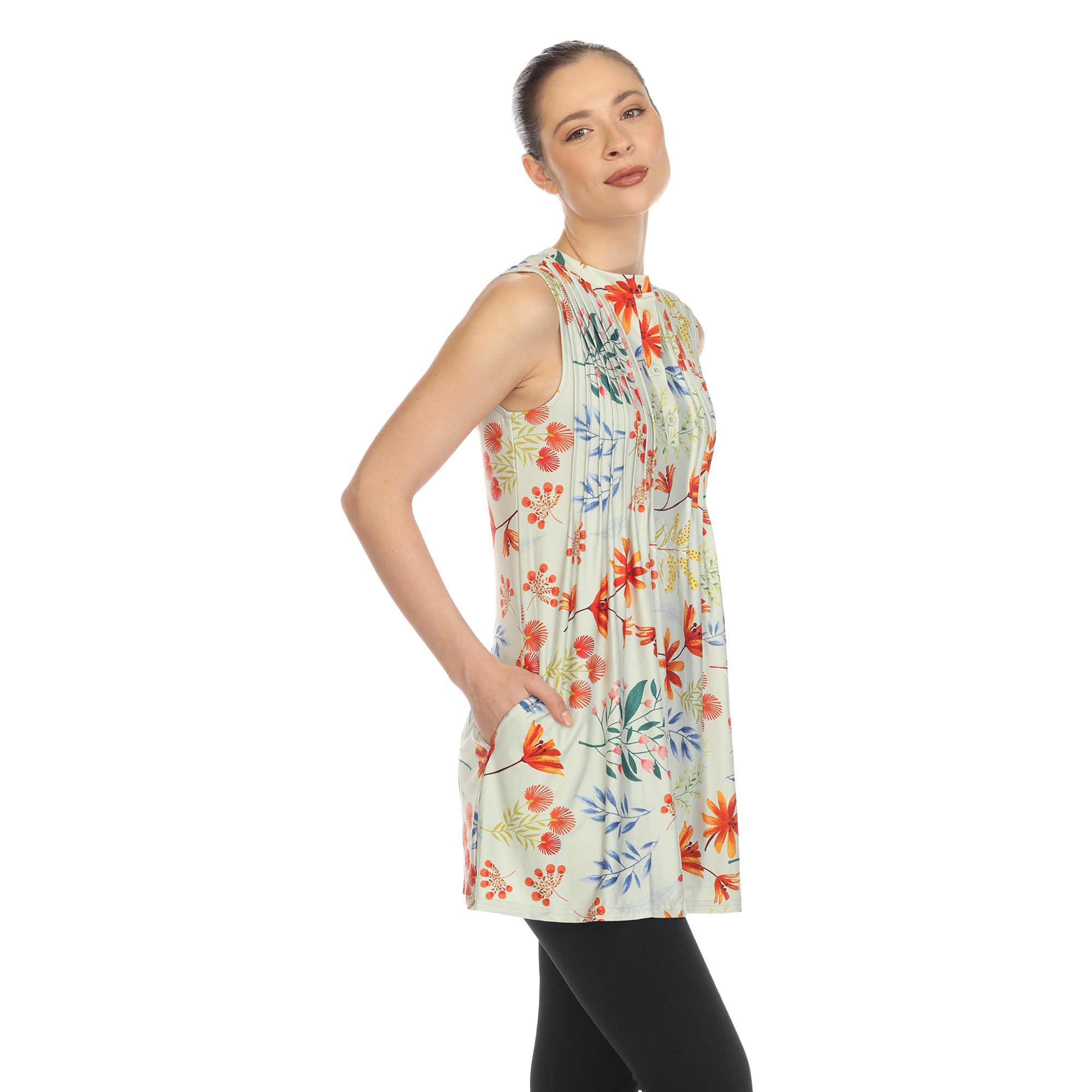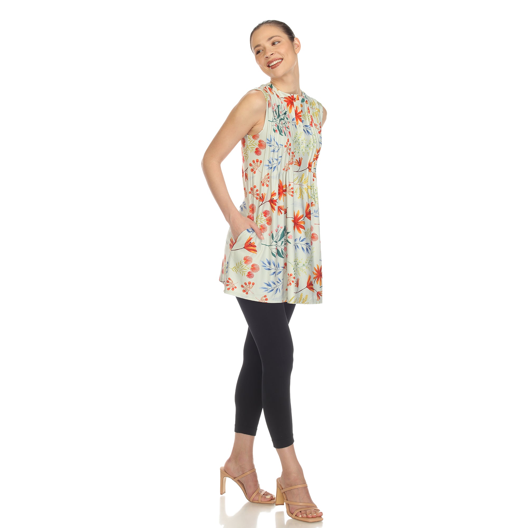 Style up your everyday look with this Tunic Top from White Mark with floral prints inspired by small wildflowers on the fields subtly waving on an easy and light summer breeze. This cool and comfortable top features a pin-tuck pleated front, shirt tail hem and side pockets for ultimate comfort.