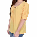 Add a little flair to your day with this puff sleeve knit top with wide cuffs and neck hardware. You can pair this top with your favorite jeans for a more casual look. You can pair it with a pair of dress pants or skirt for work. You can even dress it up for the evening! The fabric is a soft knit jersey and can be thrown into the washer and dryer for an easy-care piece that will last from season to season.