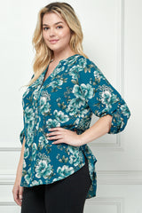 Sara Michelle 3/4 Sleeve Mandarin Collar Henley Placket Shirt Tail Popover - PLUS
