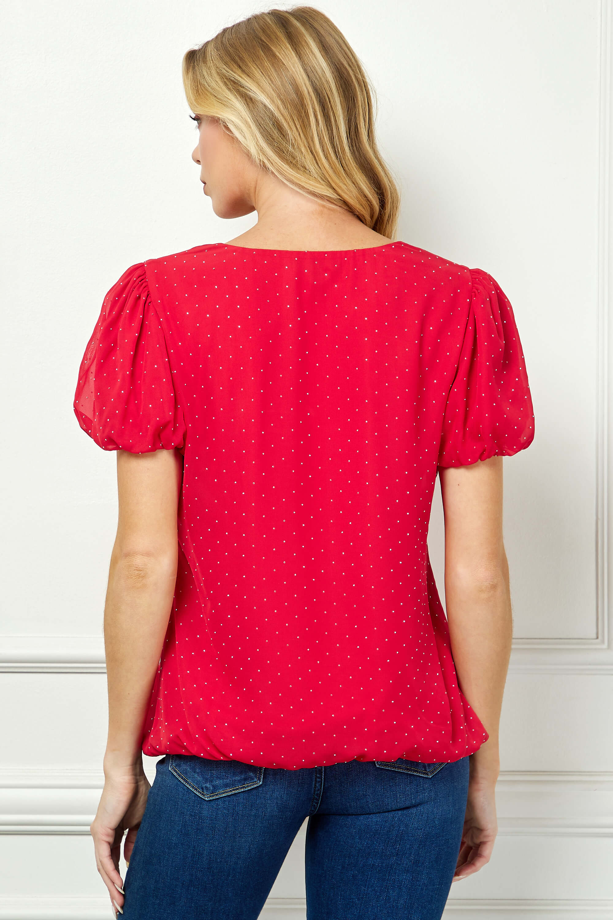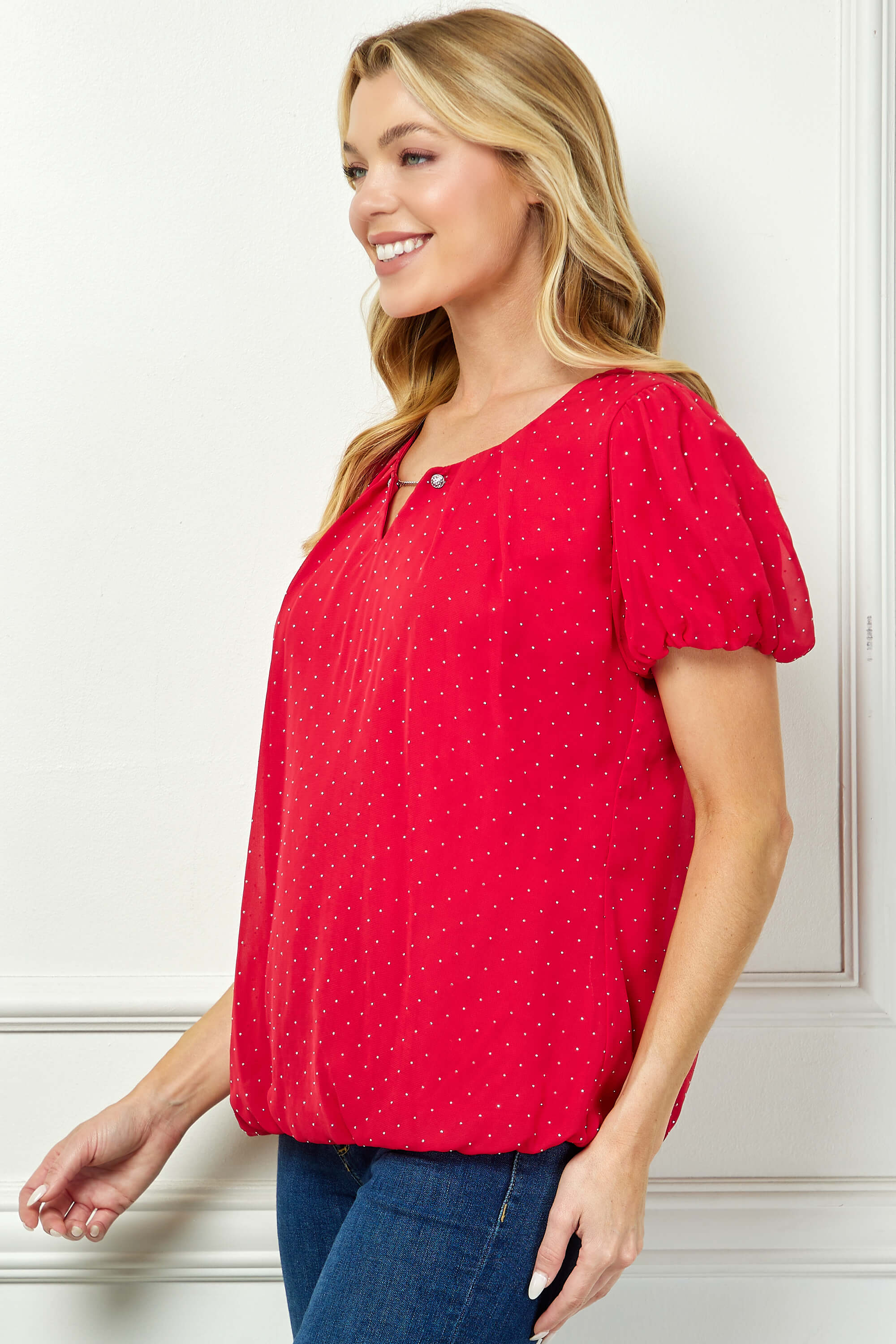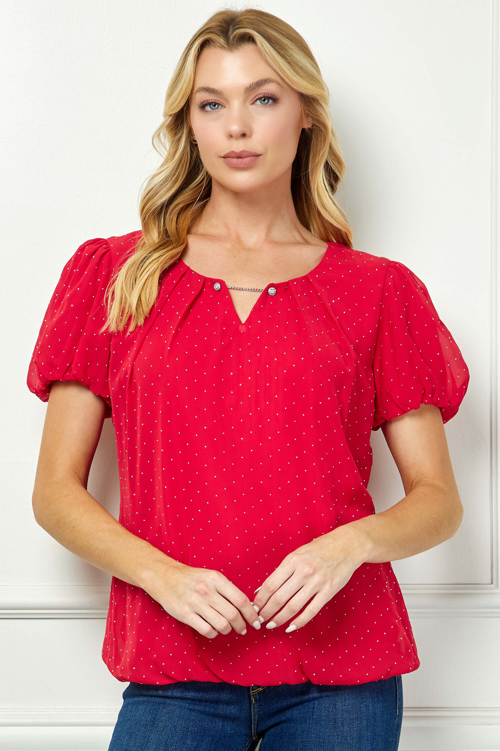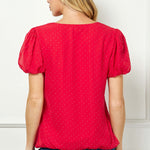 Short Puff Sleeve Cutout Neck Bubble Blouse in Red