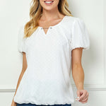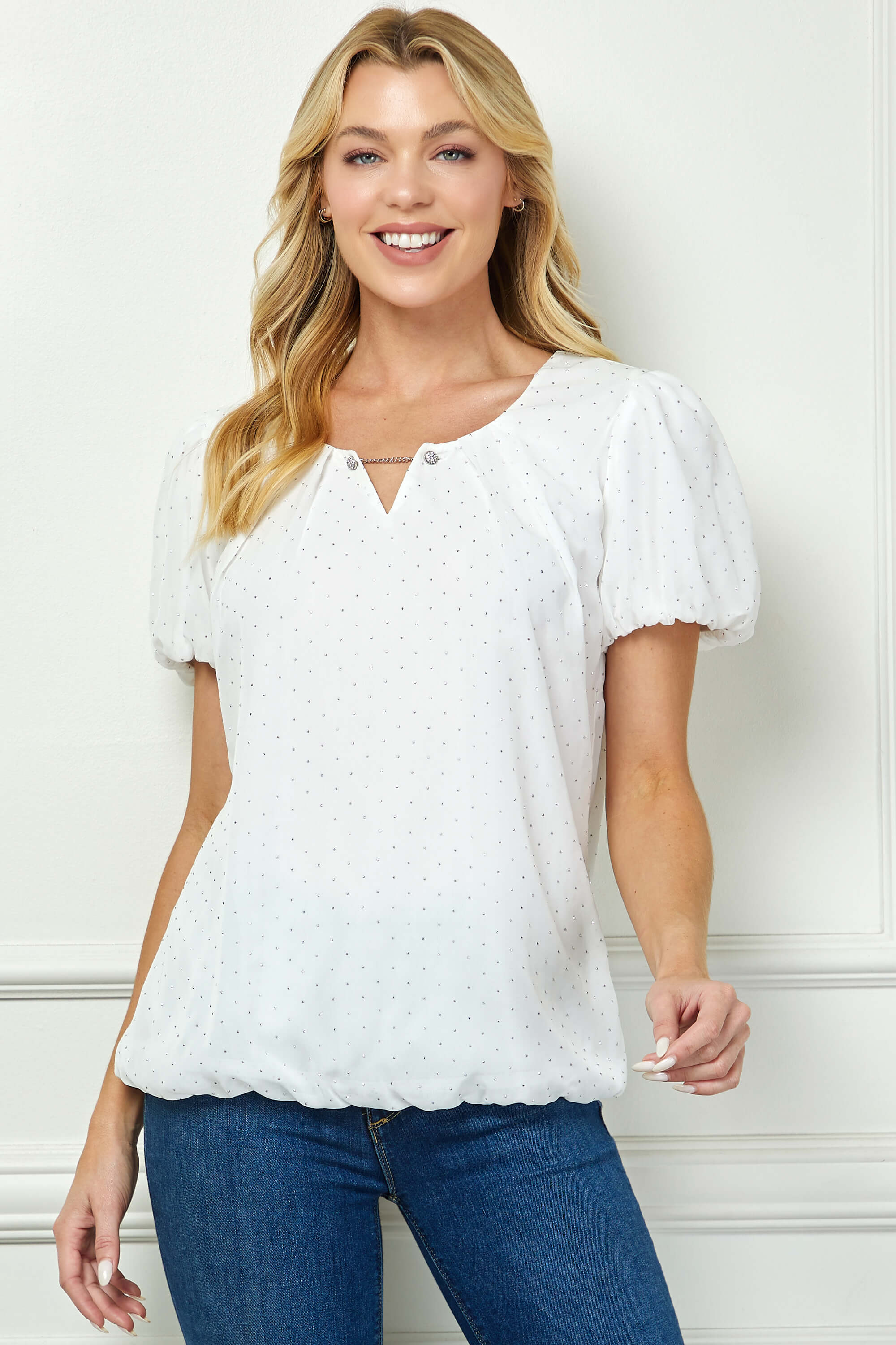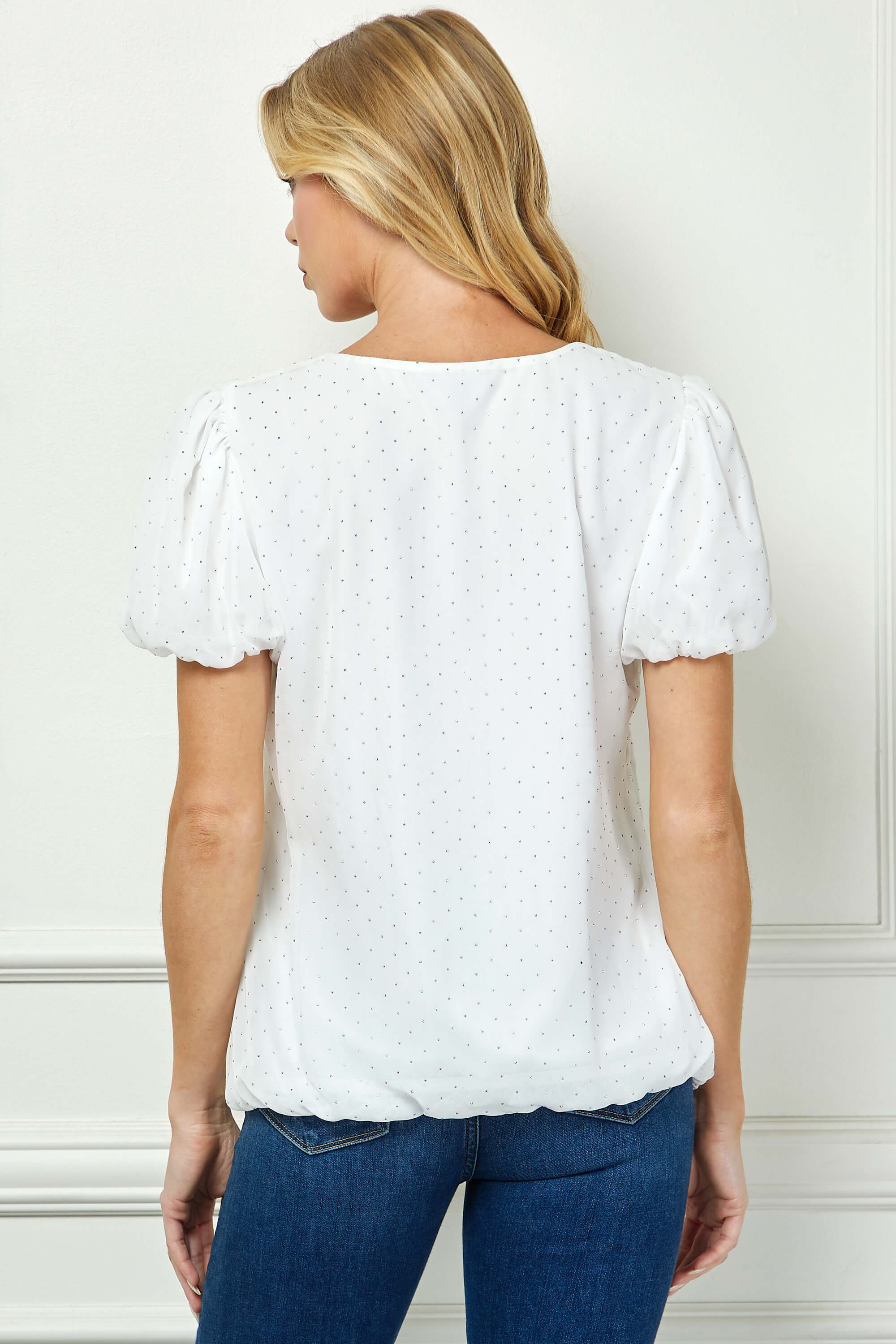 Short Puff Sleeve Cutout Neck Bubble Blouse in White