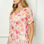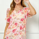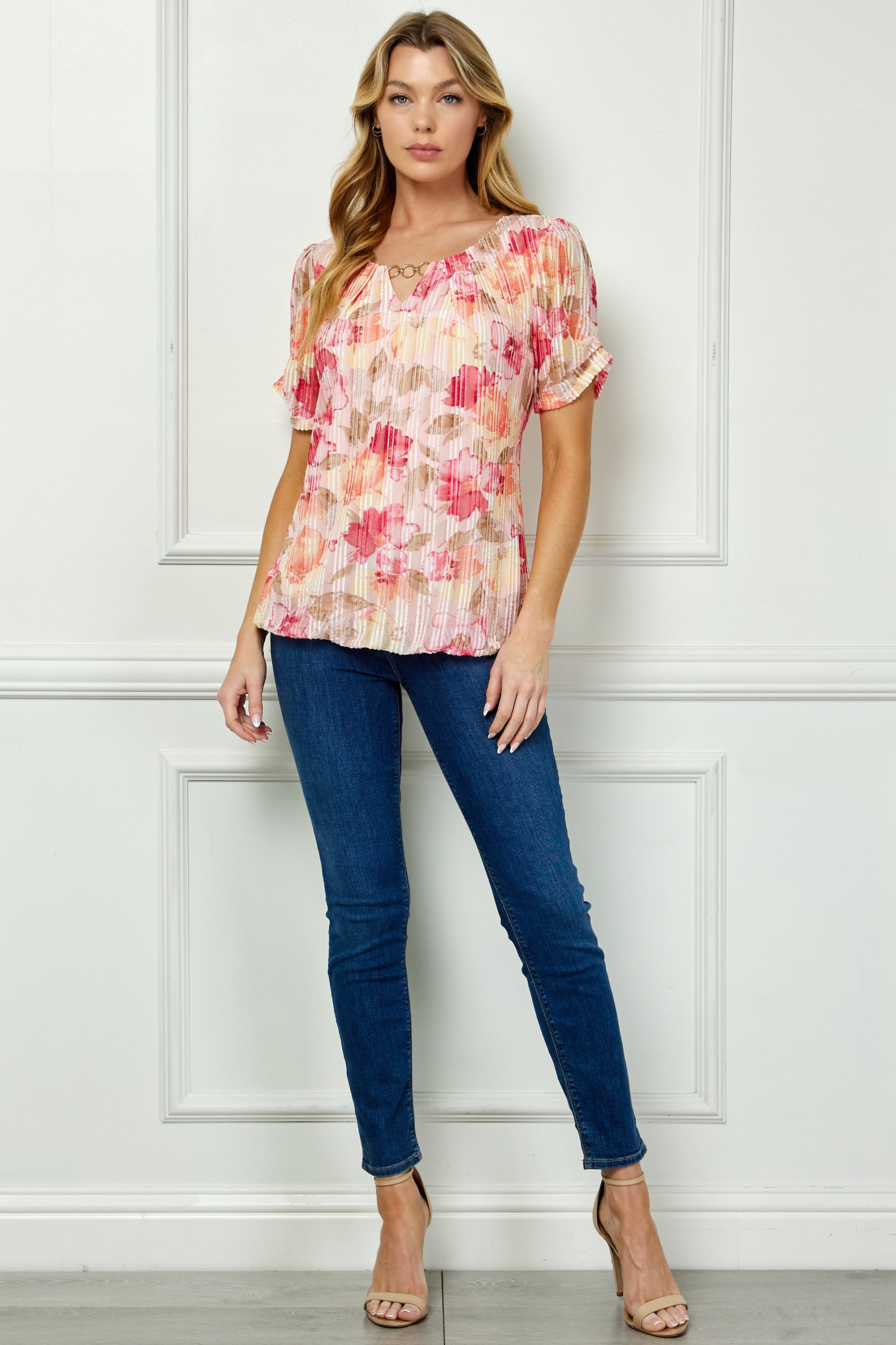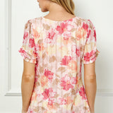 Short Step Sleeve Cutout Trim Front Neck Lined Bubble Blouse in Print Cord Stripe Mesh, perfect for Easter Sunday to Summer Bliss for Day or Night Blouse