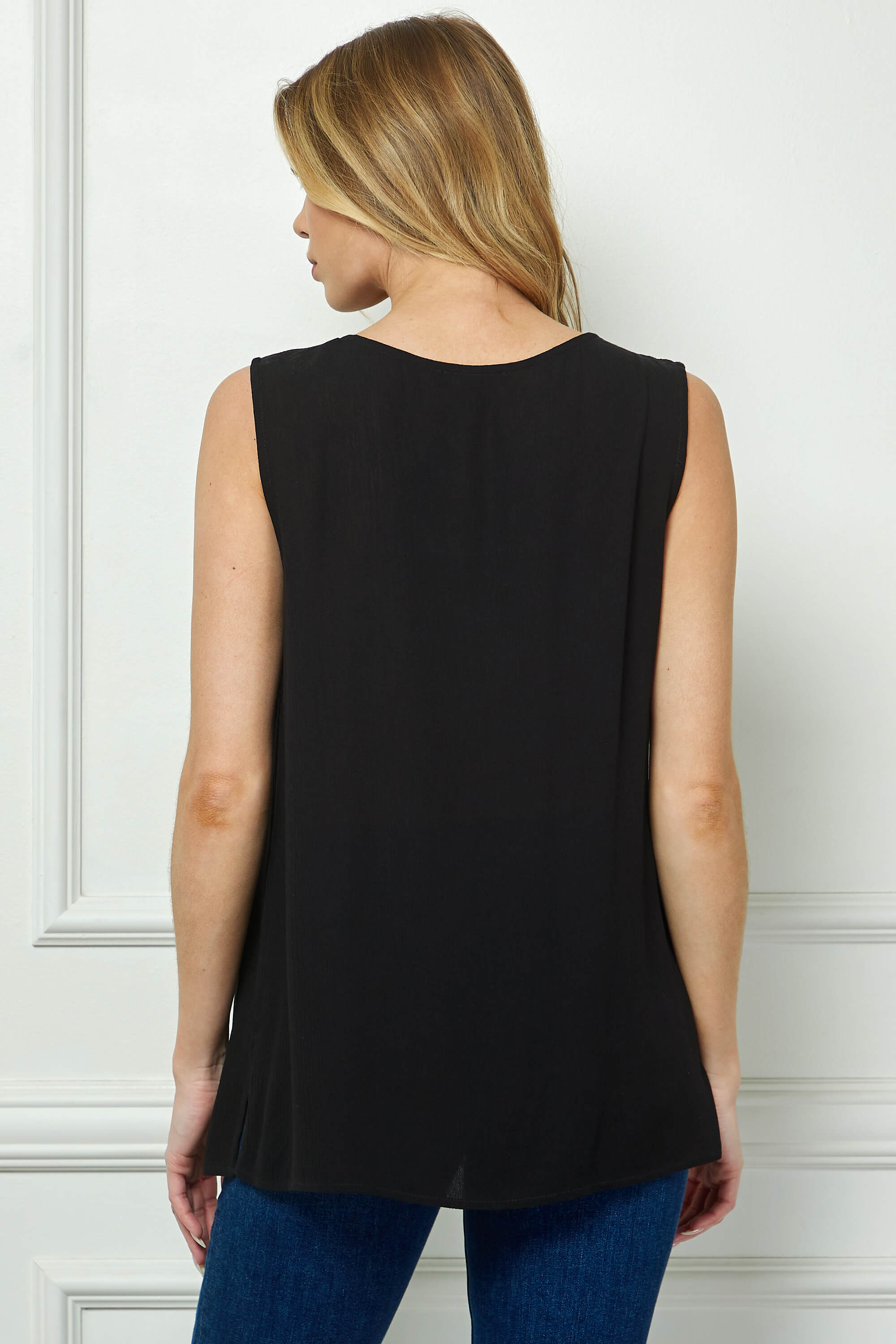 Sleeveless Embroidered Yoke Split Neck Blouse in Black