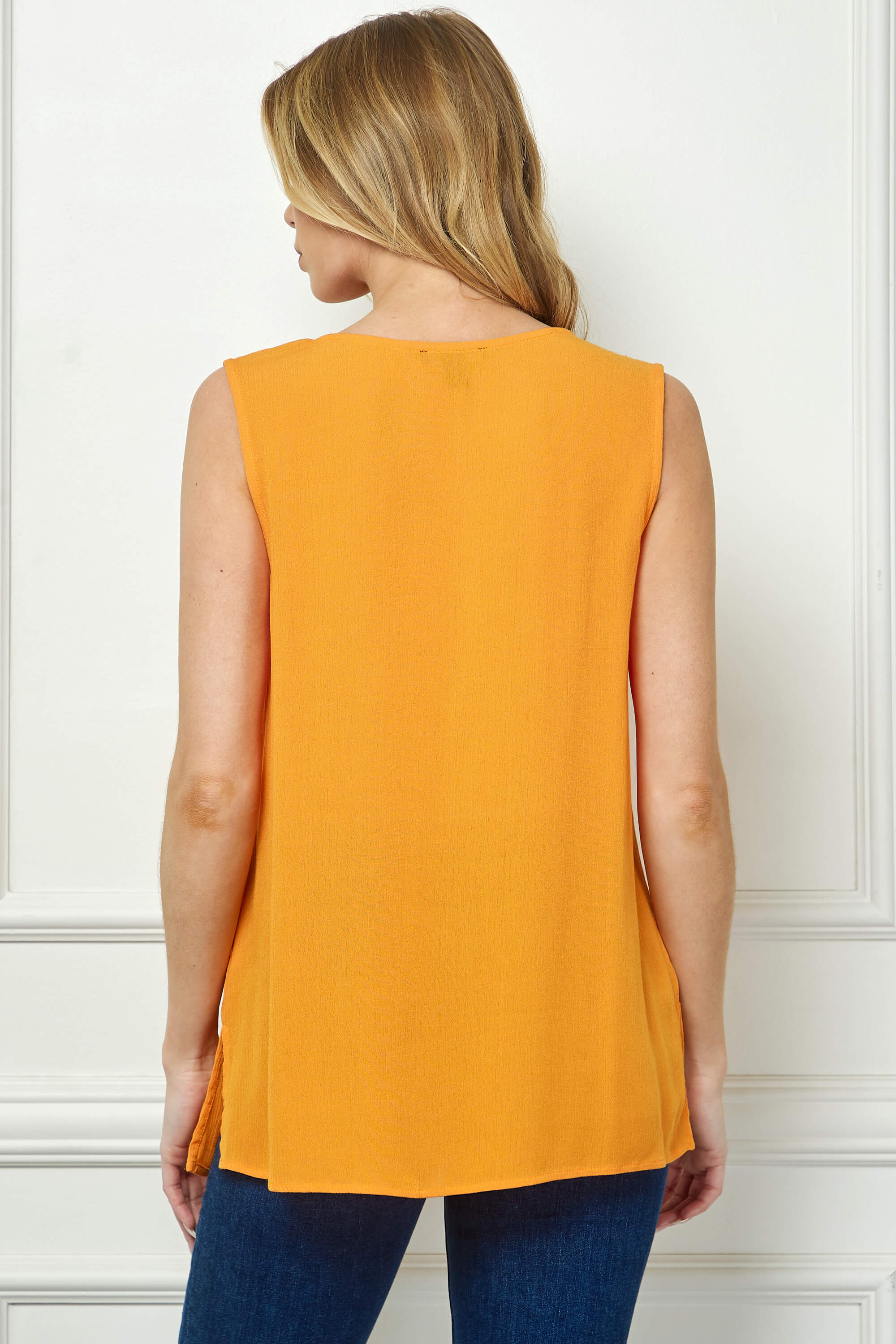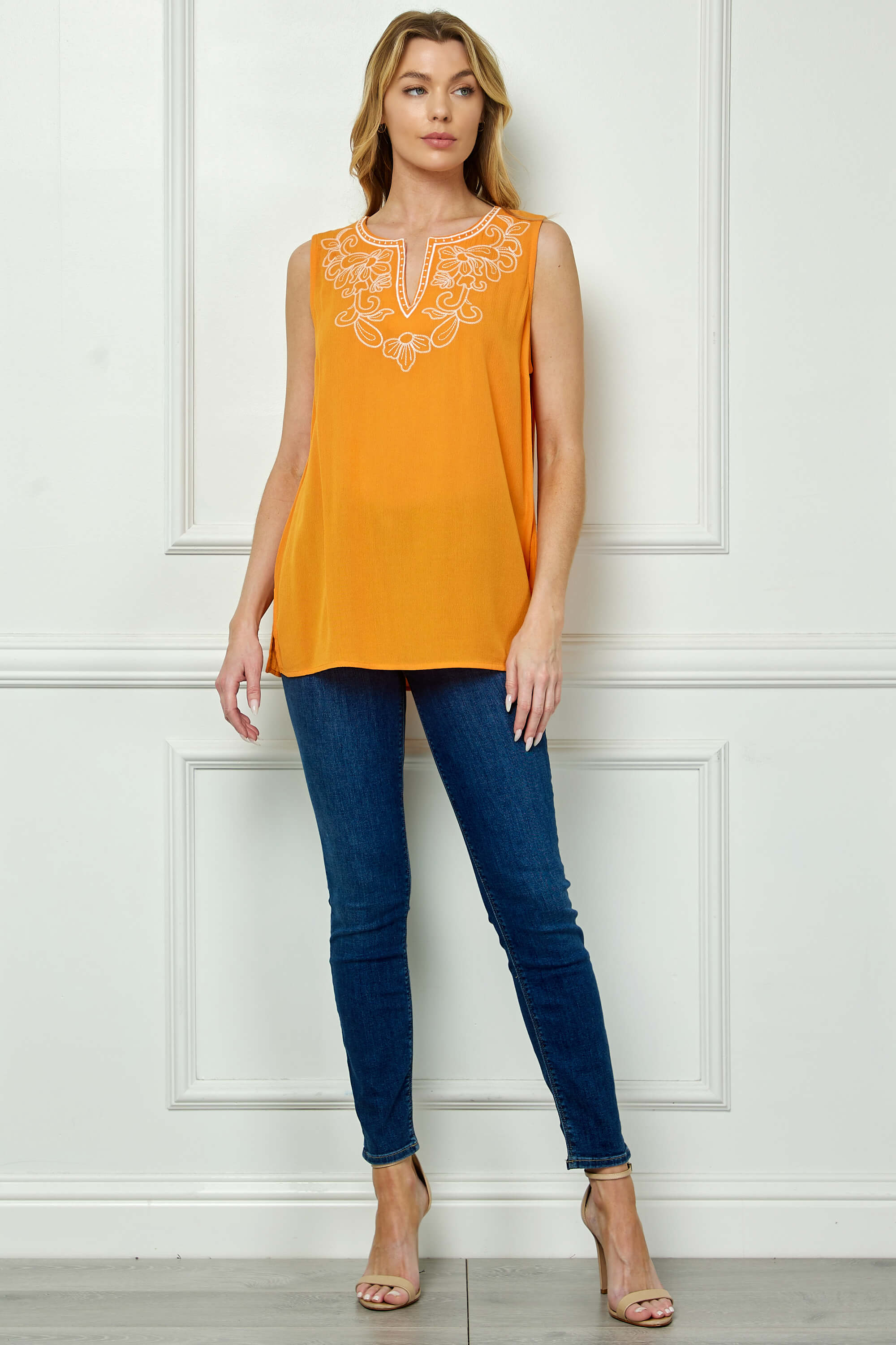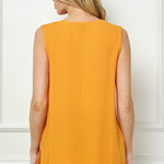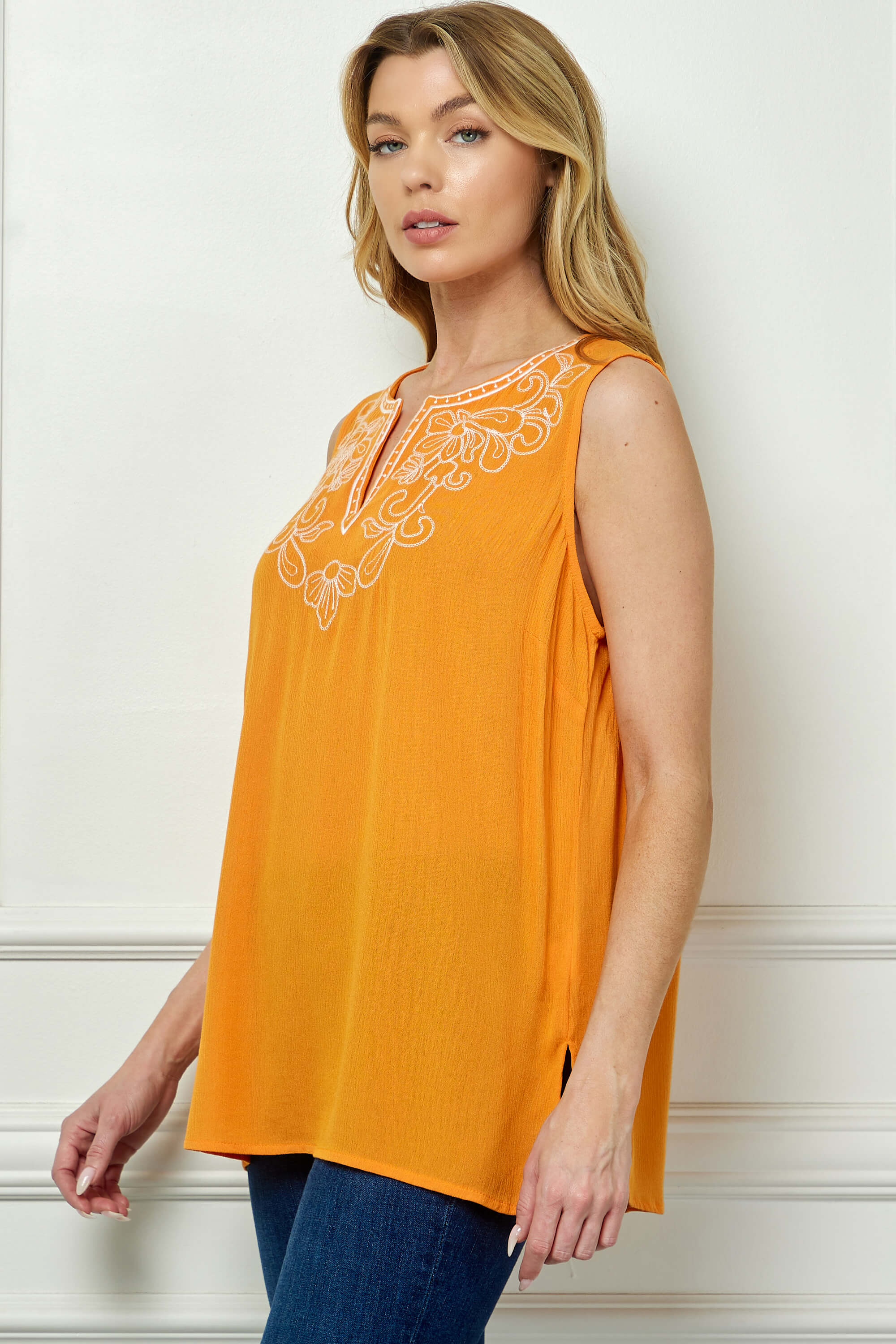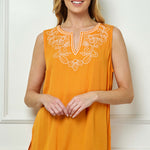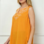 Sleeveless Embroidered Yoke Split Neck Blouse in Orange