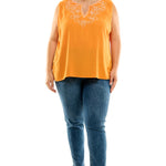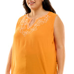 Sleeveless Embroidered Yoke Split Neck Blouse in Orange - Plus