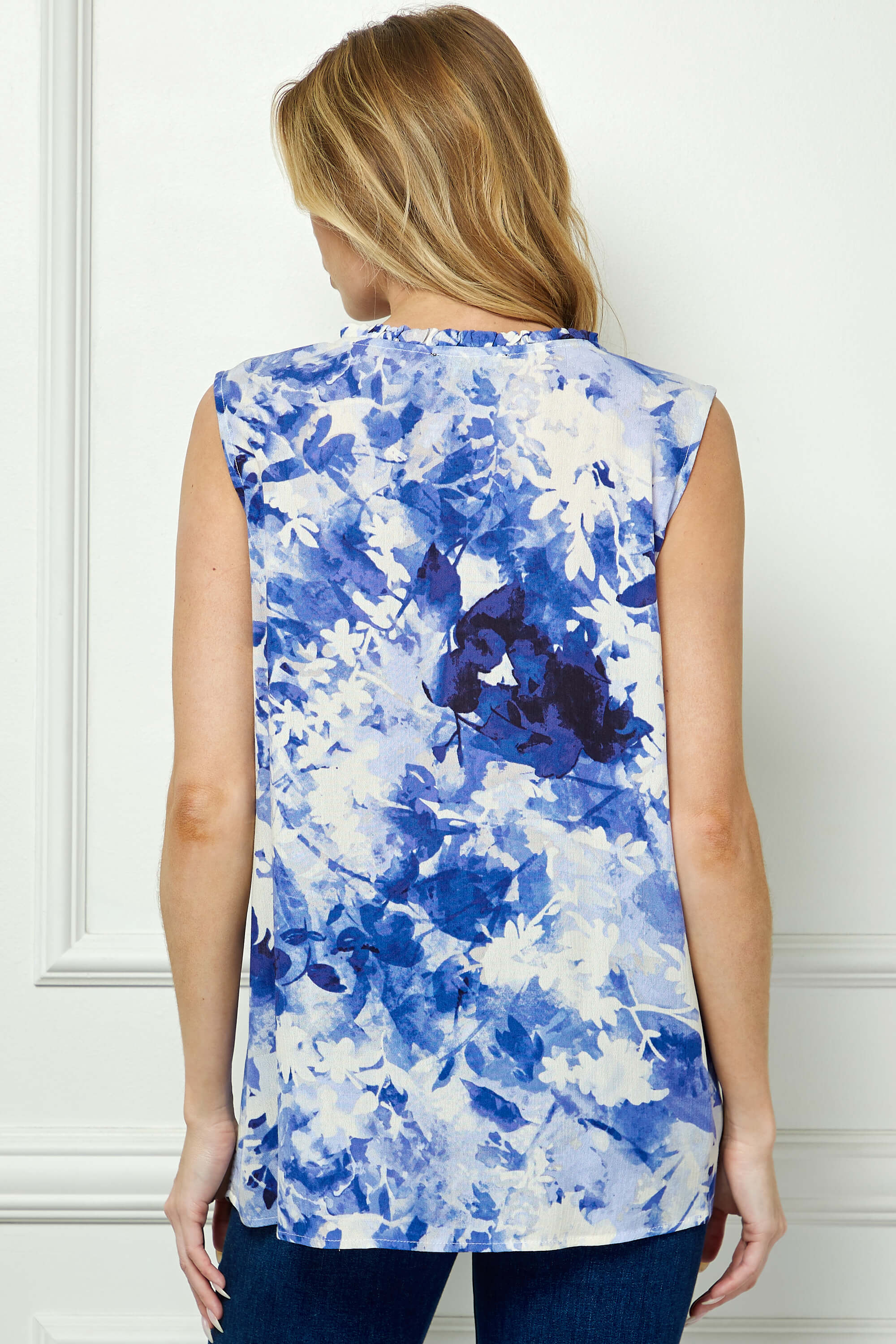 The sleeveless silhouette keeps the look airy and versatile, making it perfect for warm days or easy layering under jackets and cardigans. With a relaxed fit that drapes naturally, this piece pairs seamlessly with denim, skirts, or tailored bottoms for both casual and elevated styling.