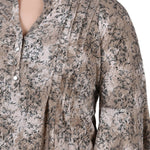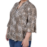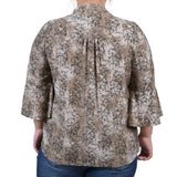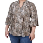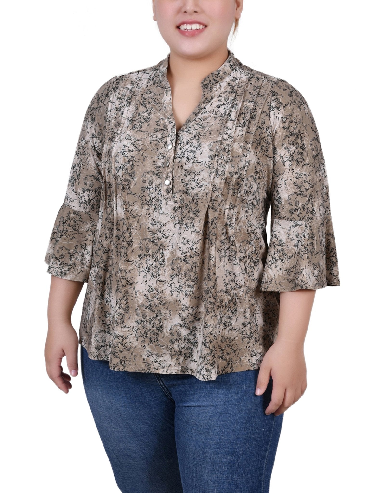 Taupe Etch 3/4 Bell Sleeve Pleat Front Y Neck Top - Plus